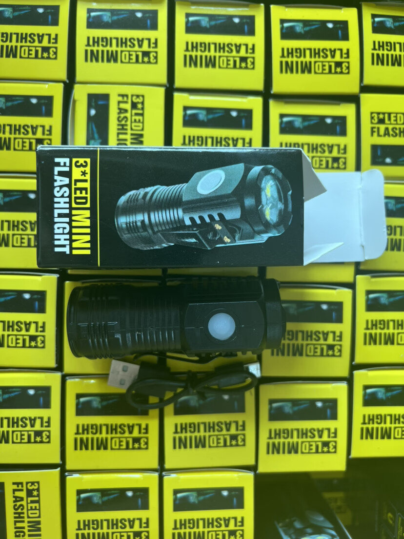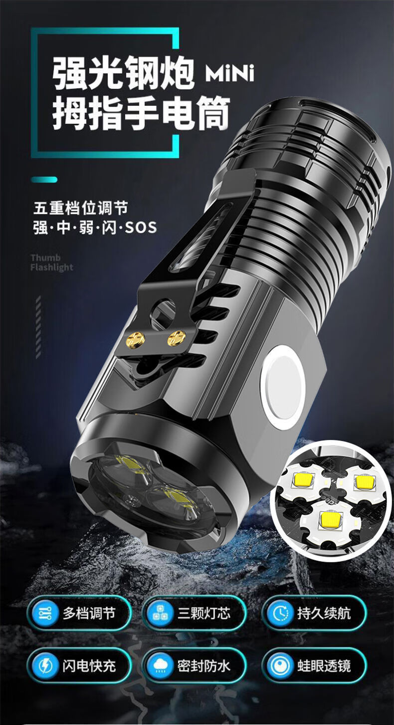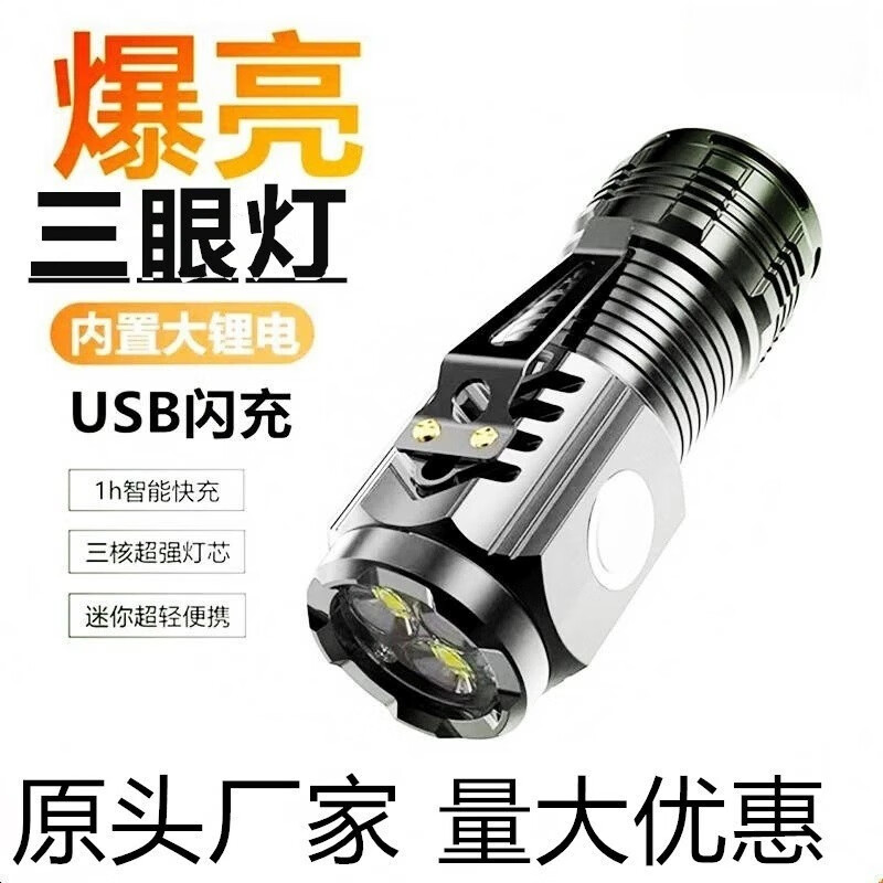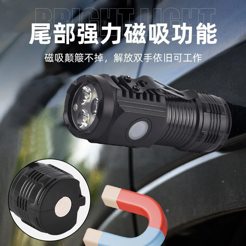 手电筒三眼灯爆亮手电筒便携强光手电筒多功能带磁铁充电照明装备 电镀黑带磁铁