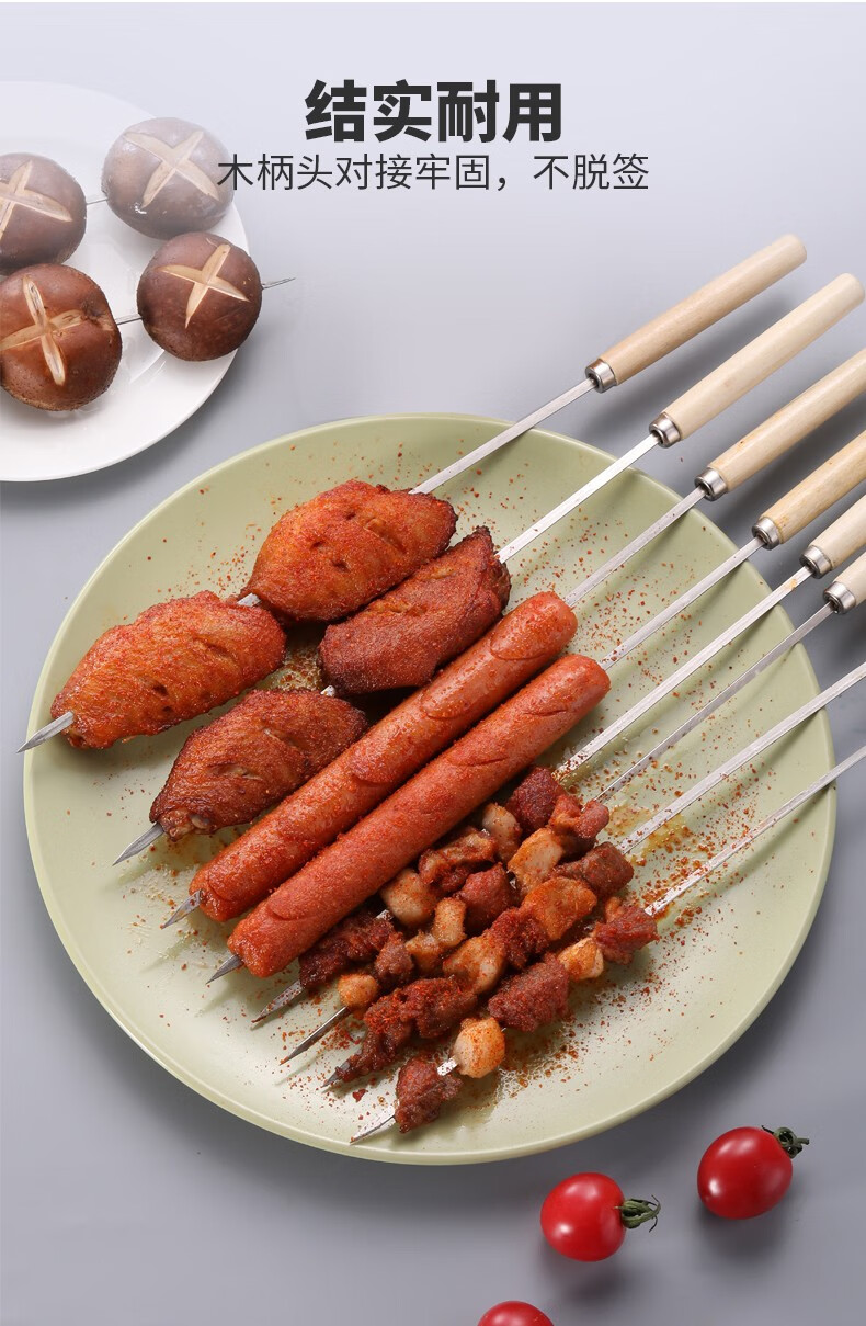 使用体验非常棒!这些不锈钢烧烤签子质量上乘,坚固耐用,烧烤时不会轻易弯曲或变形。木柄设计握感舒适,防止烫手。清洗也很方便,不易生锈。