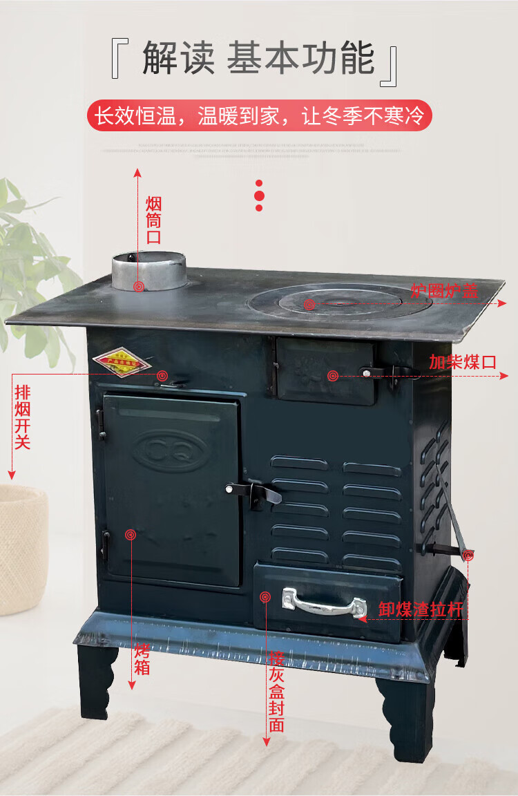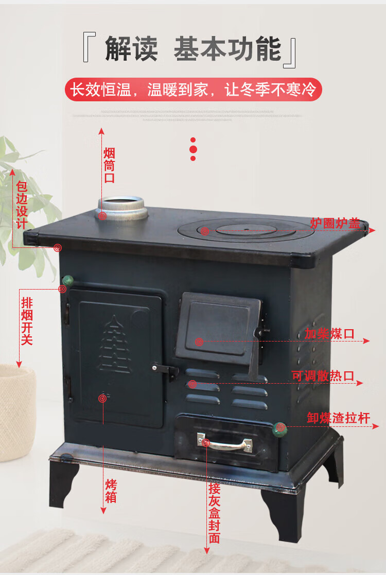 农村新型取暖炉家用室内无烟铸铁炉子采暖烧煤炭炉柴煤两用烤火炉 【气化炉】特厚升级+1米烟筒2弯头+礼包