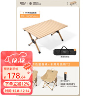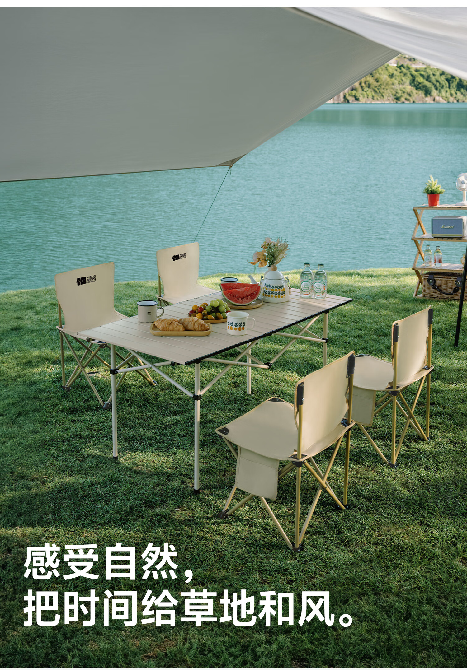 原始人蛋卷桌户外野炊全套装备野餐露营桌椅便携折叠椅子桌子一体 90木色+卡其月亮椅*2