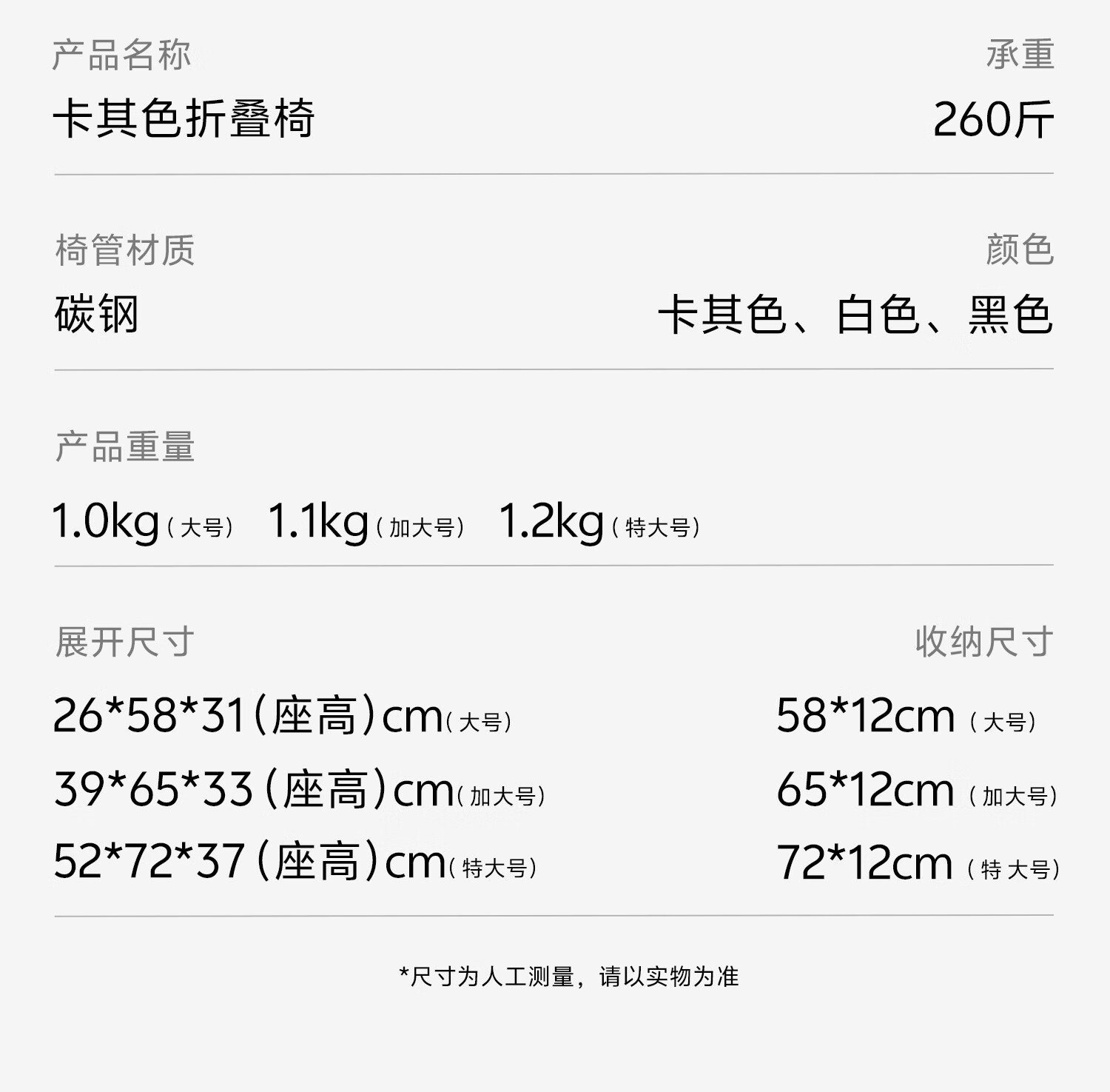 折叠椅质量做工都很不错,承重力没问题,我选的大号,非肥胖的成人都应该是合适的,坐着舒适度也不错,收纳简单,出游必备款。 购物体验很不错!