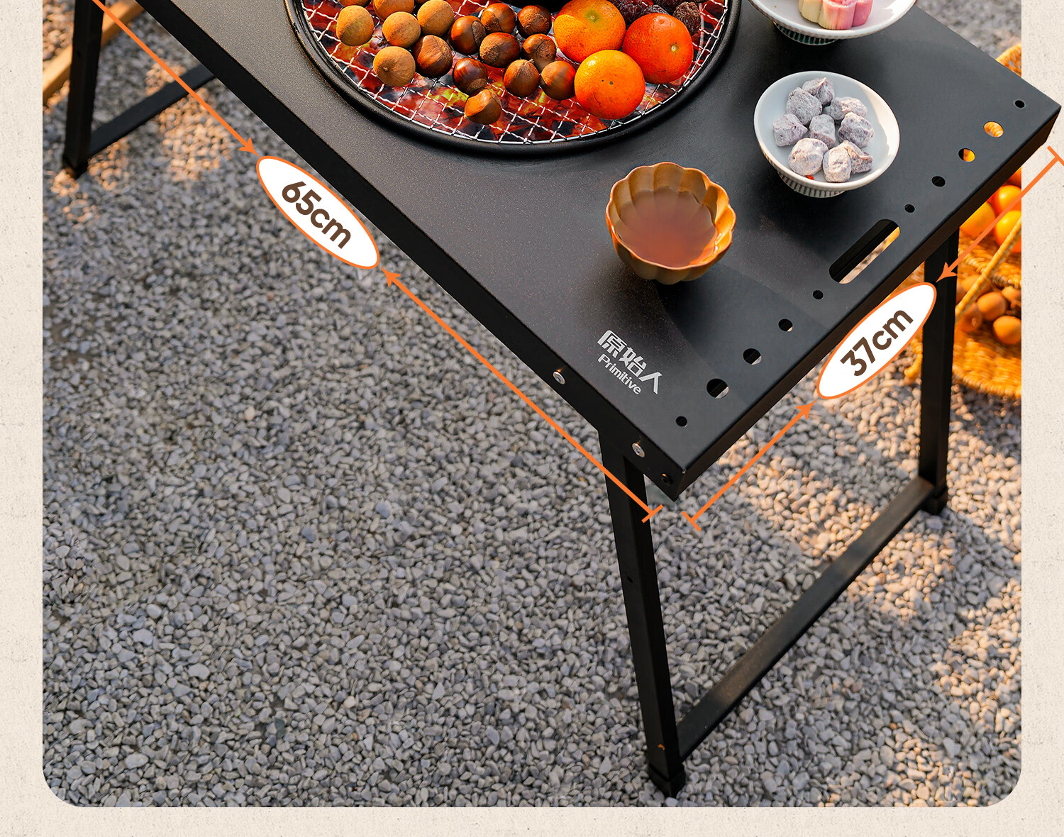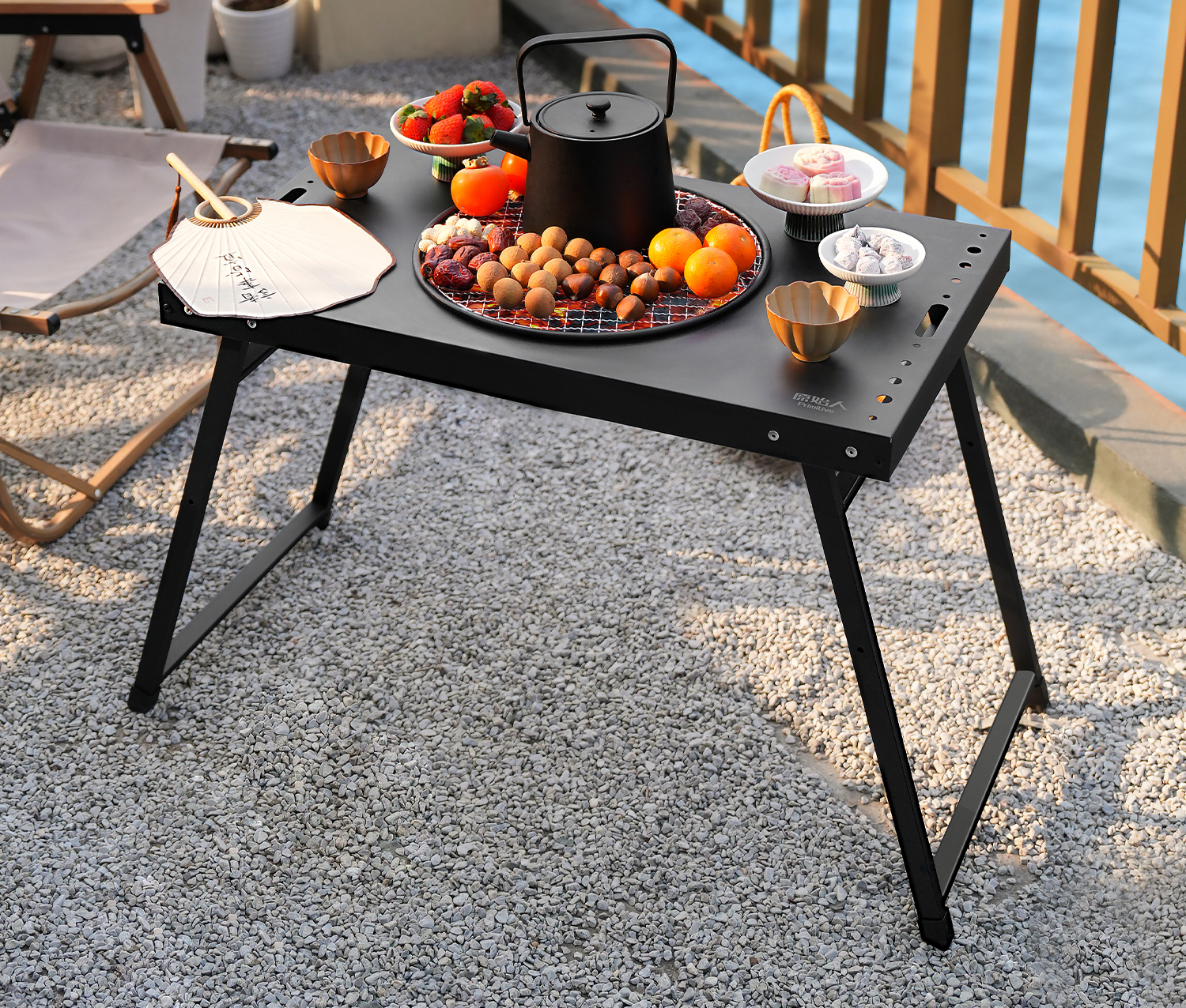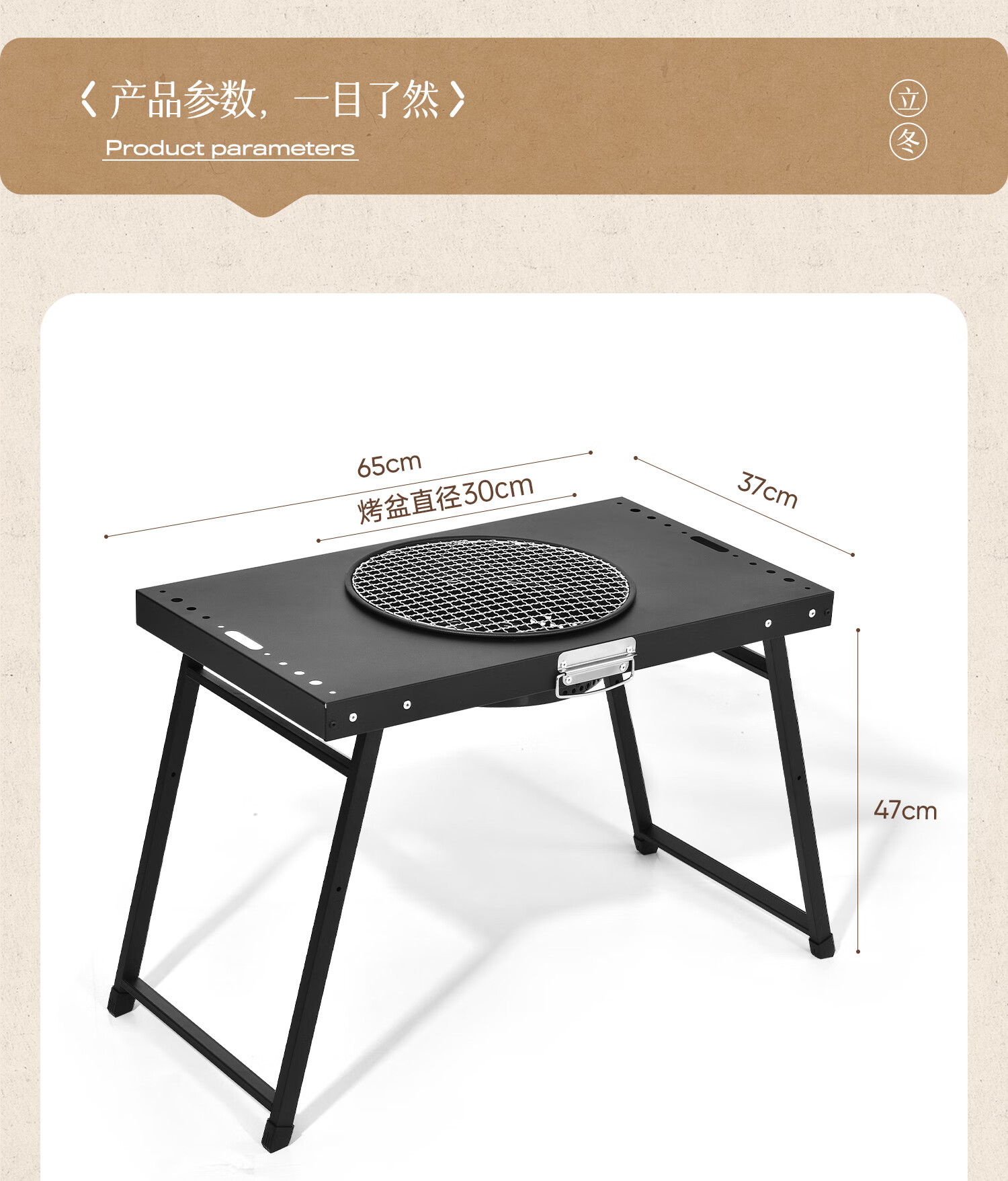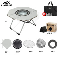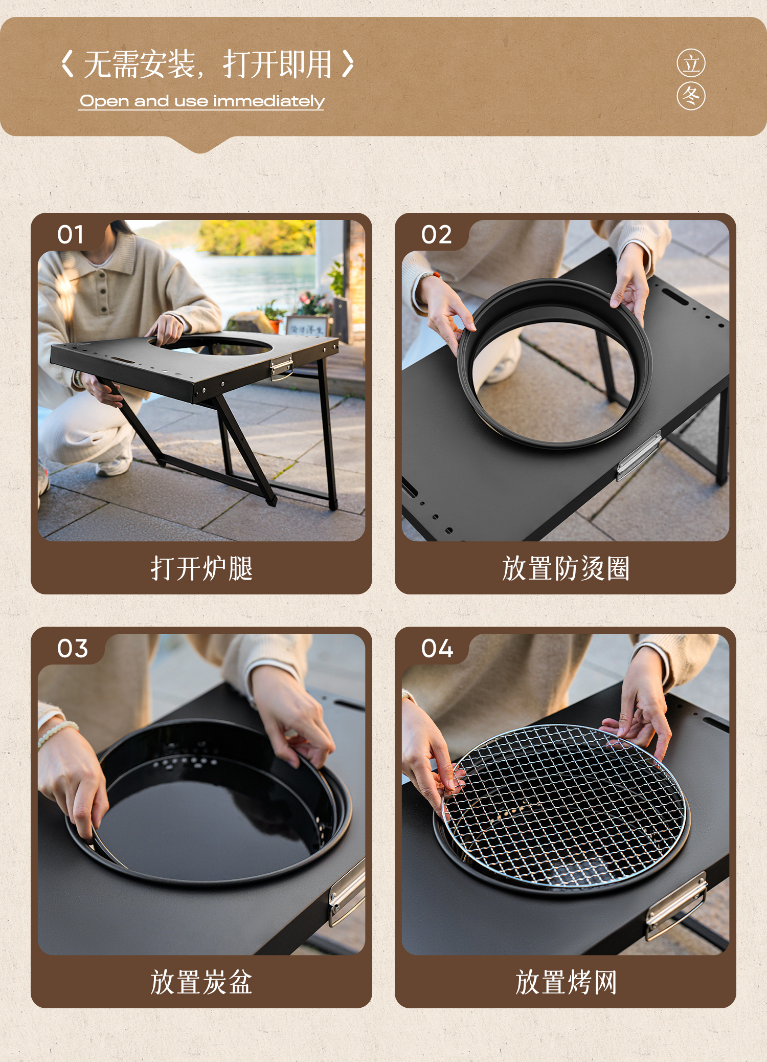 新款露营围炉煮茶桌子烤火炉套装速开家用烧烤肉户外折叠碳炉便携 灰白【套装】套桌+烤盘+盖板+炭
