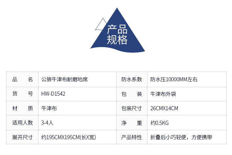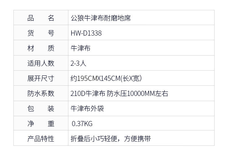 公狼户外帐篷牛津布地席野外露营沙滩草地防潮地布防水隔潮野隔热坐垫 195*145cm地席