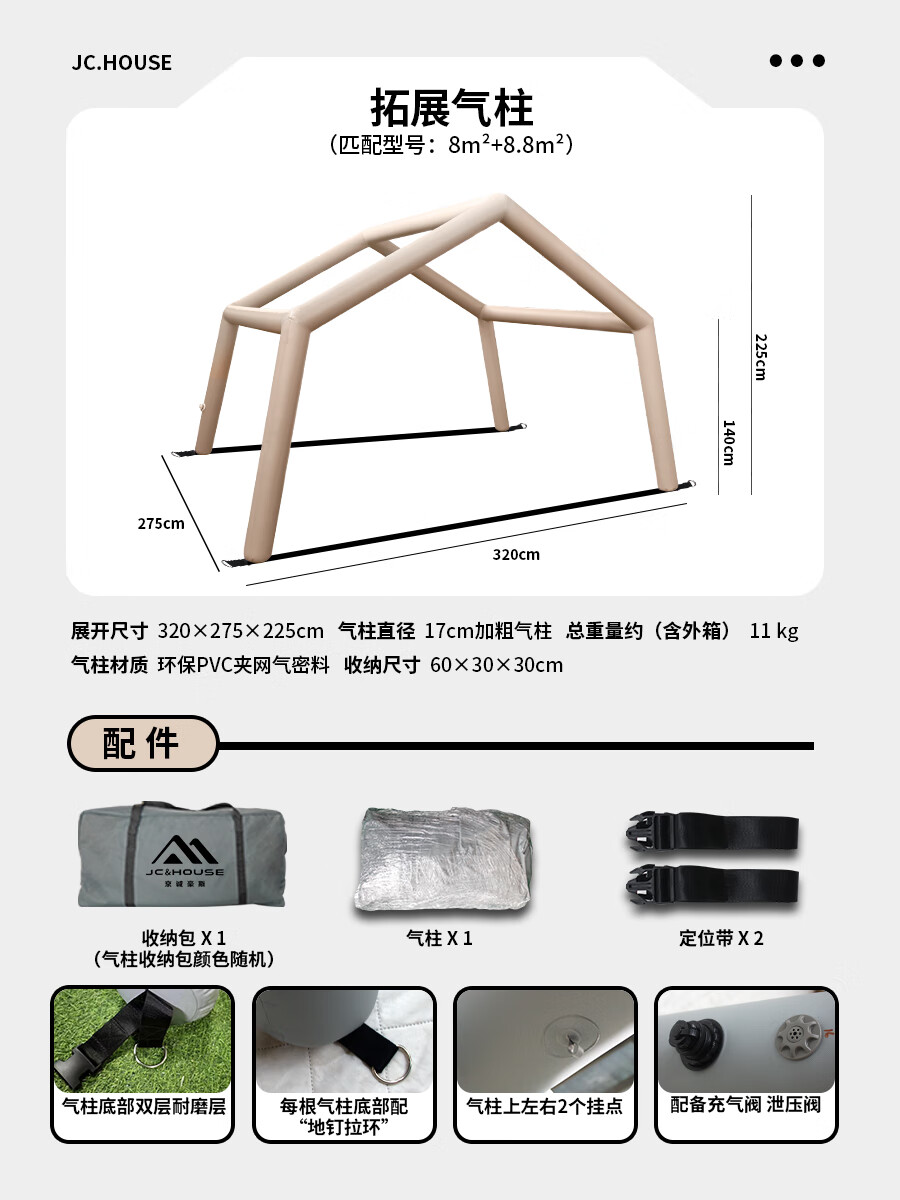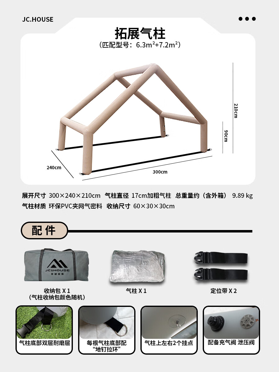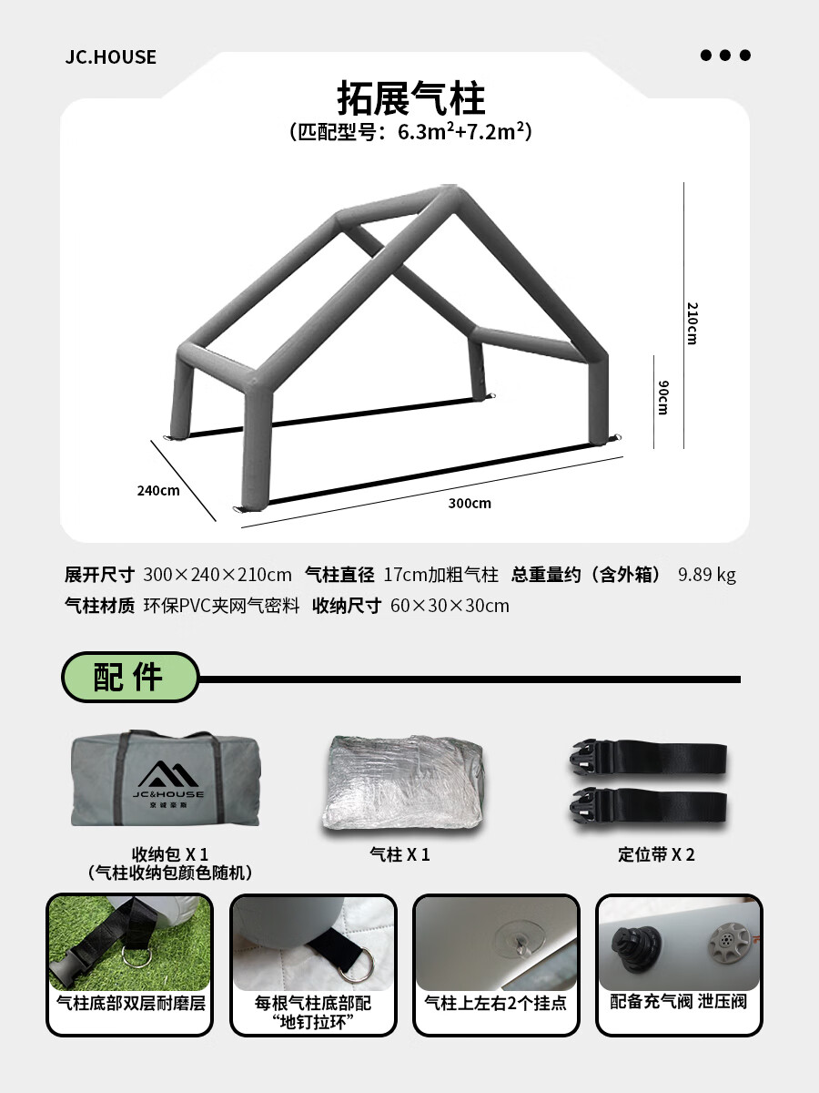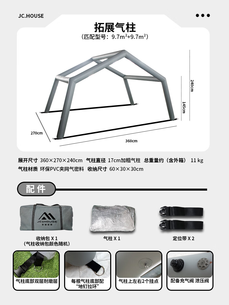 京诚豪斯JcHouse充气帐篷门厅拓展气柱PVC气柱6.3㎡/8+8.8㎡/9.7㎡ 豪斯6.3+7.2㎡(灰色)拓展气柱(单气柱)