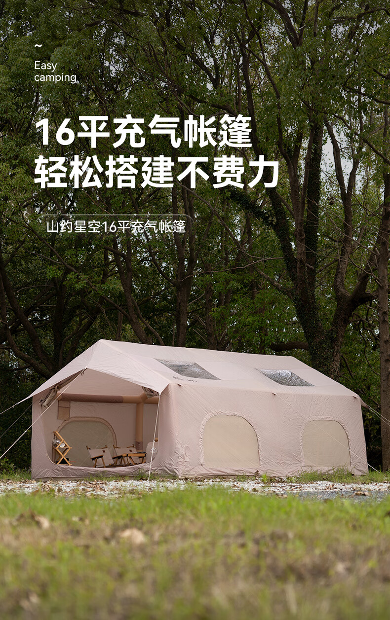 山约自动充气帐篷户外露营新款星空16平野营过夜防暴雨全套装备 牛津布16平+电动泵+床
