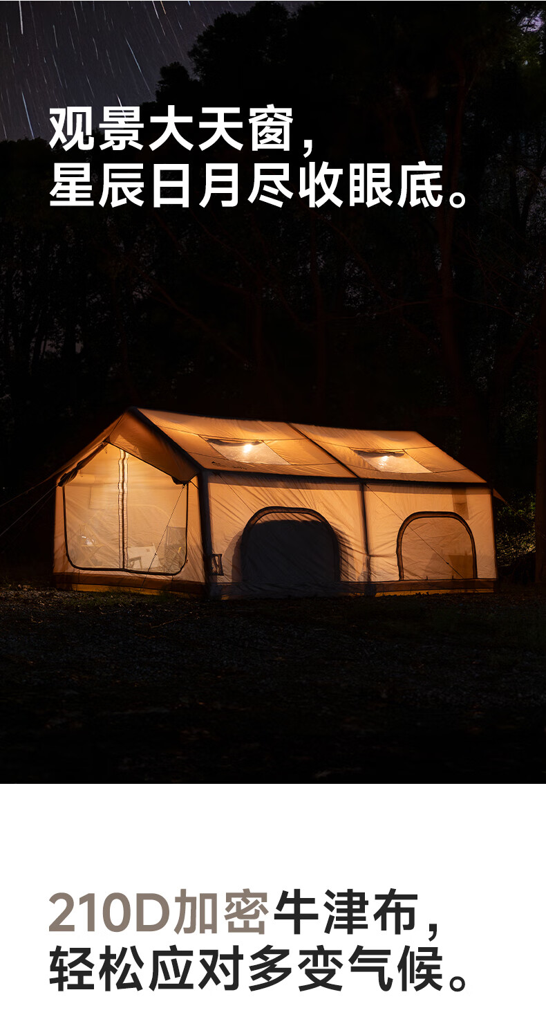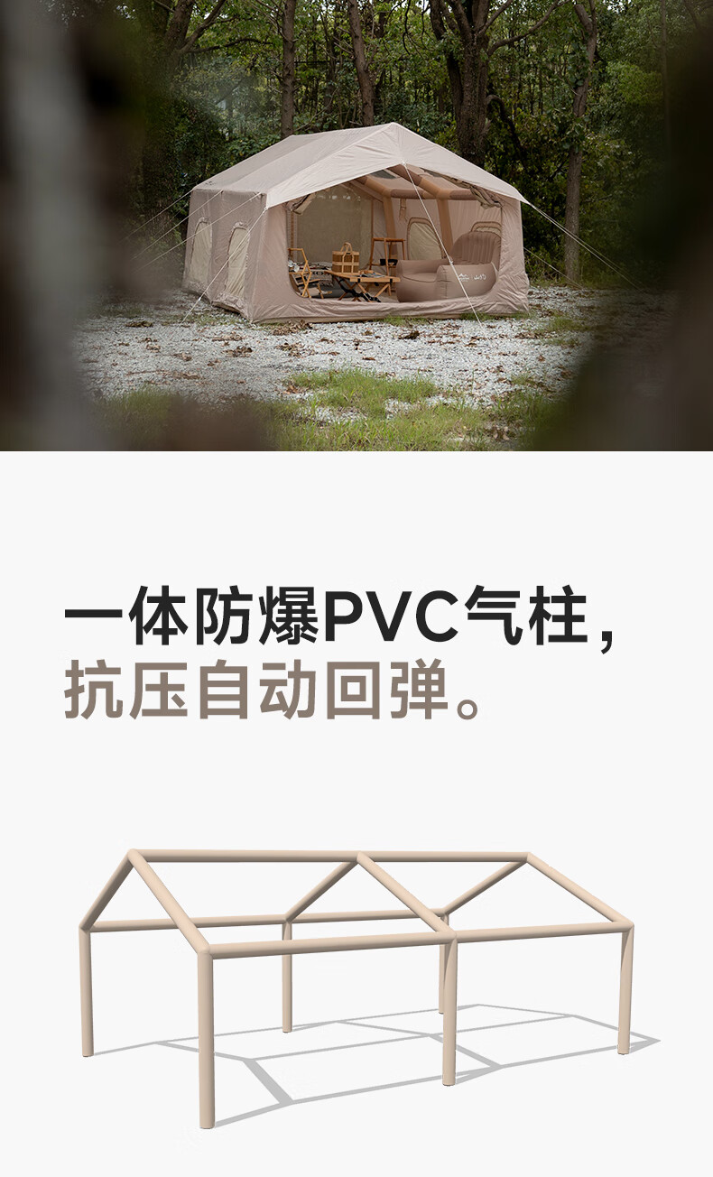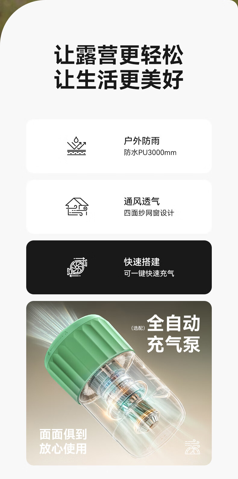 露营帐篷不错,使用超方便,配的气泵功率小了,充气时间有点慢,没纳时气柱里的气有放不净的感觉,得多压一会儿。