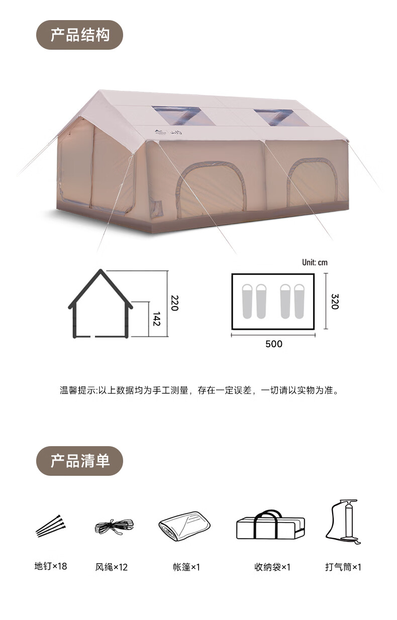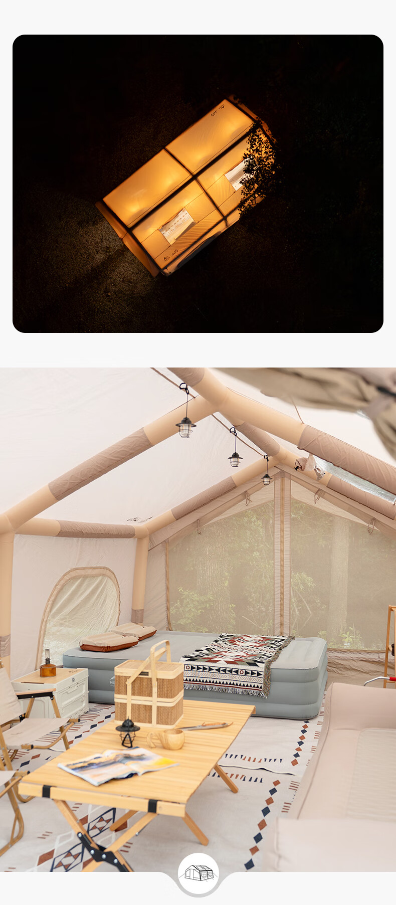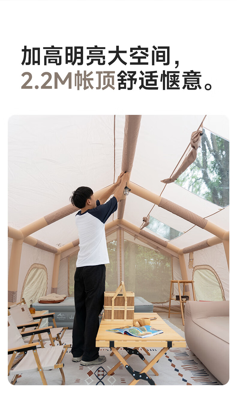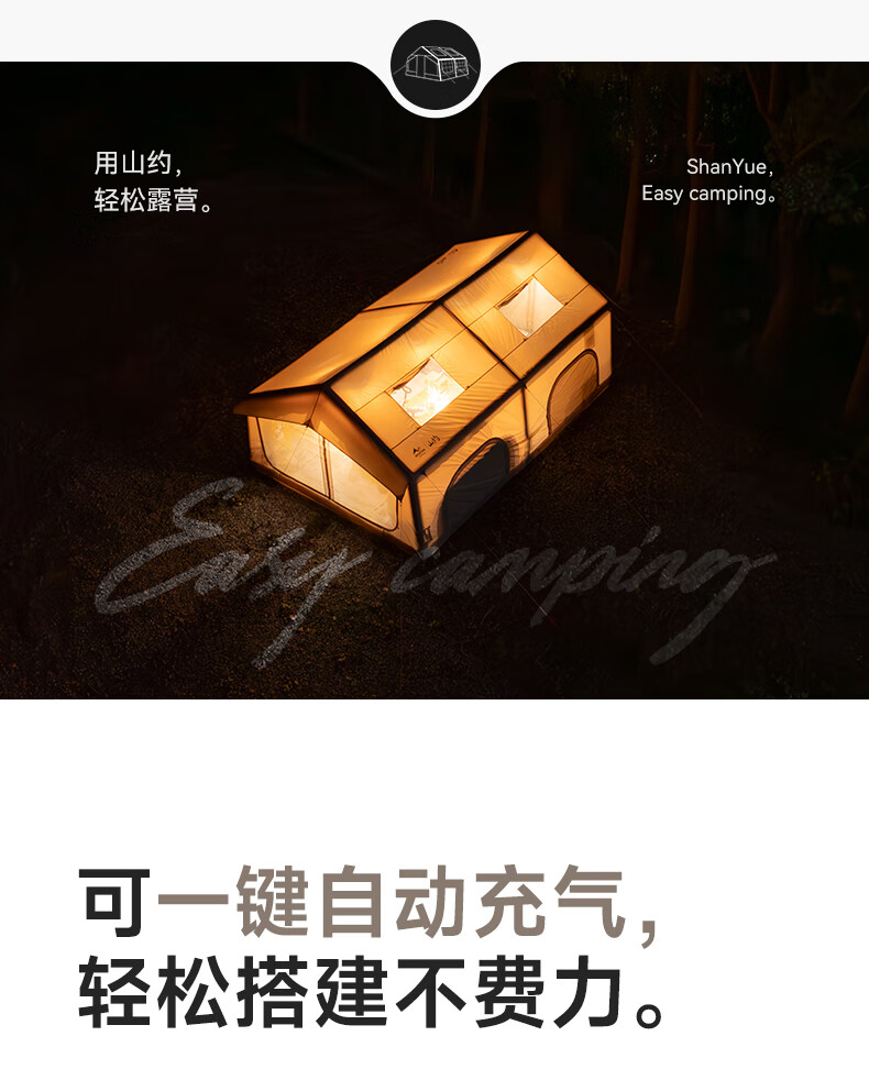 露营帐篷不错,使用超方便,配的气泵功率小了,充气时间有点慢,没纳时气柱里的气有放不净的感觉,得多压一会儿。