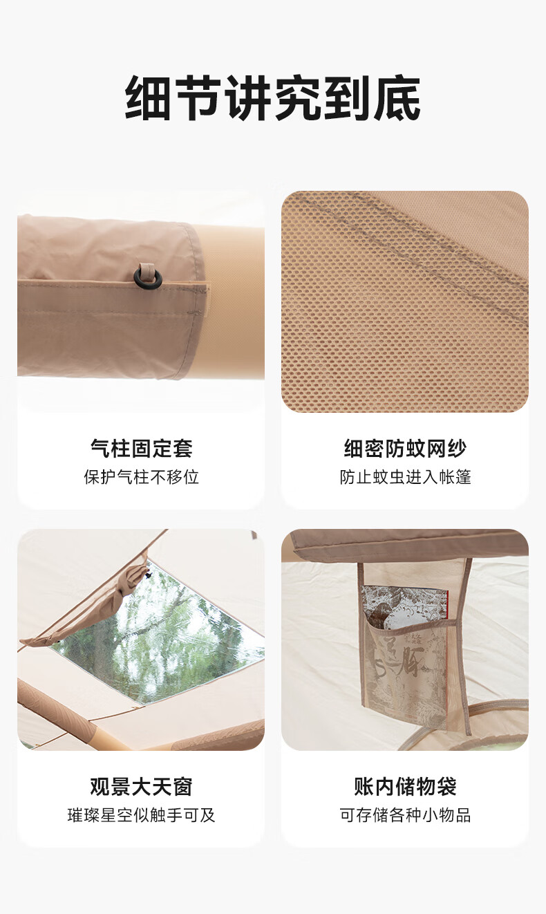 东西收到,非常满意很好颜色也好是我想要的充气帐篷,充气又放便收起来也很放便是真心好用放购买直得拥有,天窗设计的大小刚刚好,晚上可以看看星空,网纱也是用的全拉链的这个小虫子就不会进来了,户外使用晚上睡觉也安全了很多,和朋友露营的时候好多人夸哈哈哈,服务也非常满意,不懂的问题给她说后马上就为我解答,也很耐心。想买帐篷的朋友真心推荐买这家!!