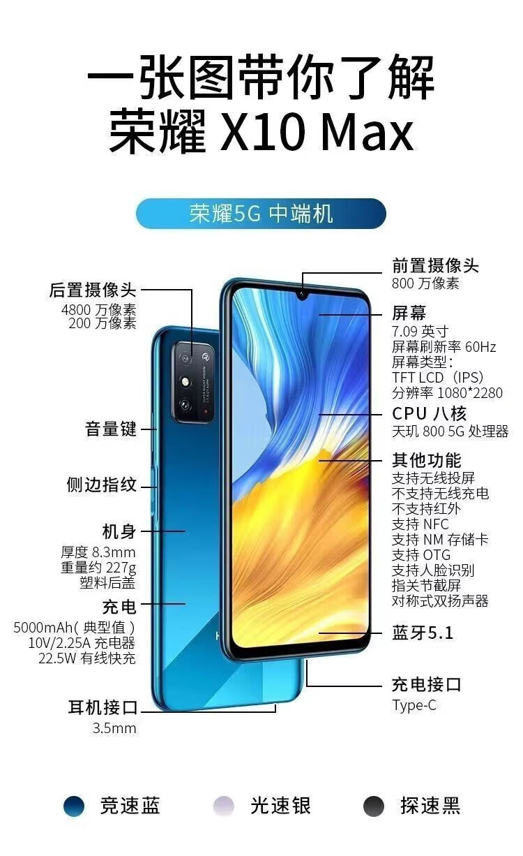 荣耀X10 Max大屏幕5G手机7.09寸官方大电池游戏机 竞速蓝 8+128GB