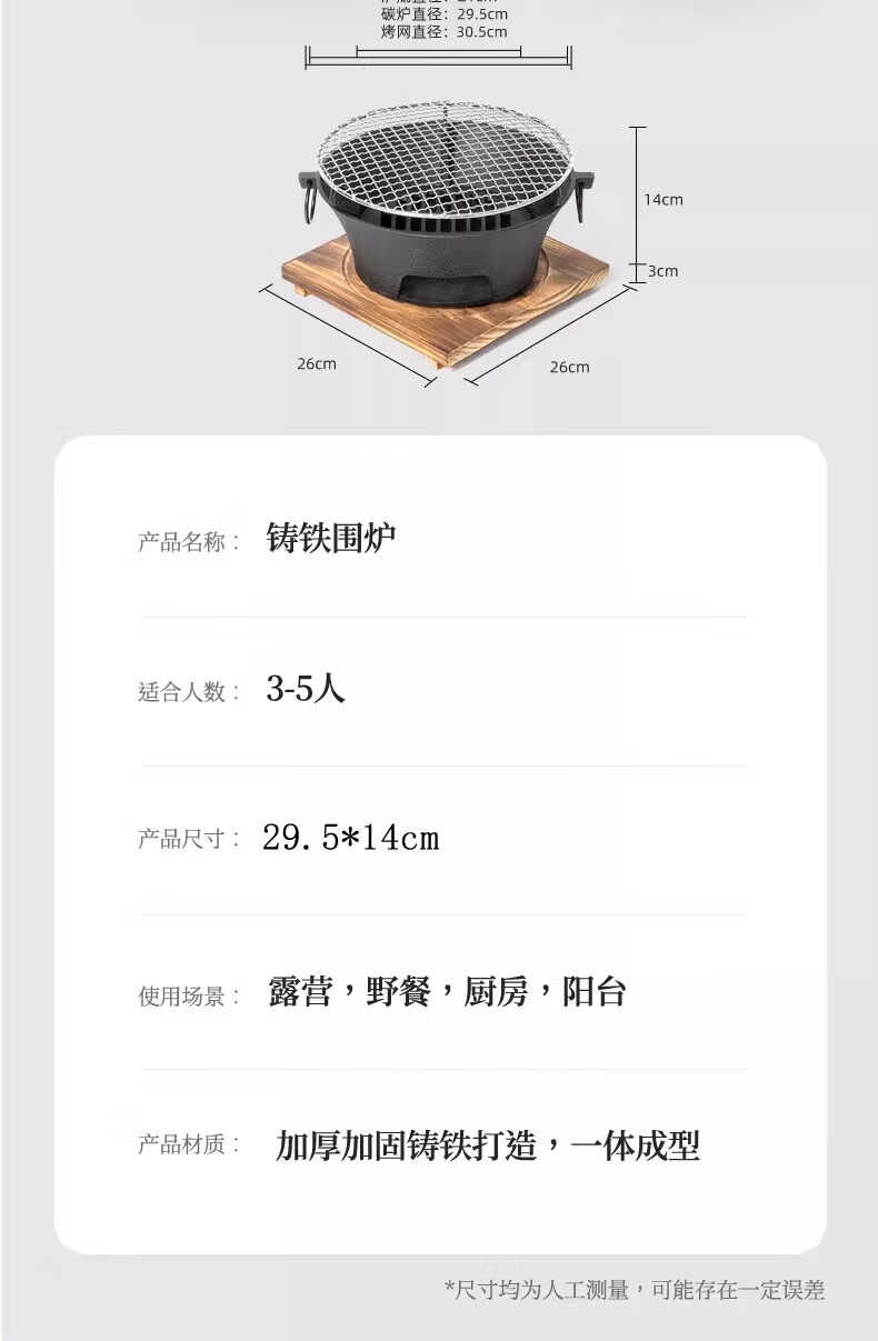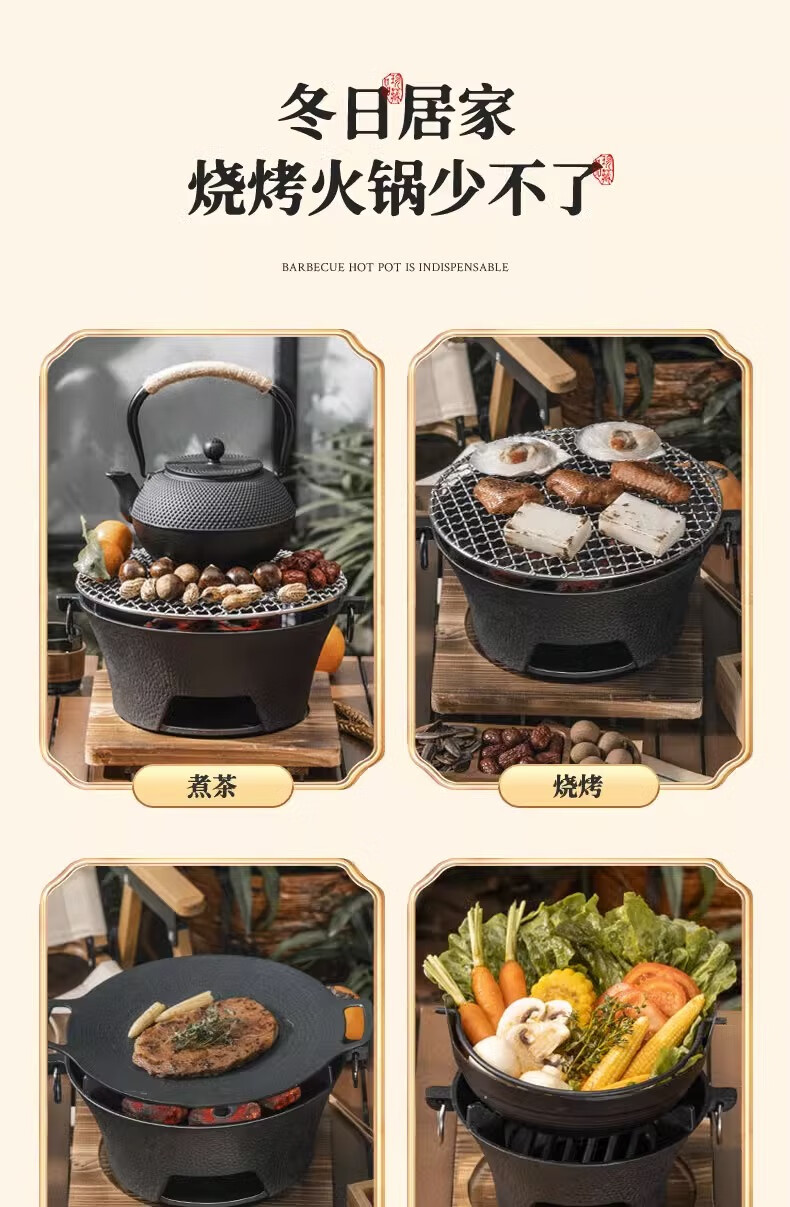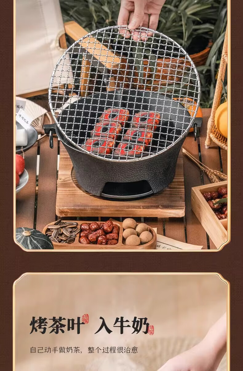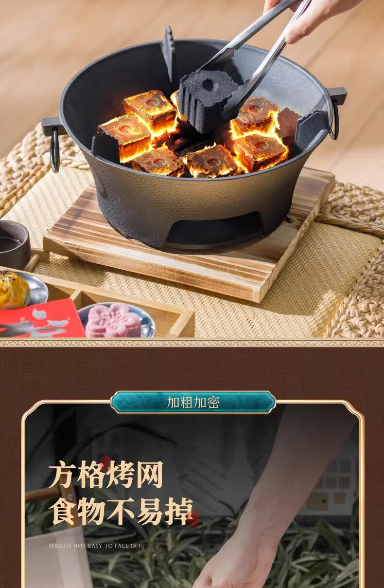 探险者围炉煮茶套装户外铸铁烤炉烧烤架室内取暖炉烧烤火盆炉木炭 加大号26cm铸铁炉+烤网+炭夹
