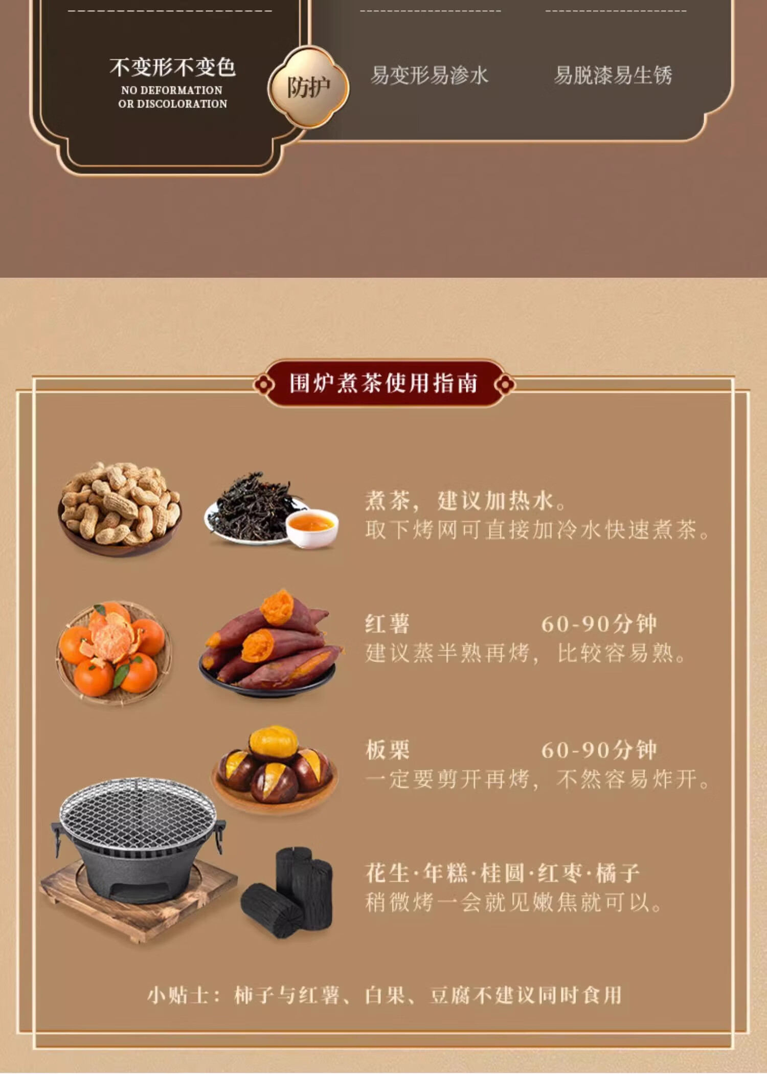商家说茶壶那些很快会上架,很期待,可以一套买完回来,秋冬很流行围炉煮茶,很少写评价,真心不错,这氛围感,绝了,户外烧烤炉也很好,不过这个季节主要是用来做围炉,多功能,实用。店家超级棒,但是看到实物并且使用感受还是有点小惊喜,比我预想的好多了。啥也别说,我反手就是一个五星好评。 质量不错,也可以折叠,收起来一点不占地方,后备箱放下去那是绰绰有余,我们出门东西不多,所以这个炉腿也就懒得去折腾了,直接就放进去了,东西多的伙伴可以买收纳袋的套餐,不用的时候装起来也是非常方便