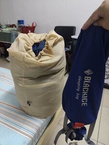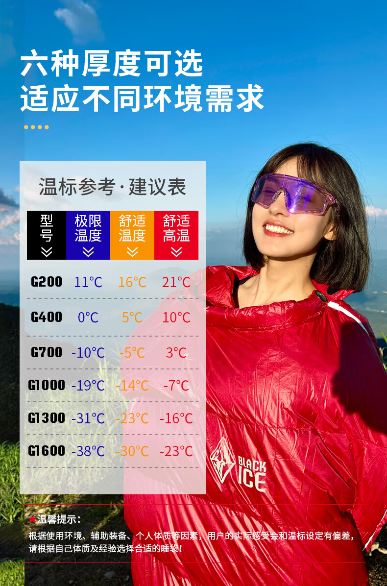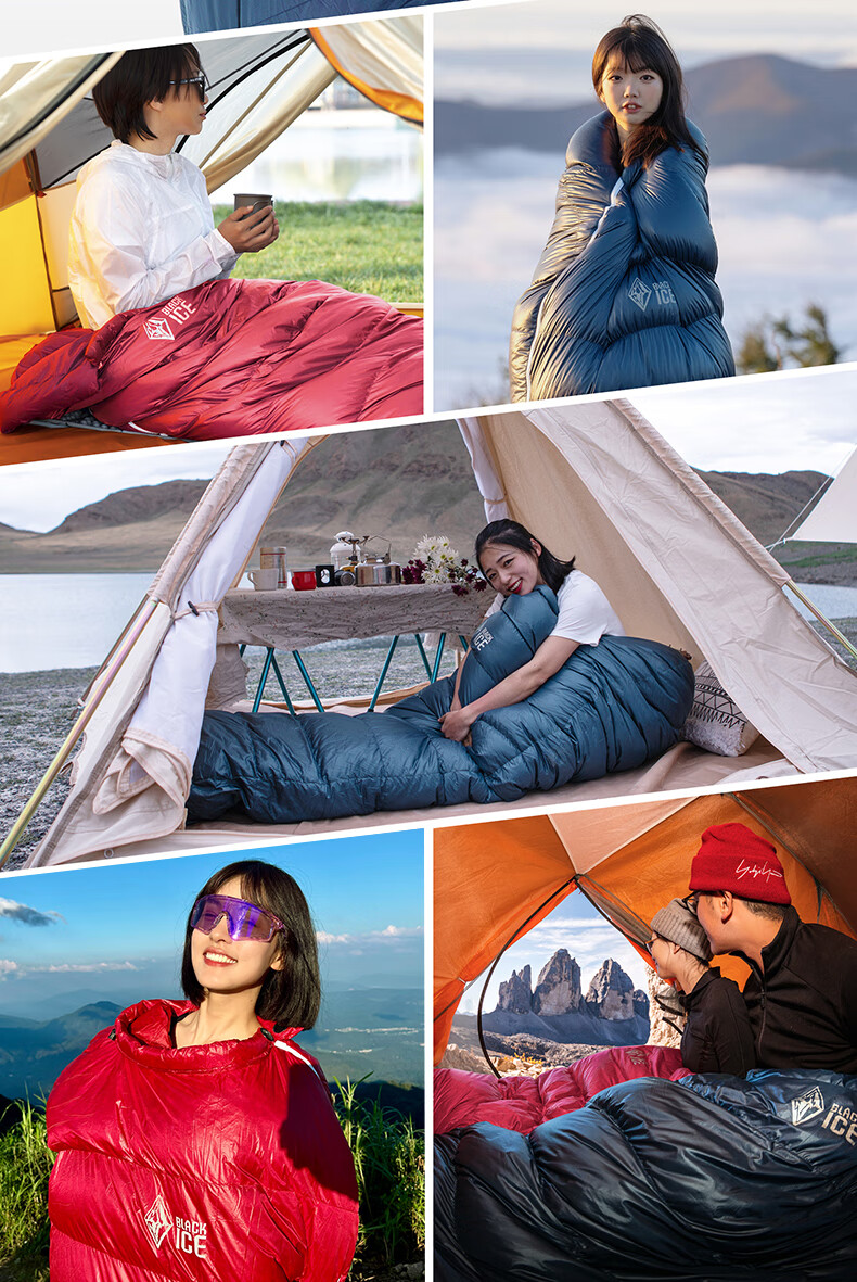 我是第一次买睡袋,首选黑冰G1300鹅绒睡袋(一次到位),没异味,蓬松度好,非常满意,黑冰值得信赖。还送了个魔术头巾黑色的,还有一个充气枕头,最人性化的是睡袋的收纳袋