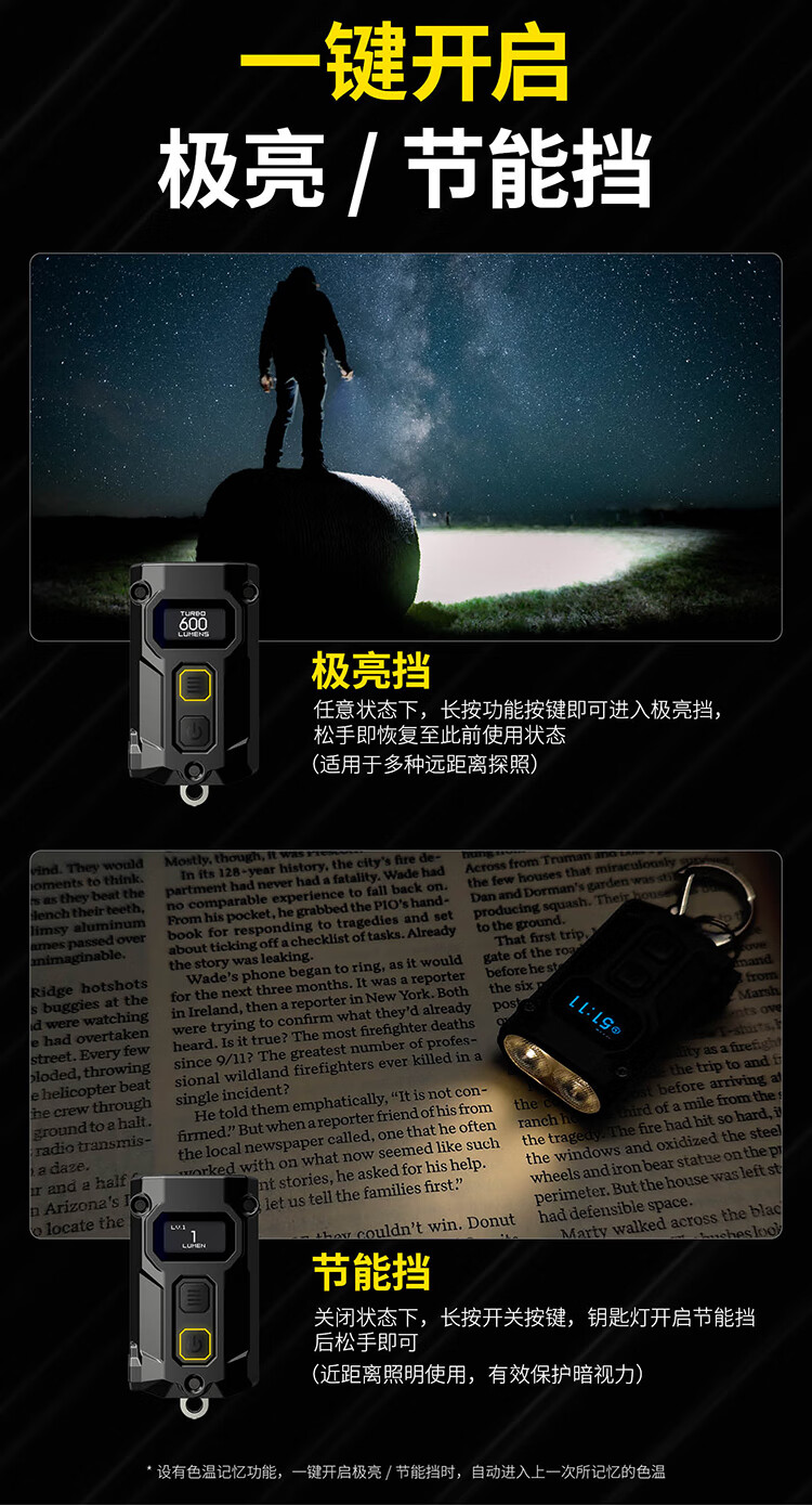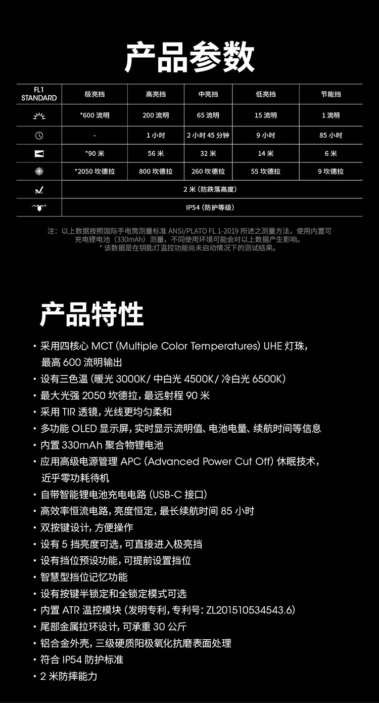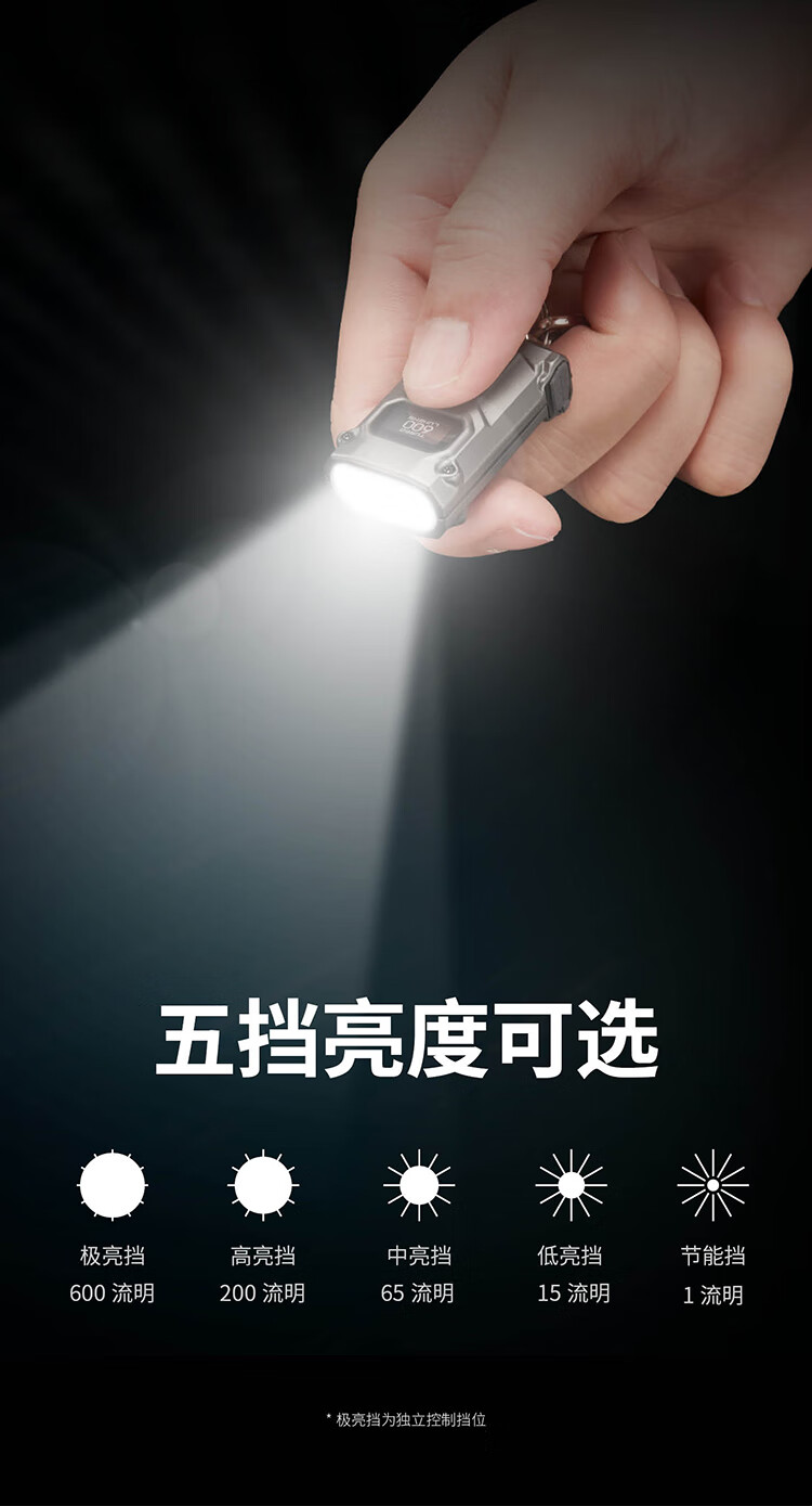 非常迷你,有着与体积不相符的亮度,橙色也很骚很好看,可以把钥匙上的大家伙换下来了,600流明看参数好像不高,但是日常使用和应急其实用200流明的高亮档也完全够了。 光照强度:完全够用 续航时间:屏幕上能显示剩余续航时间,应该大差不差。 产品重量:轻,轻到不行 其他特色:三色温可切换是亮点,妈妈再也不用担心该买高显色还是高亮了。 总体好评,个人喜欢这种真正的"edc"真的可以每天随身携带,期待下一款产品,希望可以在保持轻便的基础上加入更多功能。