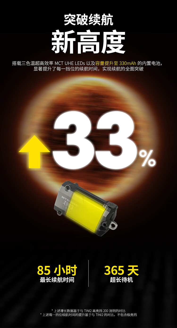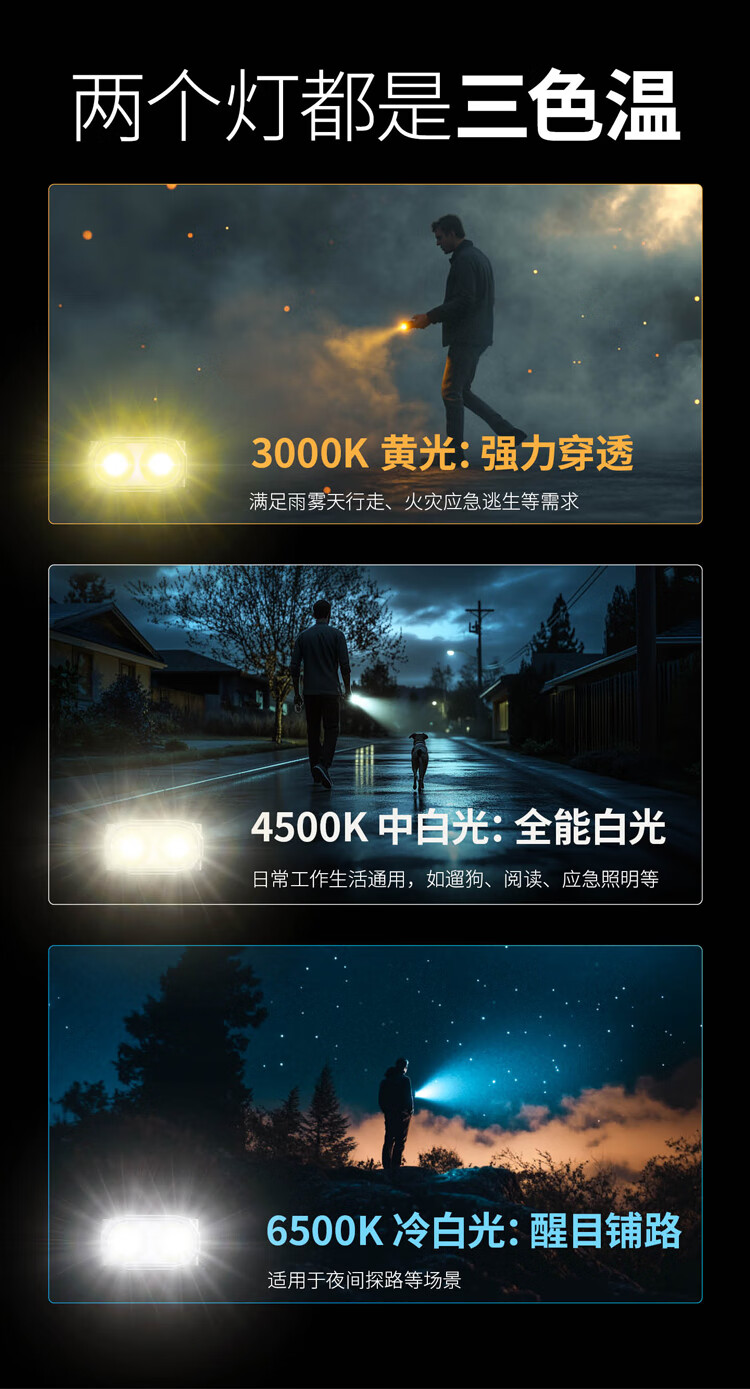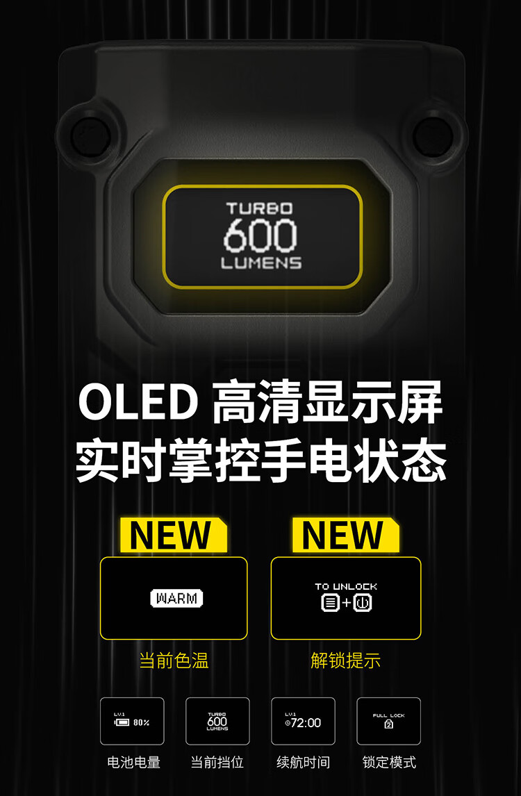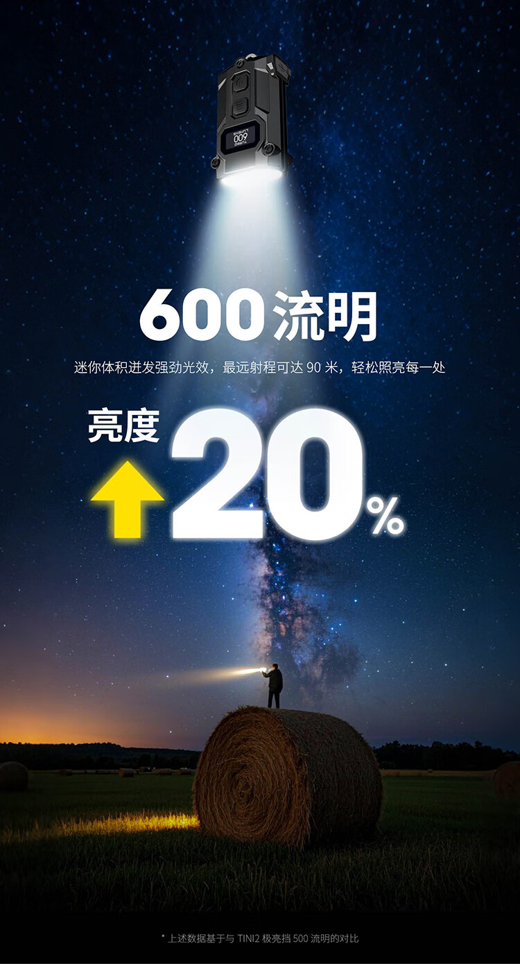 非常迷你,有着与体积不相符的亮度,橙色也很骚很好看,可以把钥匙上的大家伙换下来了,600流明看参数好像不高,但是日常使用和应急其实用200流明的高亮档也完全够了。 光照强度:完全够用 续航时间:屏幕上能显示剩余续航时间,应该大差不差。 产品重量:轻,轻到不行 其他特色:三色温可切换是亮点,妈妈再也不用担心该买高显色还是高亮了。 总体好评,个人喜欢这种真正的"edc"真的可以每天随身携带,期待下一款产品,希望可以在保持轻便的基础上加入更多功能。