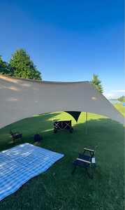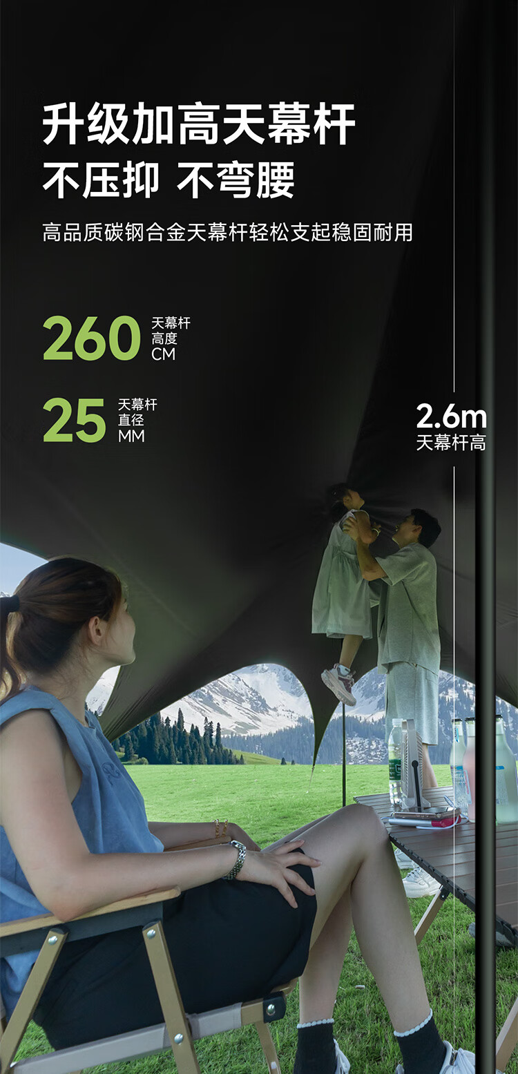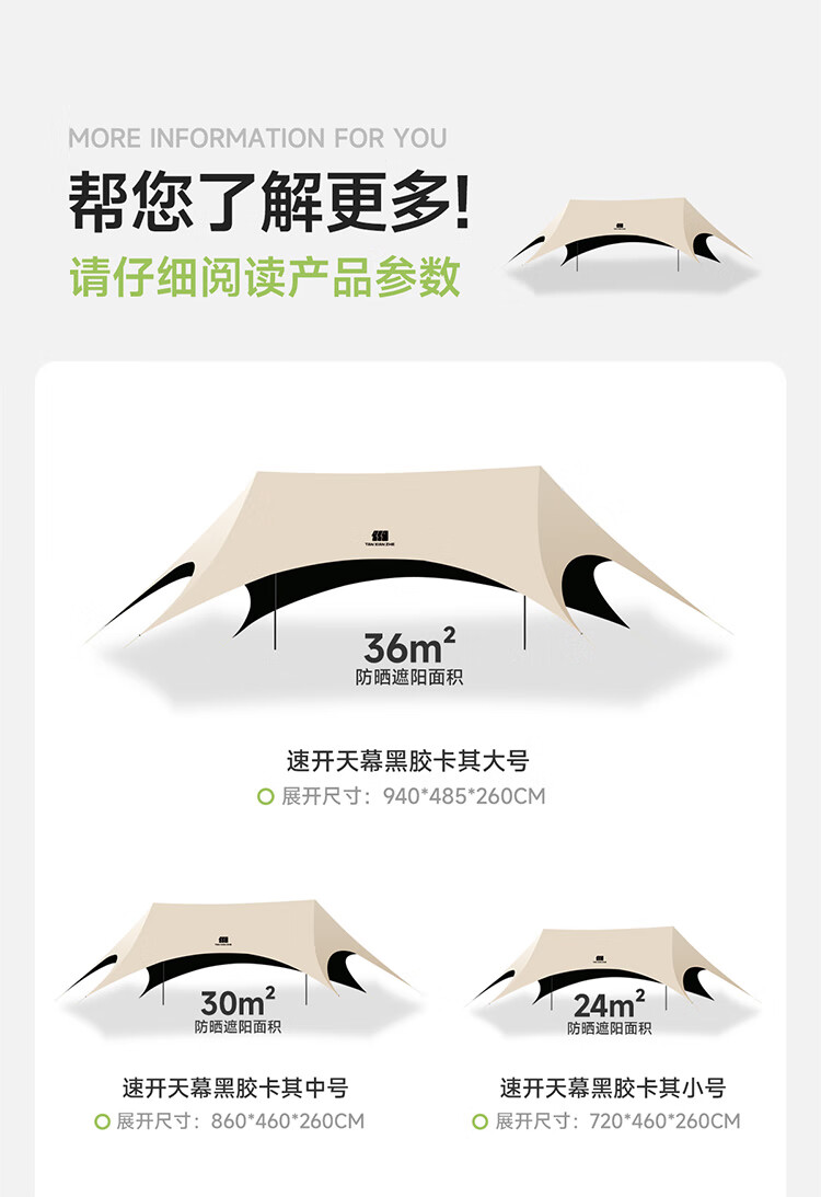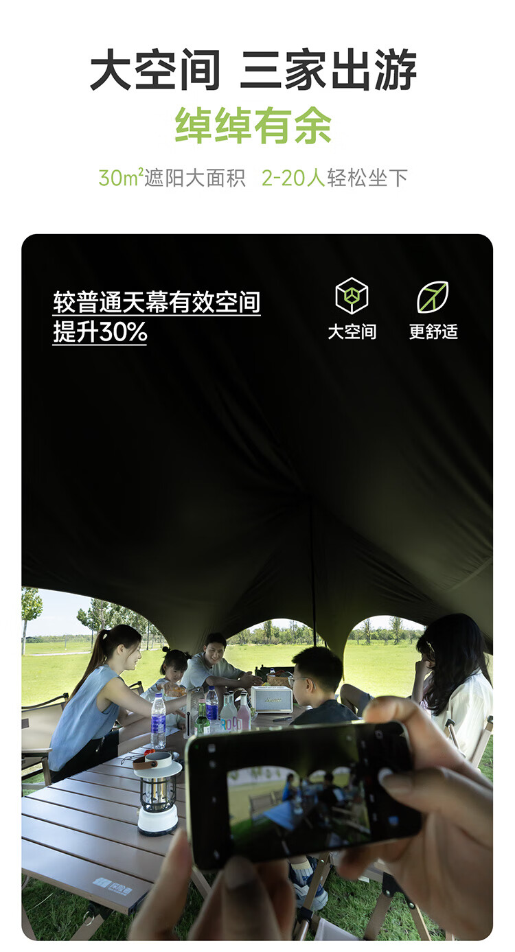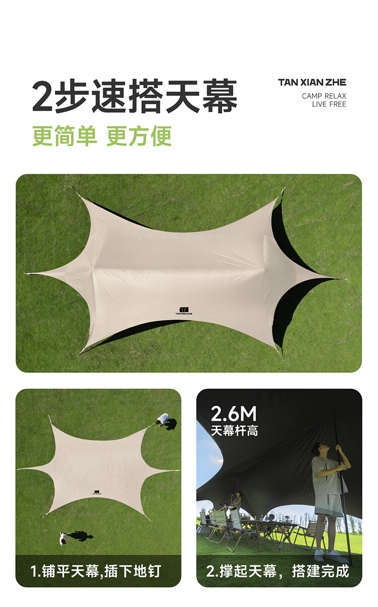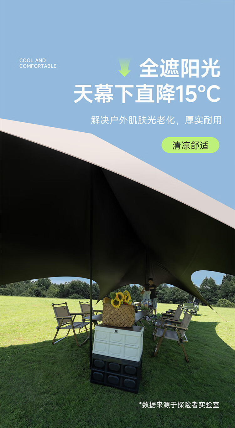 非常推荐!!! 真心好评,性价比高的天幕,真真实实的大天幕。在大太阳下依然保持很好的遮阳功能 比起绝大多数天幕拉绳子收绳子,然后收起来后打结,这个天幕完美的解决了这个问题。。是我的梦中情幕。毕竟!!天幕的作用就是要大!!! 另外,成年185男子在天幕下活动无障碍已经秒杀了90%的天幕