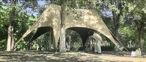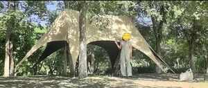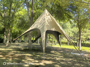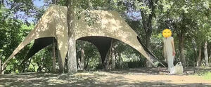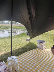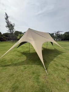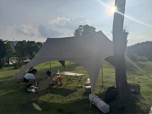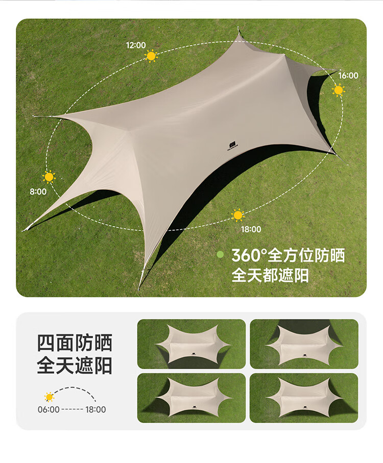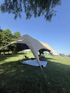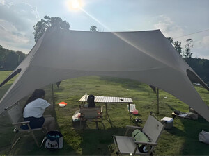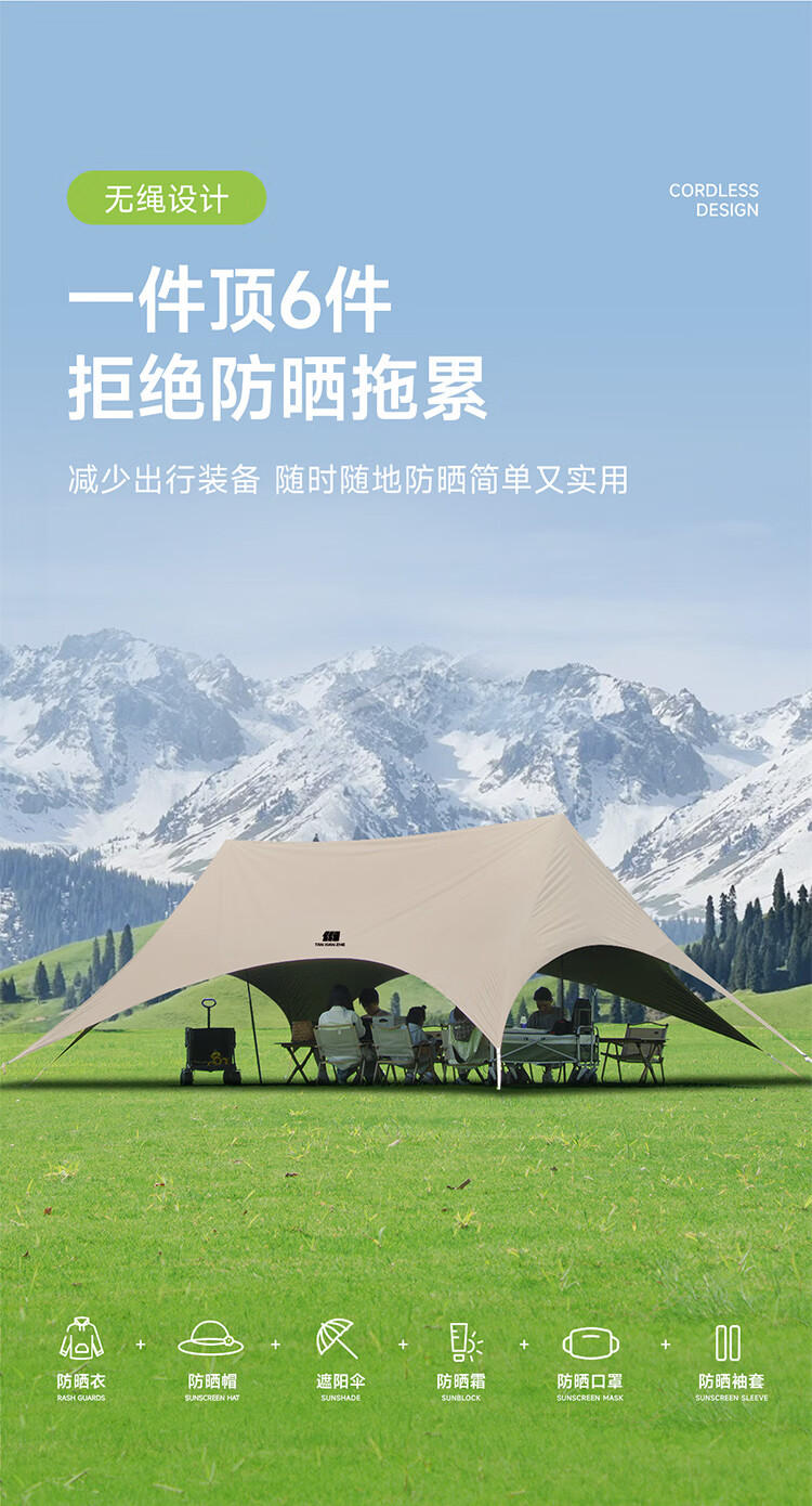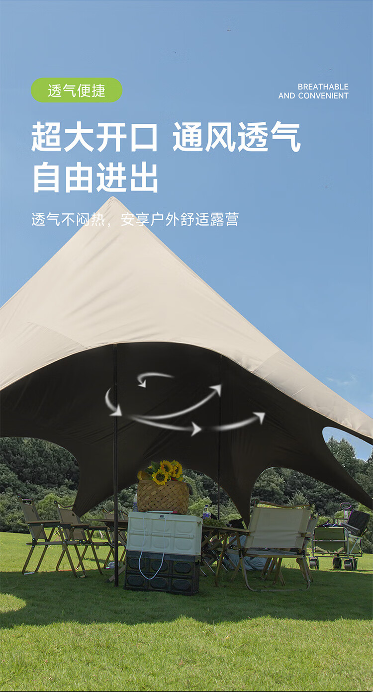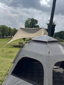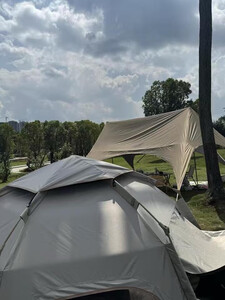 等到天气好的时候带去户外试了一下,刚开始还不太会搭,打好之后大概就知道怎么弄了,有防晒层的在里面不热,通风很好,露营必备的。