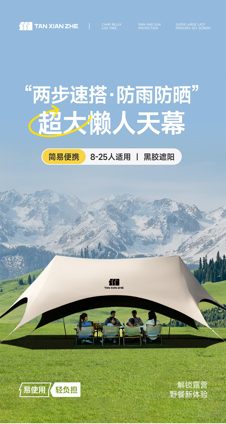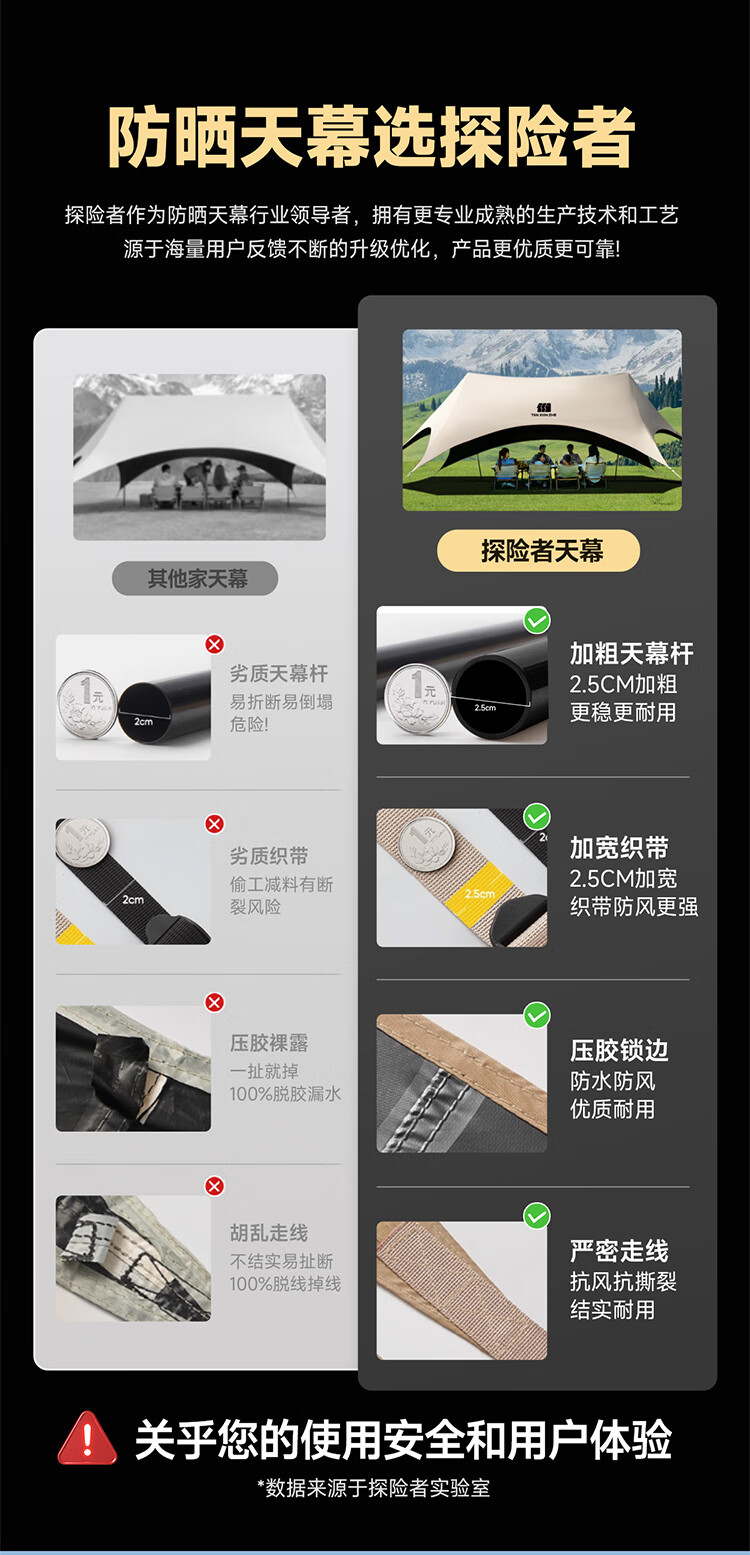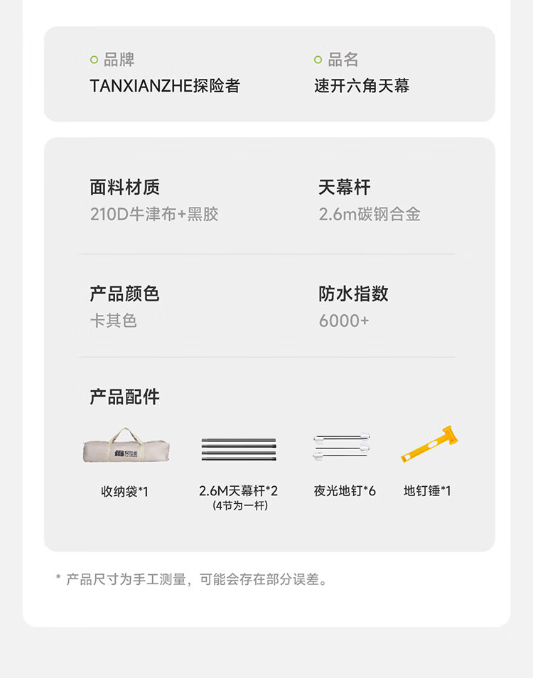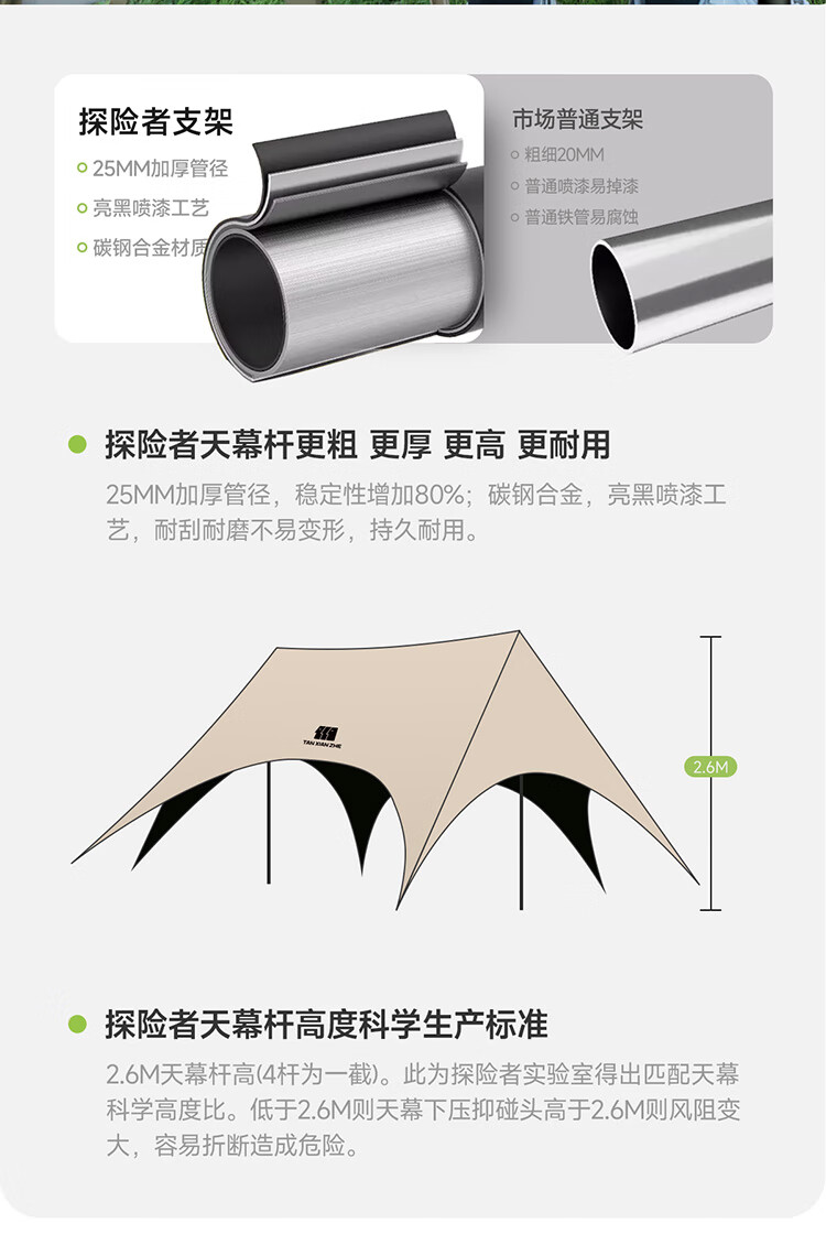 看了好几家天幕,最终选择了探险者家这款,还是很方便搭建的,质量样式都很不错。