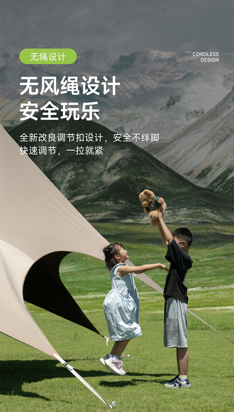 质量太可以了,涂层是更高级的那种,第一次搭建体验感还行,比绳子的好用。中午十点多的阳光已经很晒了,天幕下还是很舒适的,不热,防晒可以,孩子们玩的很开心。品牌的东西就是不一样,比我在小商品市场上看见的好太多了