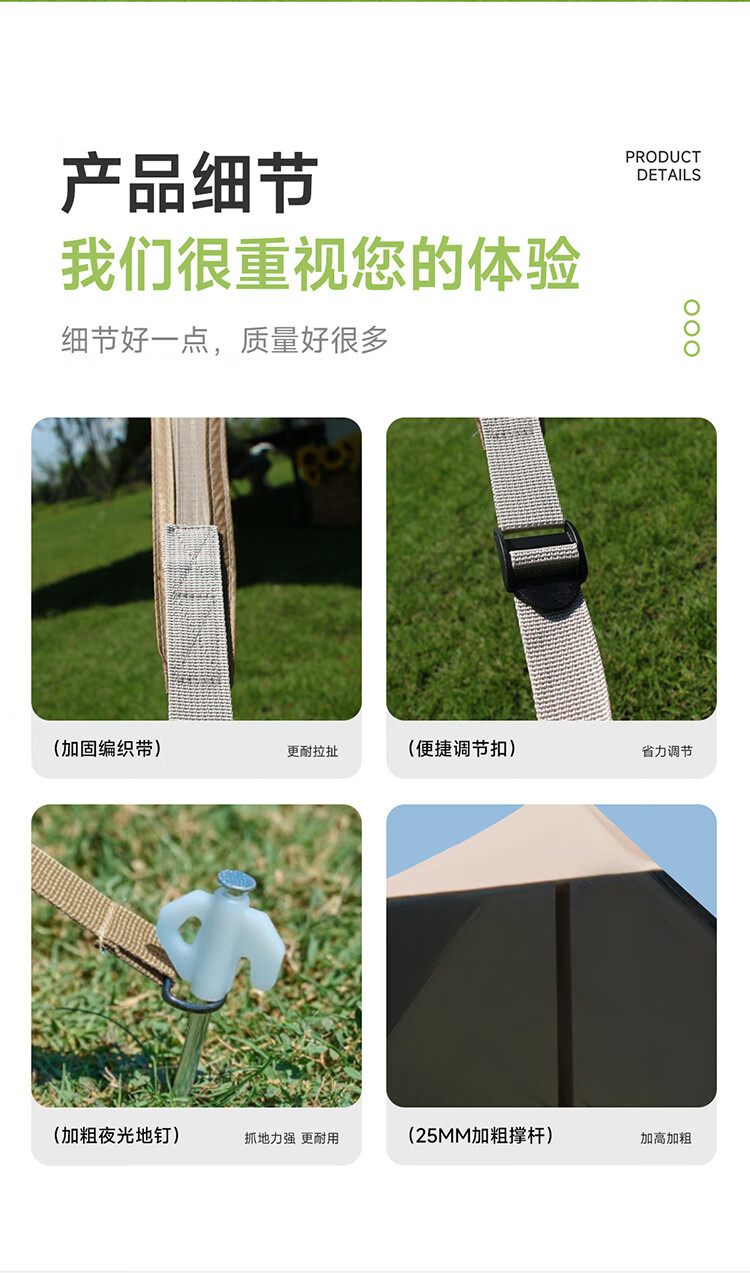 天幕很好,厚实,结实,地丁和调节扣都有夜光,设计非常好