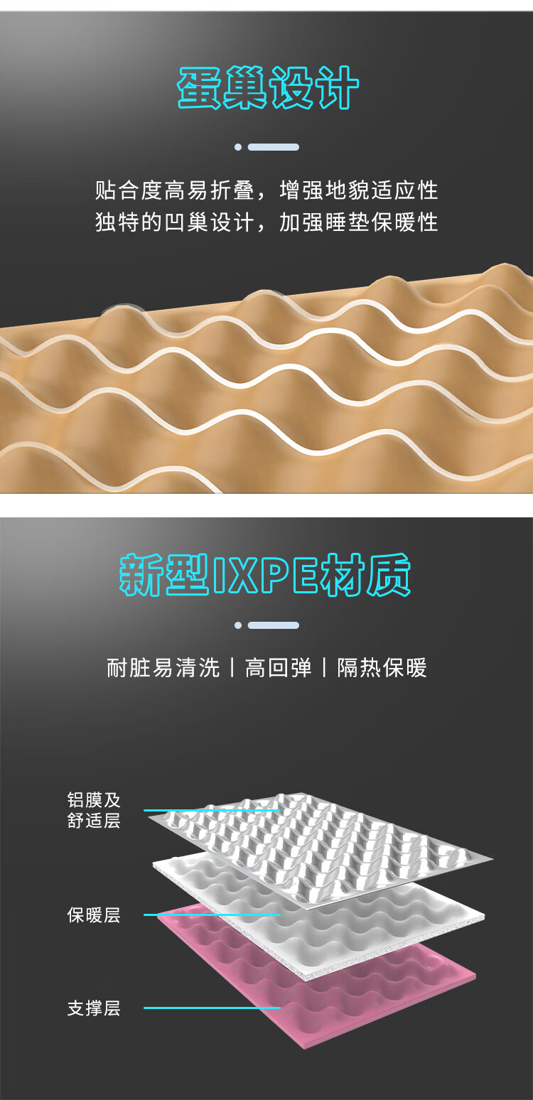 回购,和朋友去露营,多买了张。 宽度60在蛋槽里面比较宽了,但是如果是双人帐,一个人睡两张会更舒服,宽一点就是爽。配合垫的或者气垫会更好,直接睡会有点点硬。
