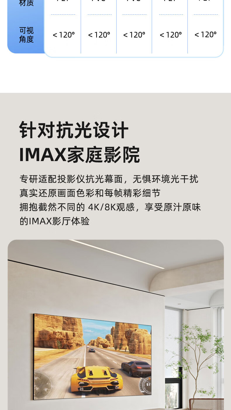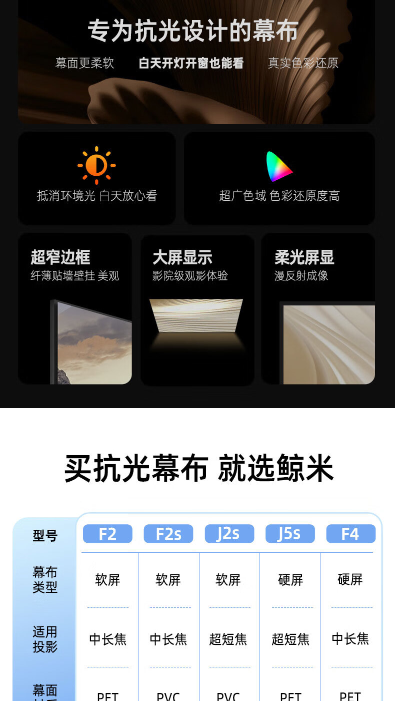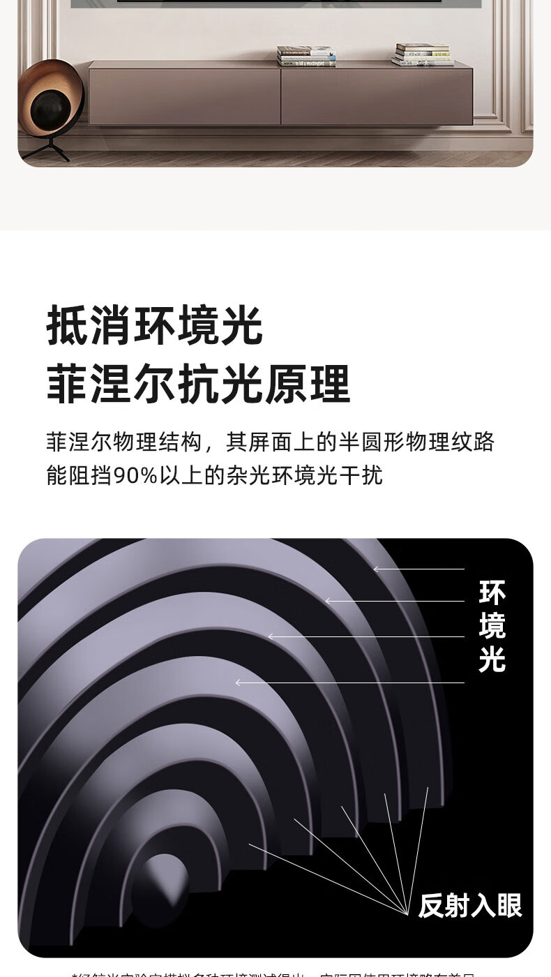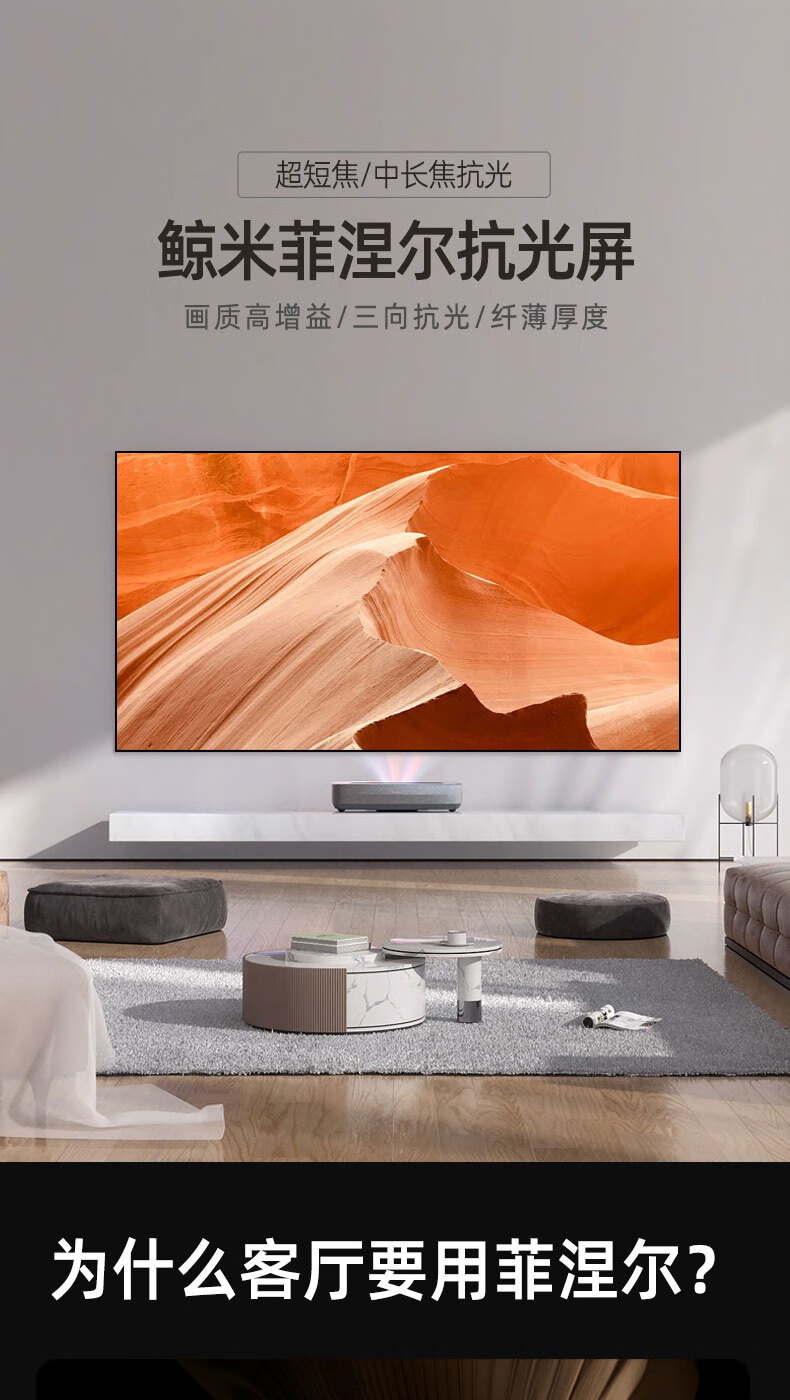 抗光性能优越 • 白天观影清晰:即使在白天阳光透过纱帘,或是屋内所有灯都打开的情况下,画面依然通透,基本不受影响,能清楚地看到画面中的各种细节,抗光率可达90%以上。 • 减少反光干扰:其扇形微观结构可以有效排除上方和左右方向的环境光干扰,减少屏幕反光,无论从哪个角度观看,都能获得清晰的画面。