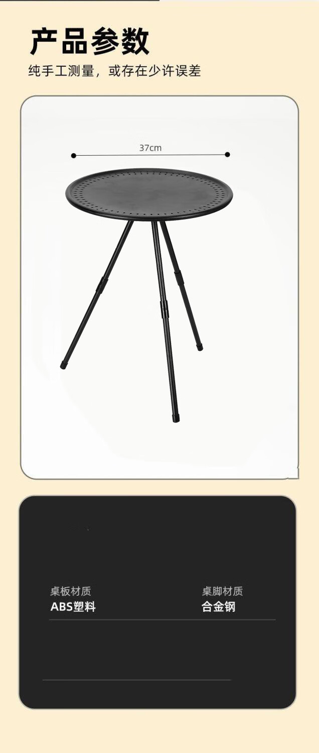 非常合适的户外小圆桌,轻便好携带,可调节高度,承重也不错,挺稳当的。放屋里做床头柜也是挺不错的。