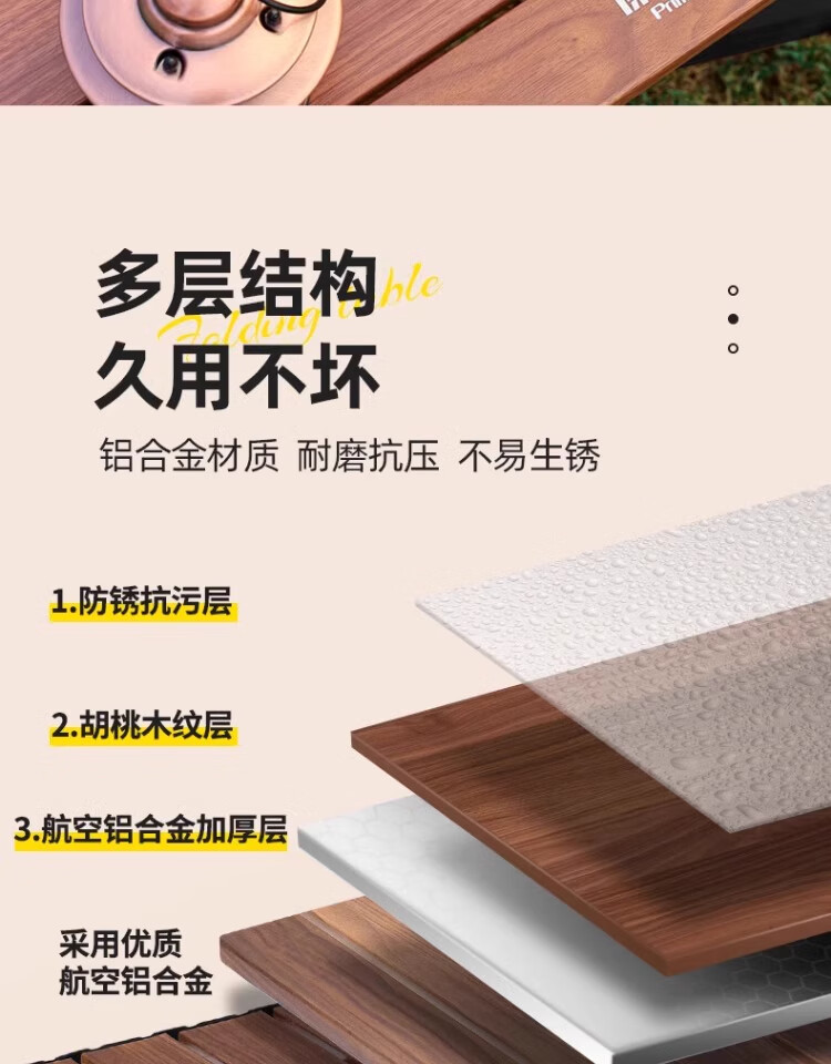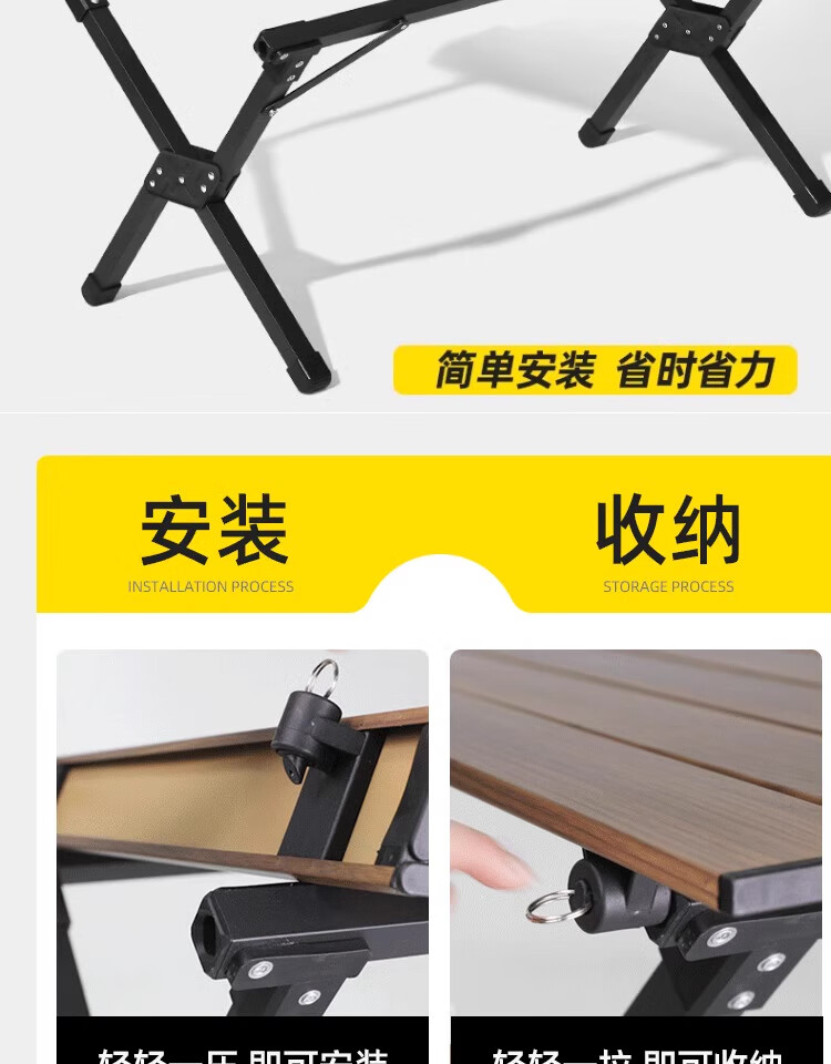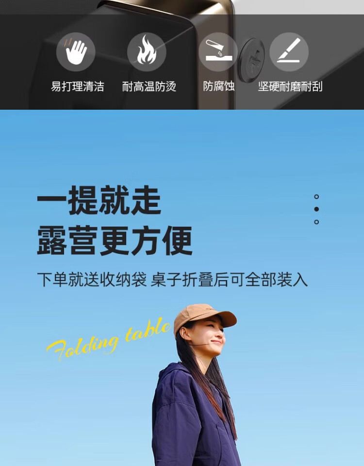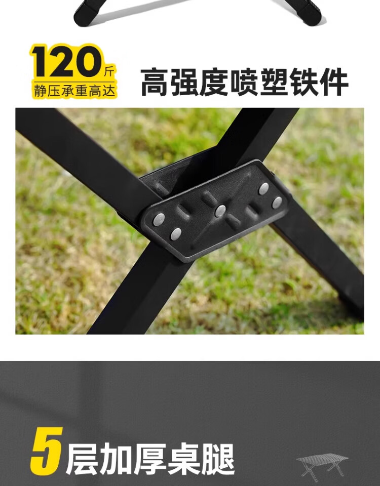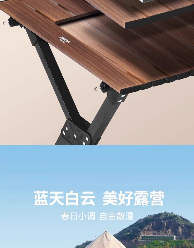 稳定性:强 收纳方便性:方便 承重能力:刚买的露营桌太棒了!轻便易携,材质坚固。桌面宽敞,能放好多东西。折叠设计方便收纳,不占空间。露营时搭起来超简单,稳定性也很好。整体外观简约时尚,和户外环境很搭。真心推荐给喜欢露营的朋友们,让户外生活更便捷舒适!