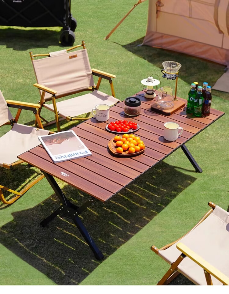 原始人蛋卷桌户外折叠桌便携式野餐桌椅露营装备用品野炊野营套装 铝合金120桌+加高木色克米特*4
