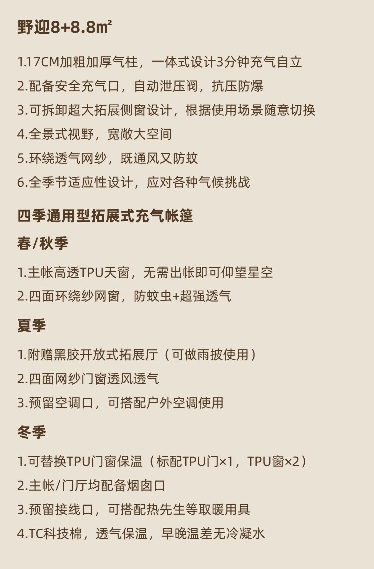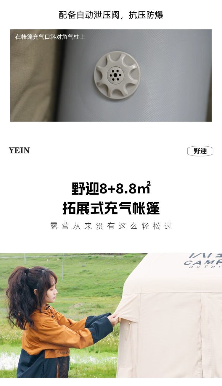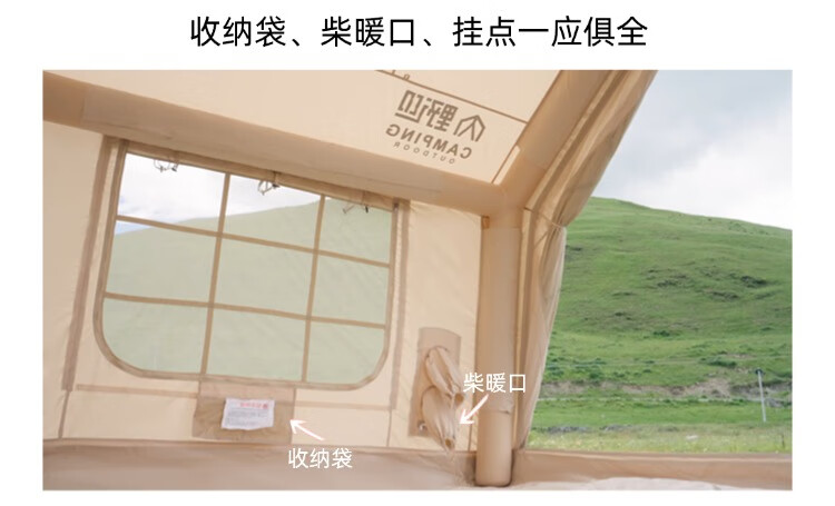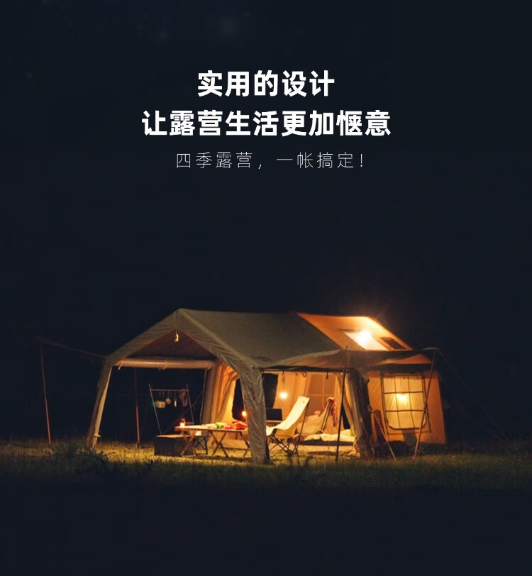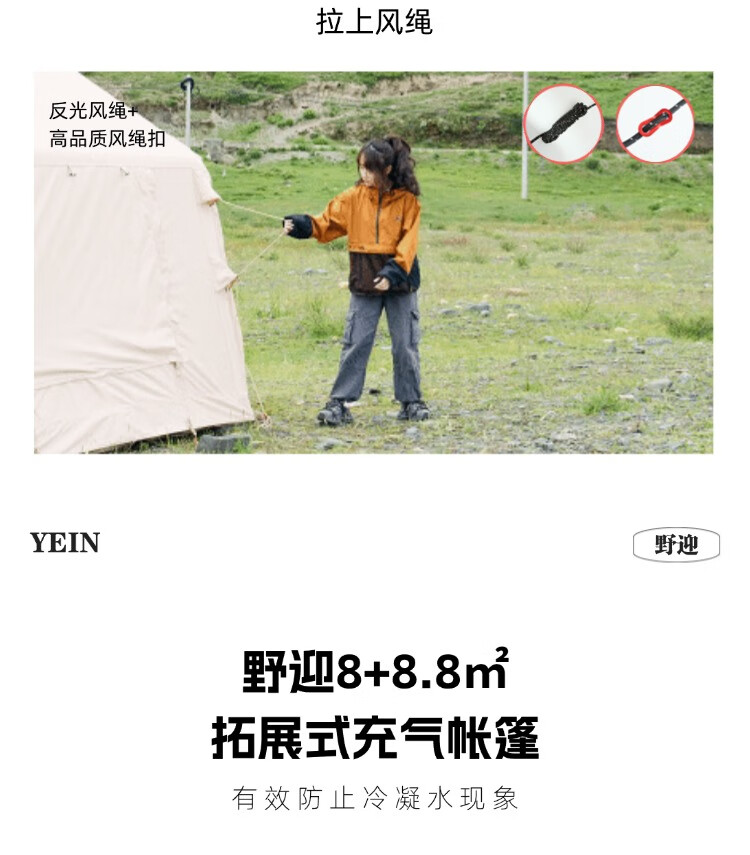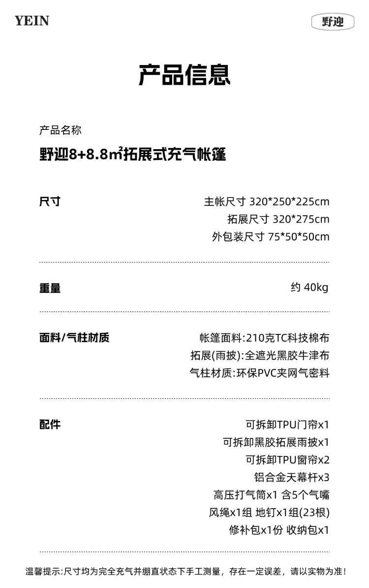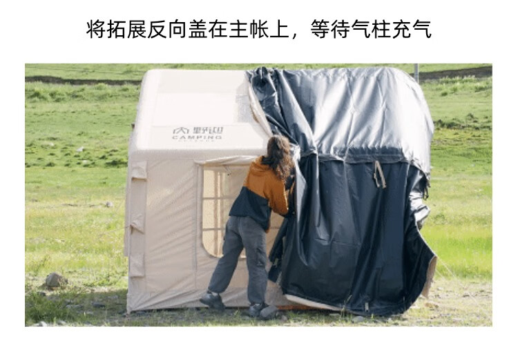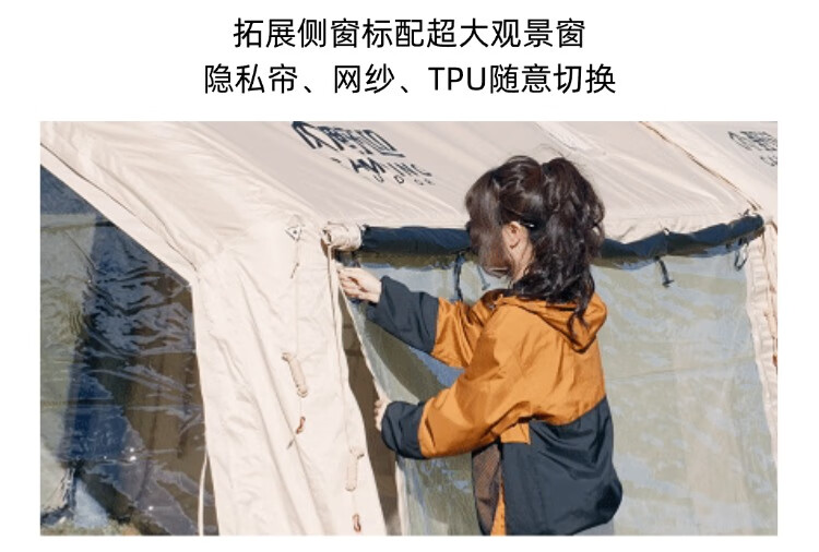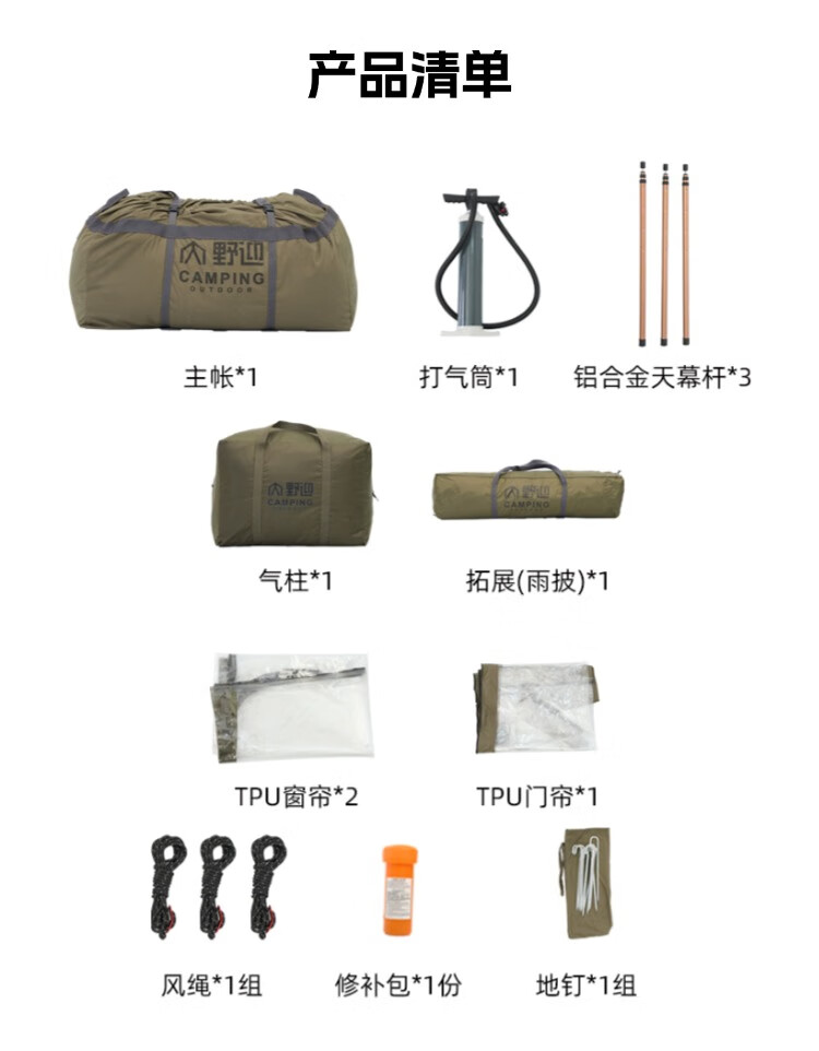 主帐、扩展厅*1,窗户TPU*2,地钉、风绳、打气筒*1,帐篷收纳包*1