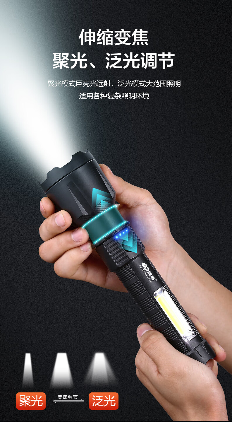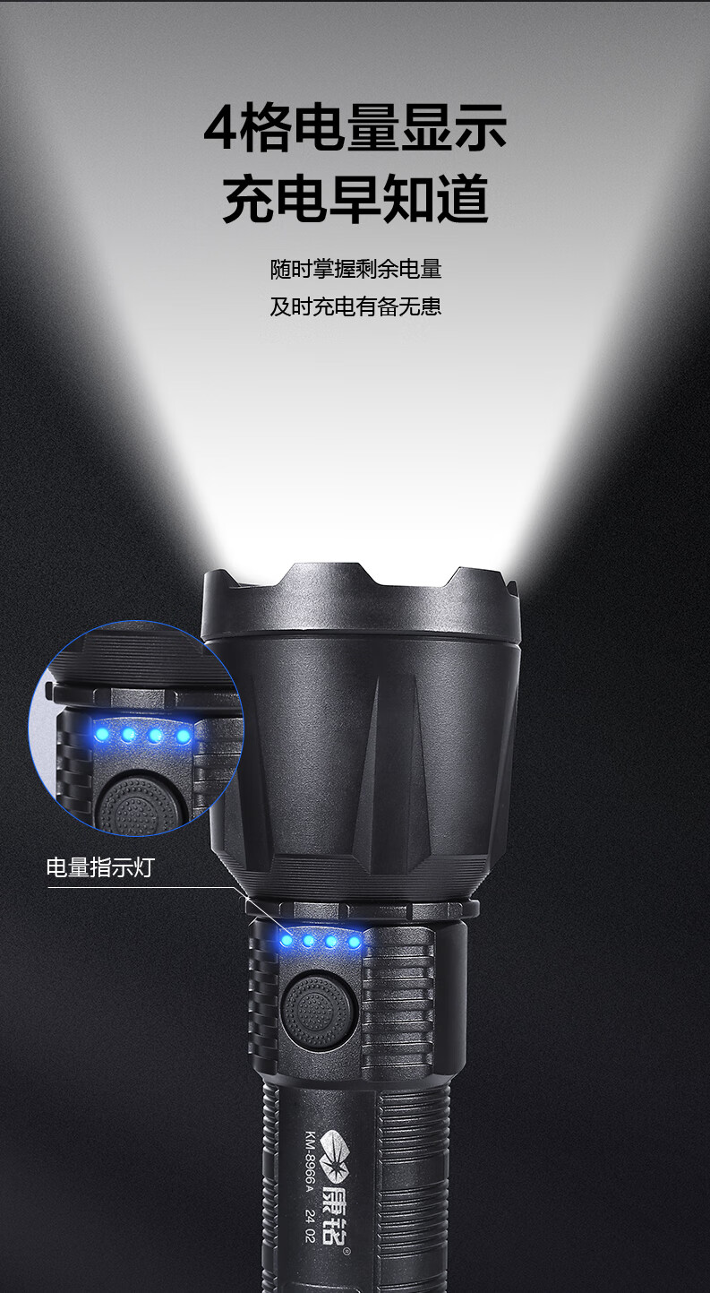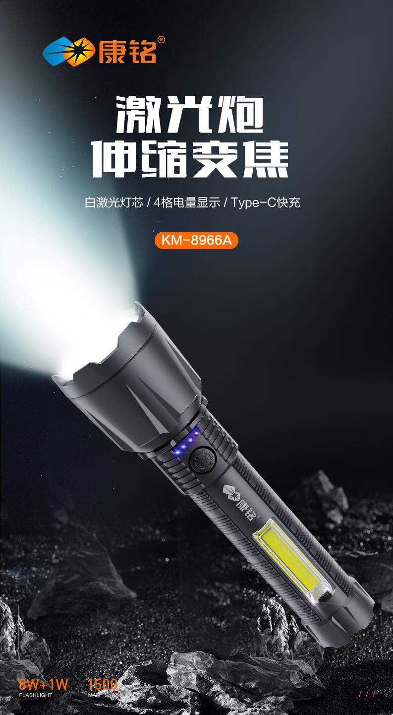 康铭伸缩聚焦手电筒强光led充电家用照明户外超亮手电超长续航应急灯 伸缩变焦+电量显示+激光灯珠+3000mAh+10W+LV005