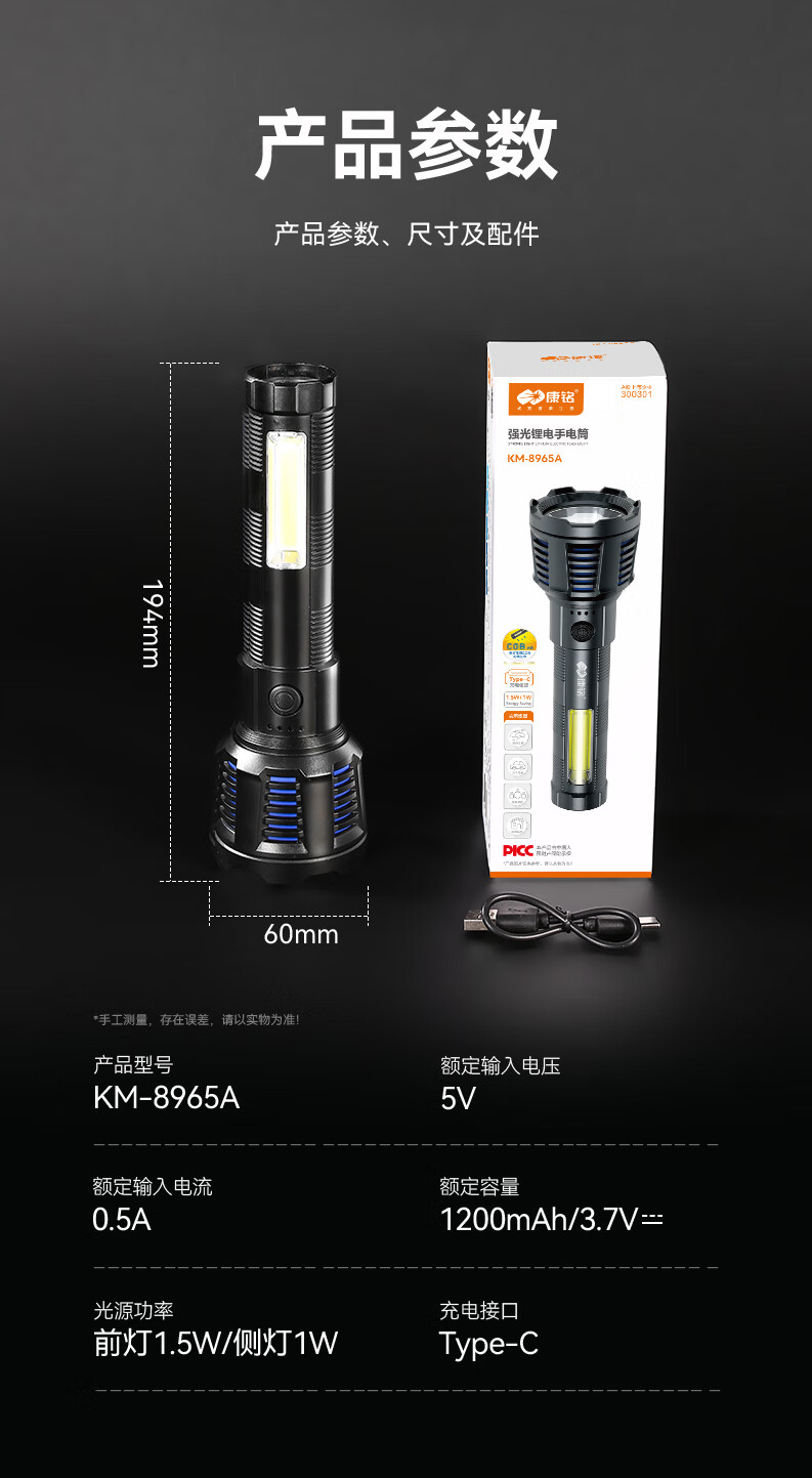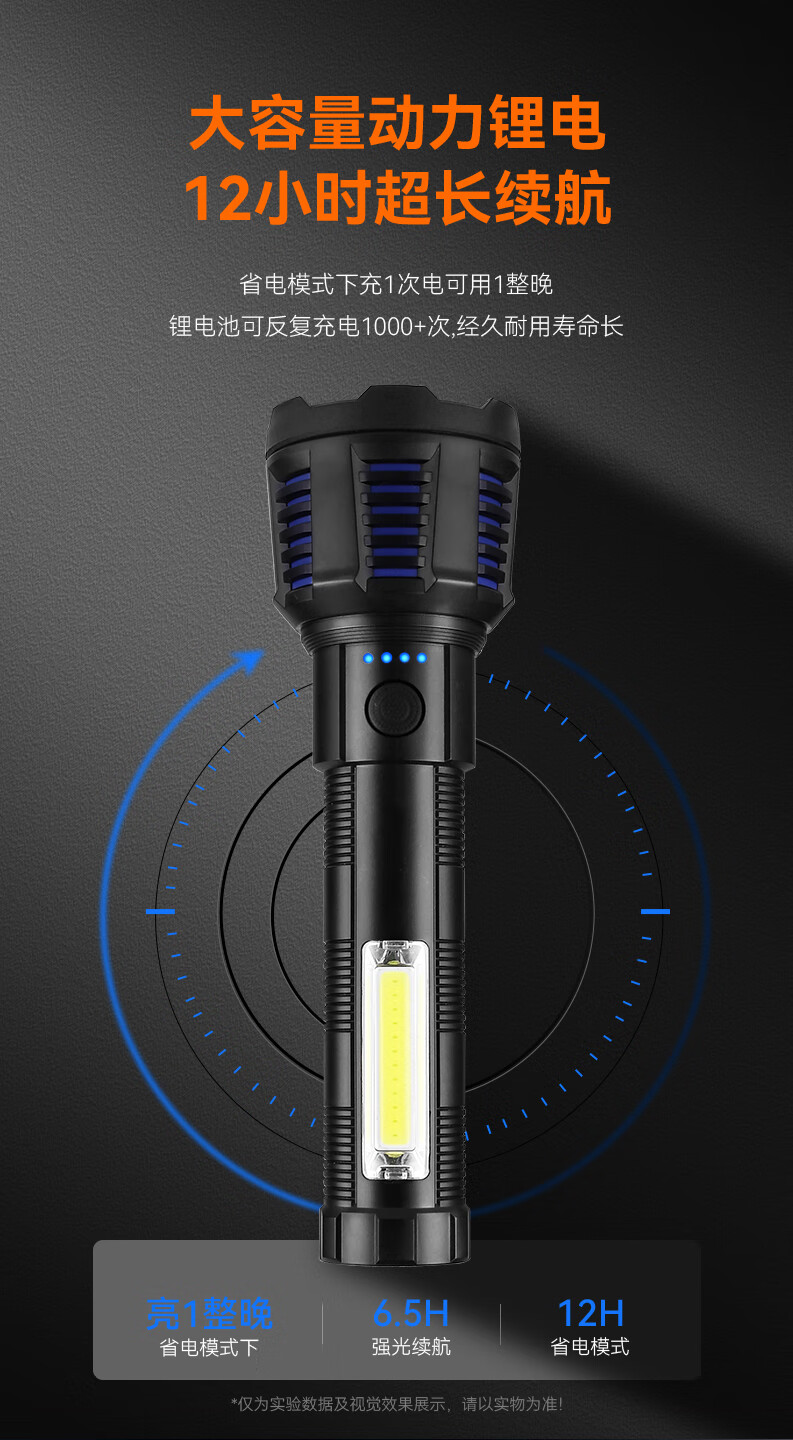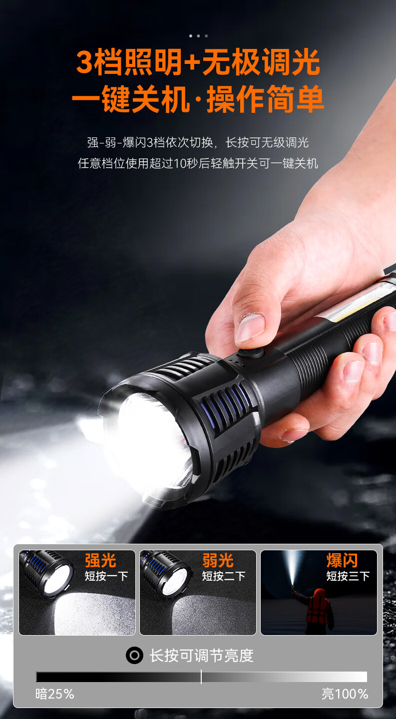 这款强光手电筒,用起来得体验很不错,光线很亮,光源很充足,非常适合在视野迷糊的时候使用,家中常备一个,以防遇到各种突发情况的时候