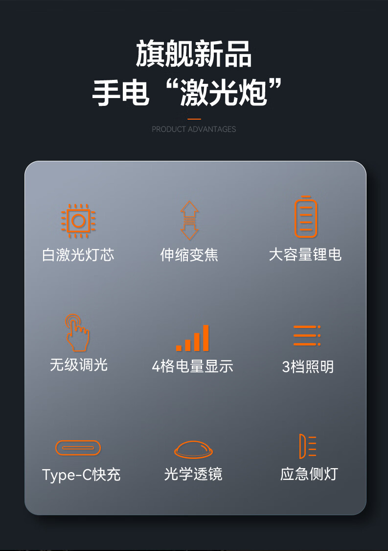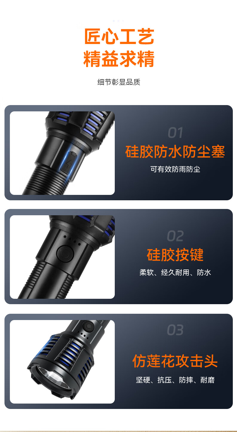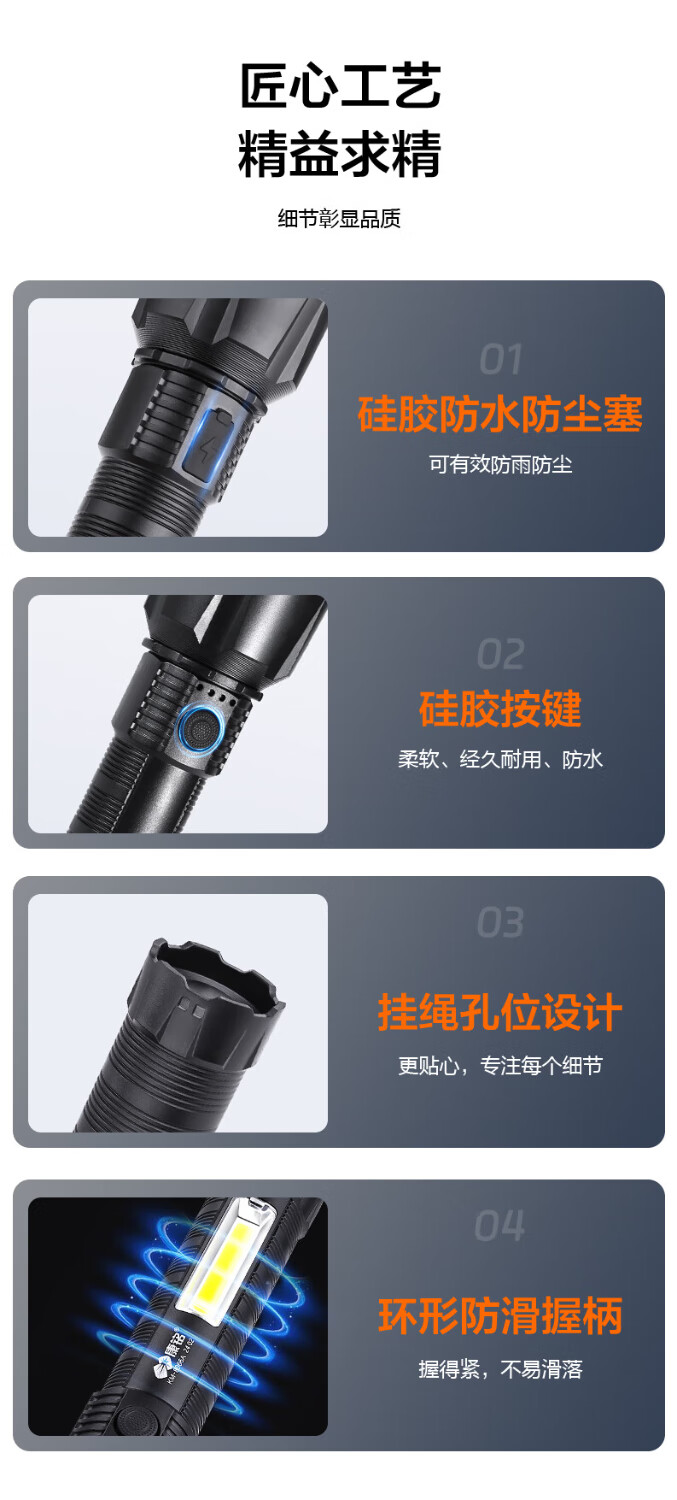 做工精致,大气,与时俱进,调节光圈方便。充电也十分方便,有多种功能,4个档位。充满电后使用起来照射效果非常好,亮度强劲!