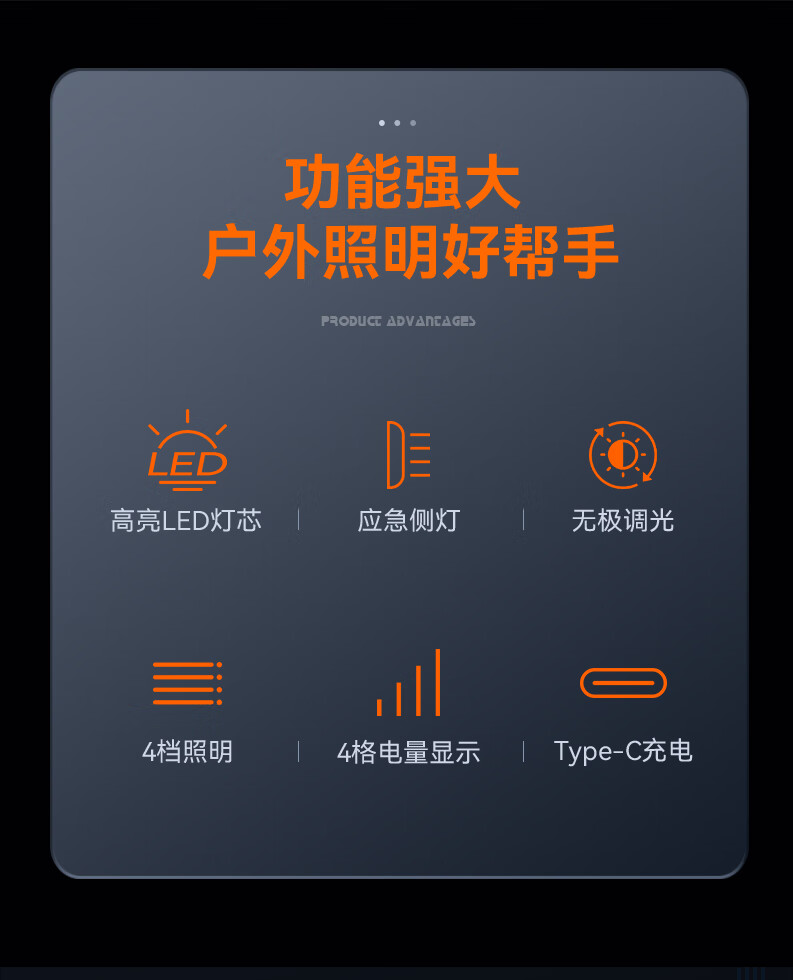 特别喜欢的手电筒 亮度可以随意调节 产品材质:结实耐用 光照强度:有三个亮度 续航时间:有好几个小时大概是 5个小时 产品重量:非常好 电源类型:可以充电的锂电池 其他特色:有可以系绳子的孔的设计