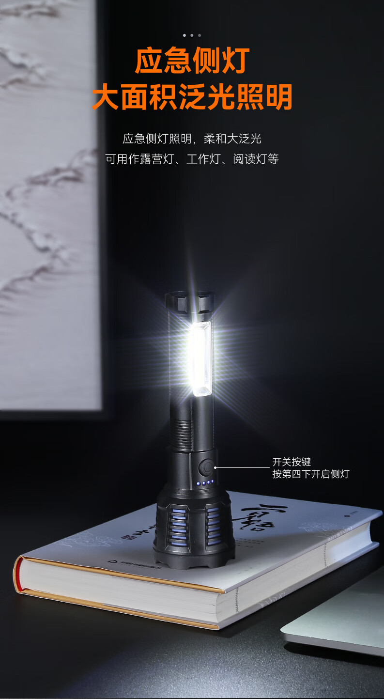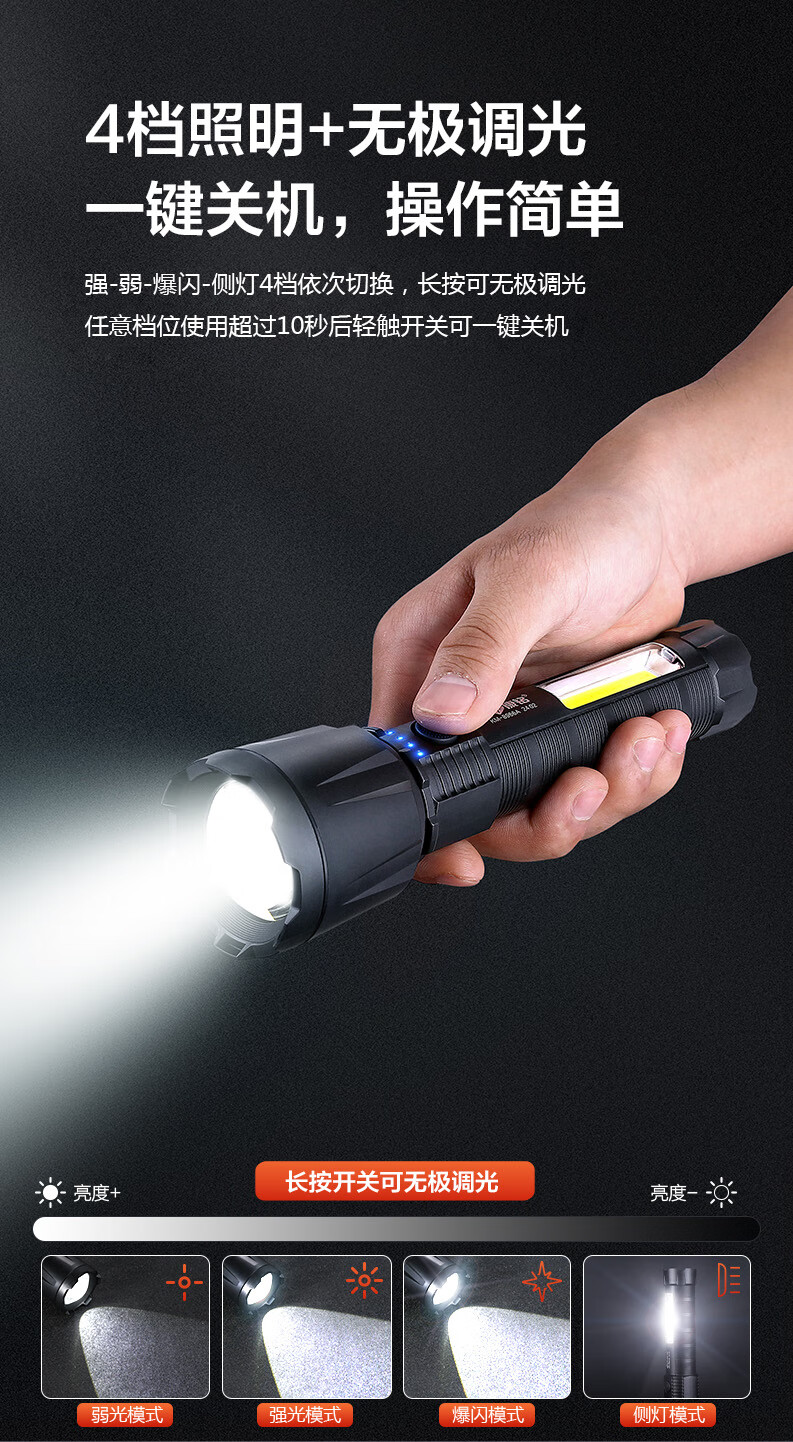 超级喜欢的手电筒 可以充电 变三种光 还可以无极变光 还有侧灯开启 可以用绳子绑住挂起来 轻巧的那种 超级喜欢好看 又再次回购了一个 续航时间:比较长 产品重量:轻巧的 光照强度:比较亮的那种