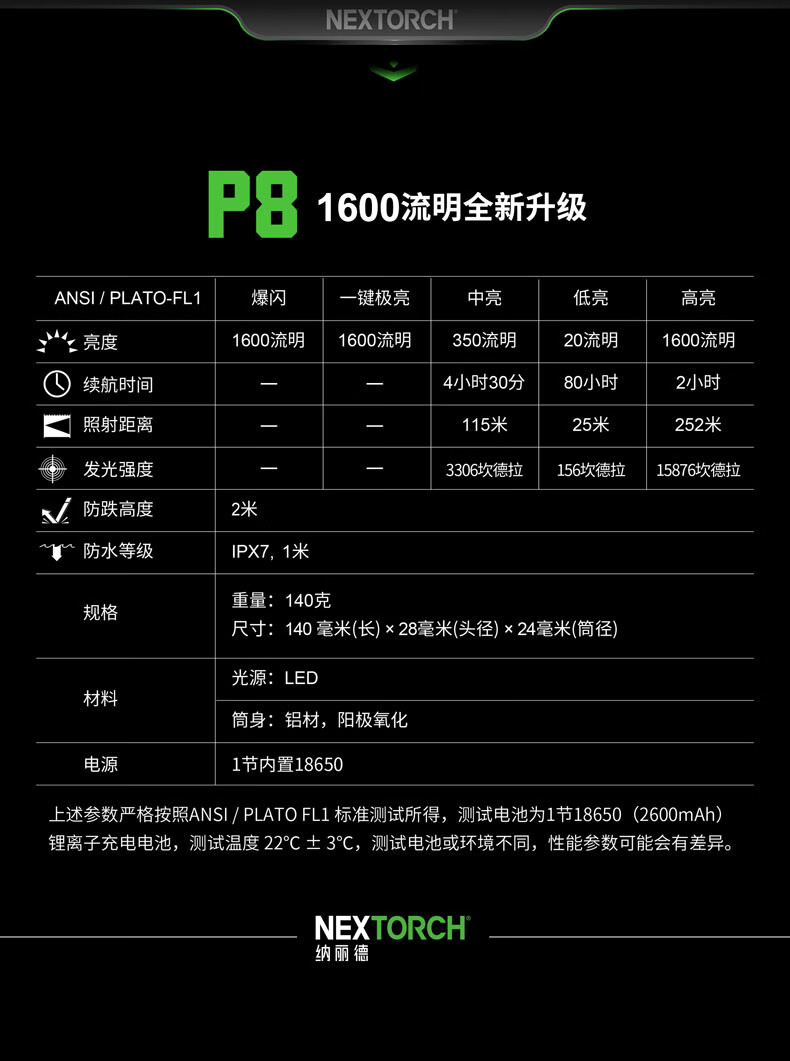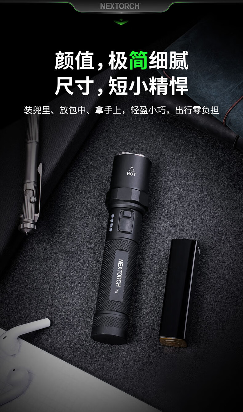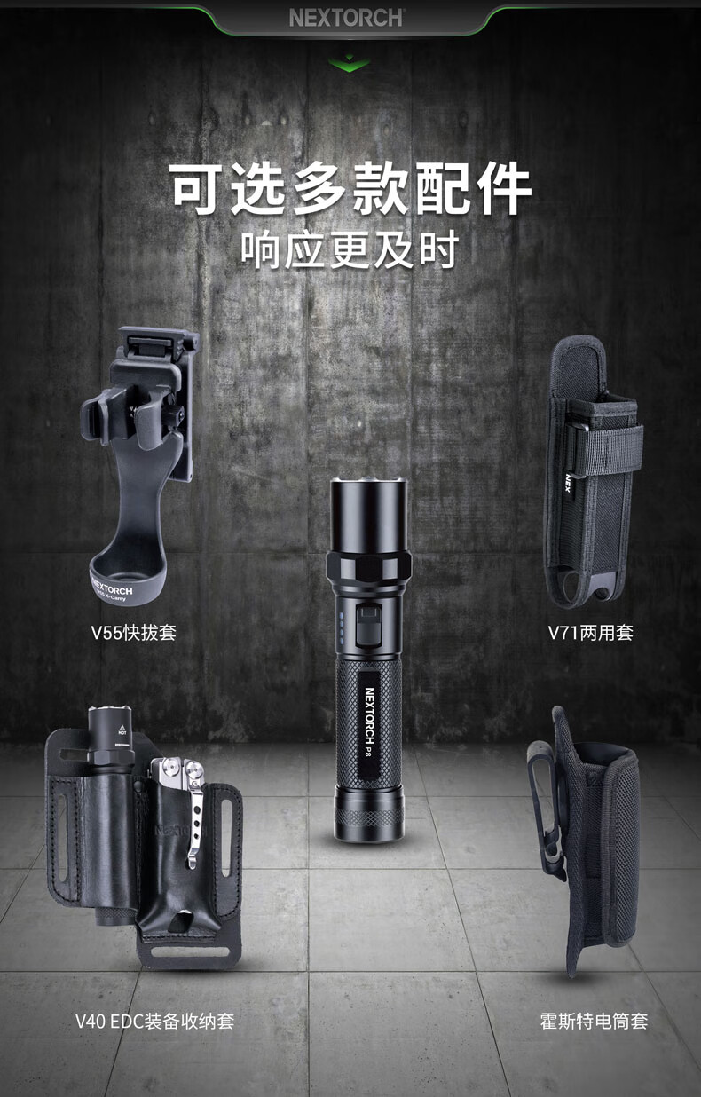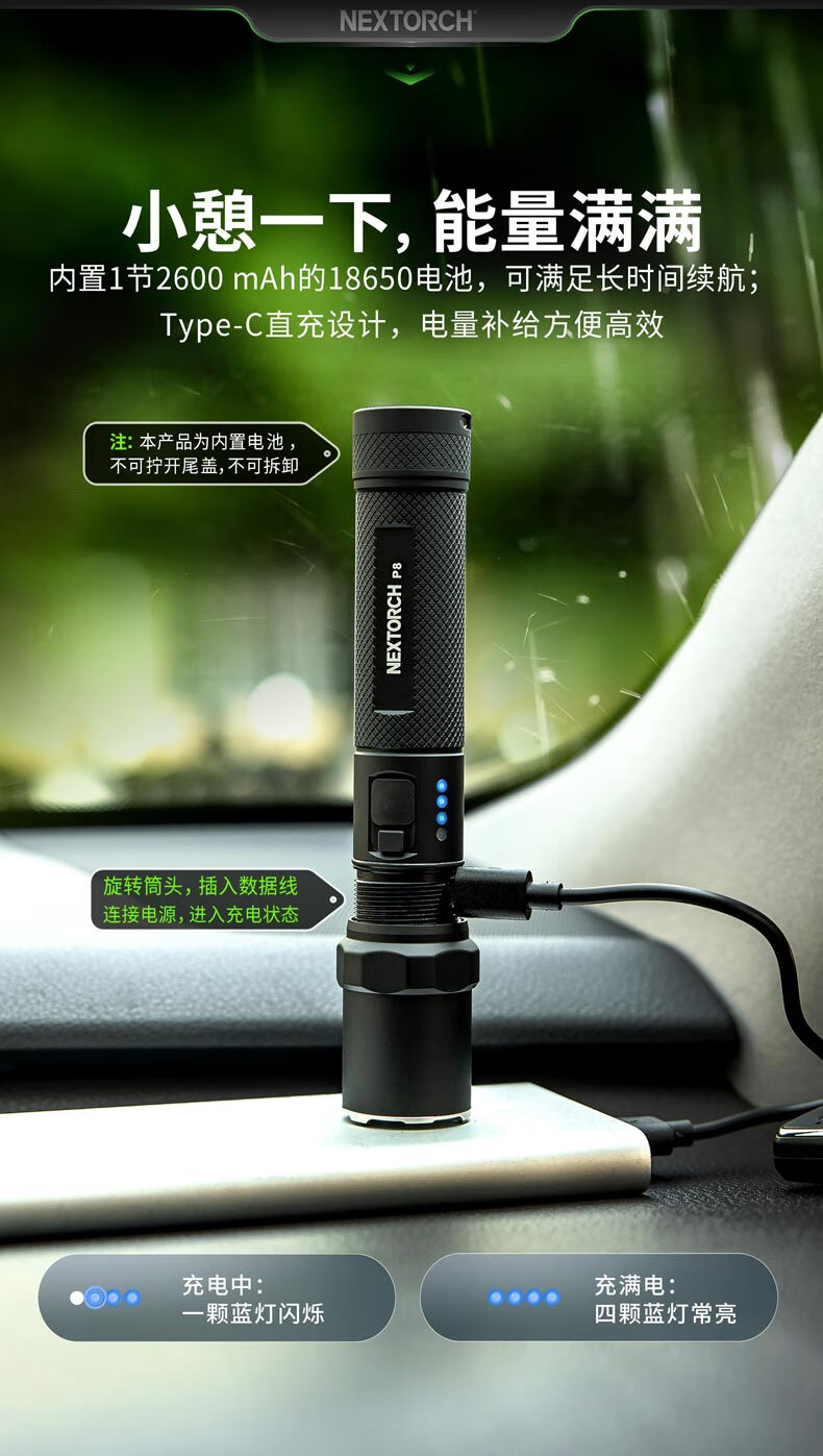 纳丽德(NEXTORCH) P8强光远射手电筒战术一键爆闪高亮1600流明Type-c充电应急 P8标配(升级版1600流明)