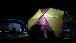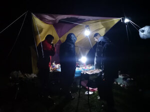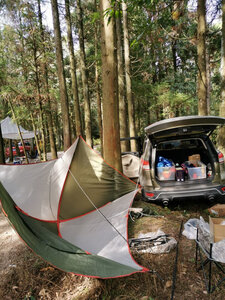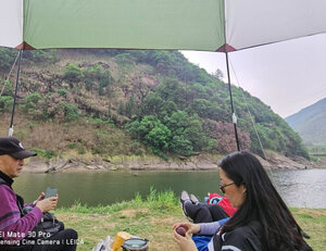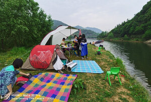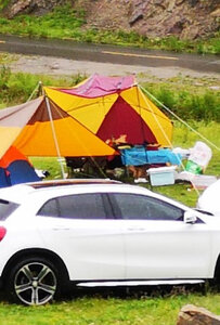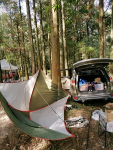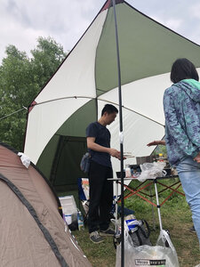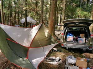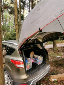 这个小长假终于派上用场,效果比预想的好的多。首先,比照片里显示的要大,这次没有和车尾连接,一侧直接固定在地面,但就这样,竖起桌椅,生火做饭也很从容;第二防雨水效果也不错,午后开始下起中雨,大伙儿纷纷躲进棚子里,惬意的看着周边的山水,任他风雨飘摇。