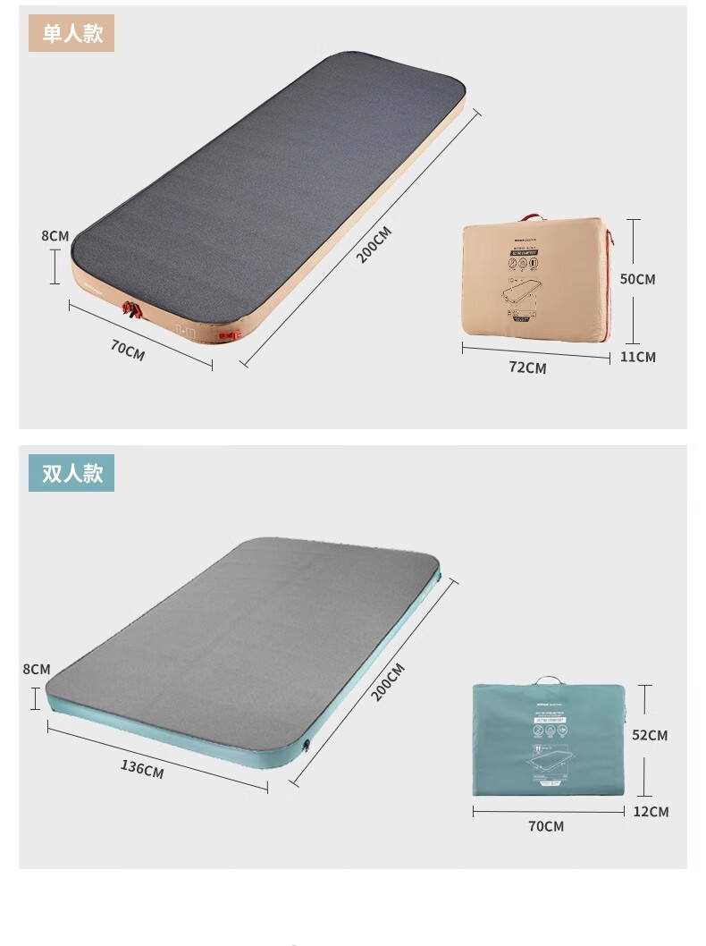 如果你跟我一样经常露营过夜,春秋冬都过夜 露营,那推荐迪卡依这款,单人双人都有,收纳 其实不错,豆腐块收纳,比传统以前那种圈起来 的圆柱体好携带,气打足点承重也非常好。重 点中的重点是R值非常高,秋冬露营不用担心冷