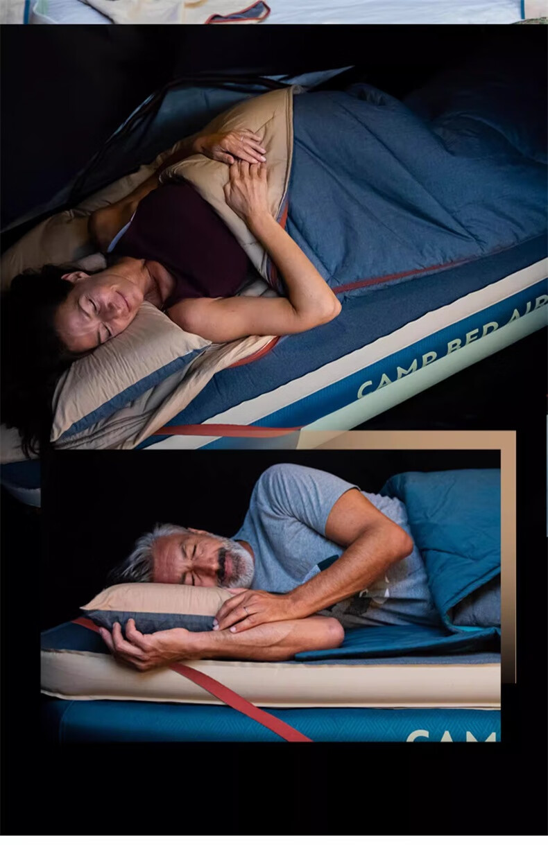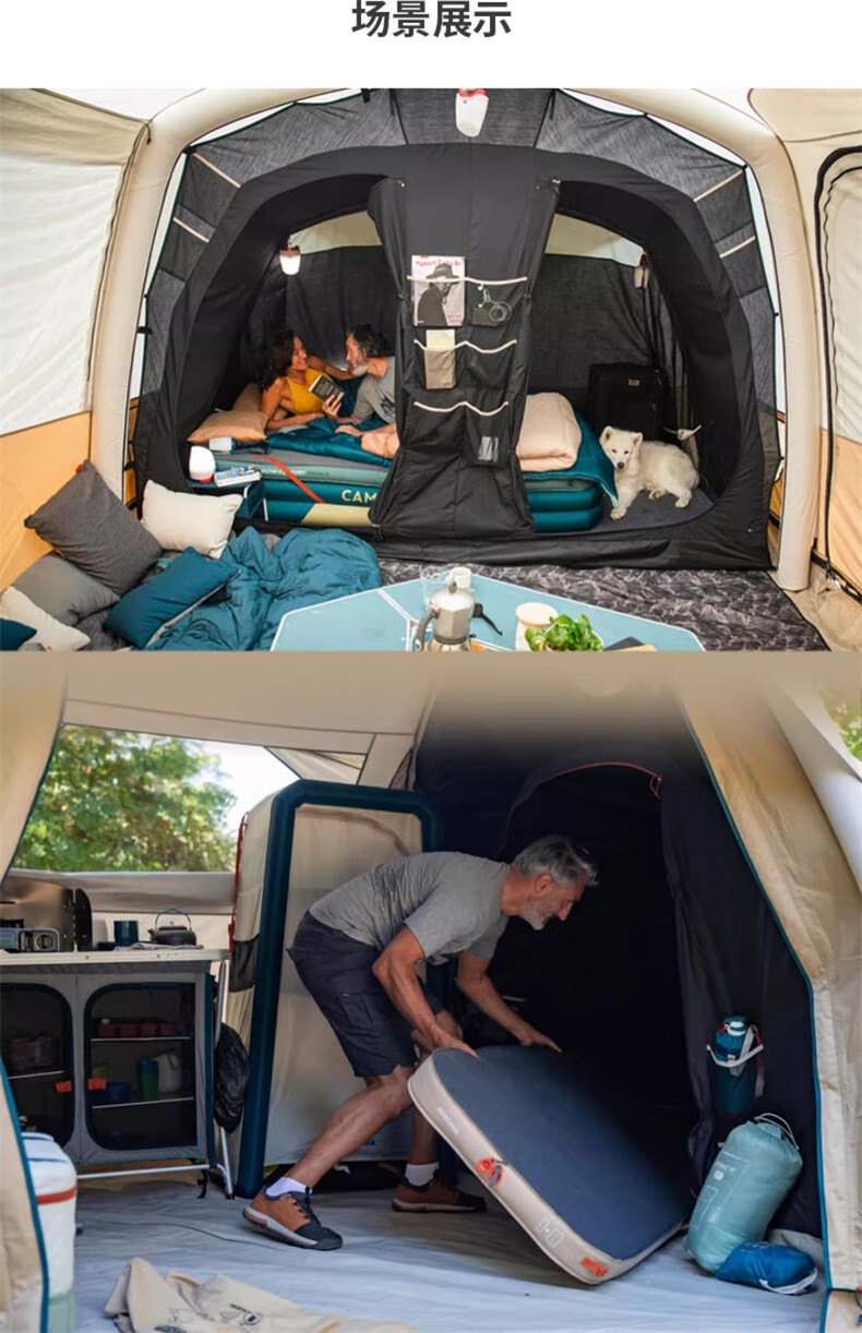 防水效果:材质特厚,防水防潮是肯定的 适用场景:户外旅行,办公室休息,家中来客人临时使用,都很好 容纳人数:两个拼一起1.4米宽,两人用完全够 展开类型:充气展开,搭配迪卡侬带压力计的气筒使用 便携性能:详情页有收纳尺寸,出行看个人感受,总体绝大,但舒适感强 透气效果:透气主要看搭配的床垫,床架本身是镂空的