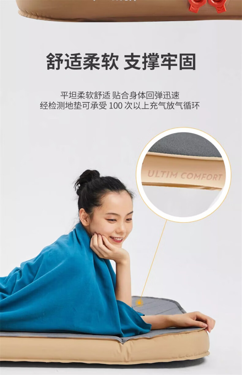 - 重量轻:便于携带,无论是户外露营、长途旅行还是日常出行,都不会给使用者增加过多的负担。 - 体积小:在未充气状态下可以折叠或压缩,收纳起来体积很小,能够轻松放入背包、行李箱的角落或者挂在背包外面,不占太多空间,方便随时取用。 2. 舒适性较好: - 人体工程学设计:采用了符合人体工程学的设计,能够较好地贴合人体颈部和头部的曲线,为头部和颈部提供良好的支撑,有助于缓解疲劳,让使用者在休息时感到更加舒适。 - 面料舒适:枕套的面料通常柔软亲肤,即使直接接触皮肤也不会产生不适感。 - 气压可调节:使用者可以根据自己的需求和喜好调节枕头的充气程度,从而找到最适合自己的舒适度。 3. 耐用性强: - 材质优良:使用高质量的材料制作,具有较好的耐磨性、抗撕裂性和防水性,能够保证枕头在长期使用过程中不易损坏。 - 做工精细:缝合工艺精细,气阀等部件的质量可靠,减少了漏气等