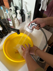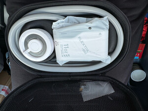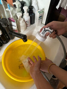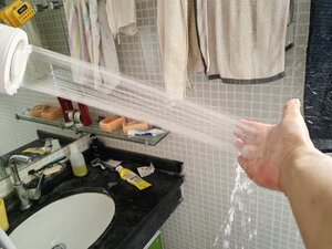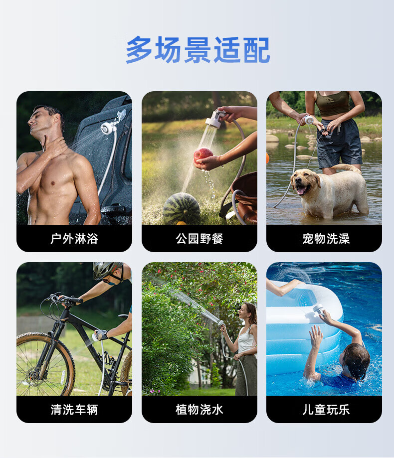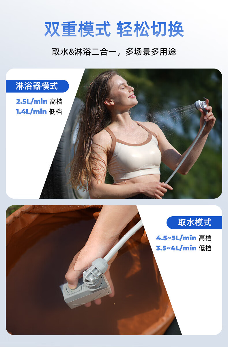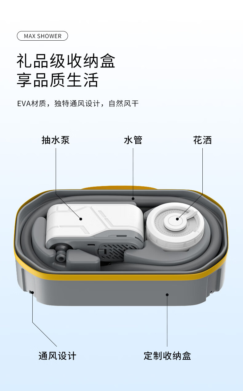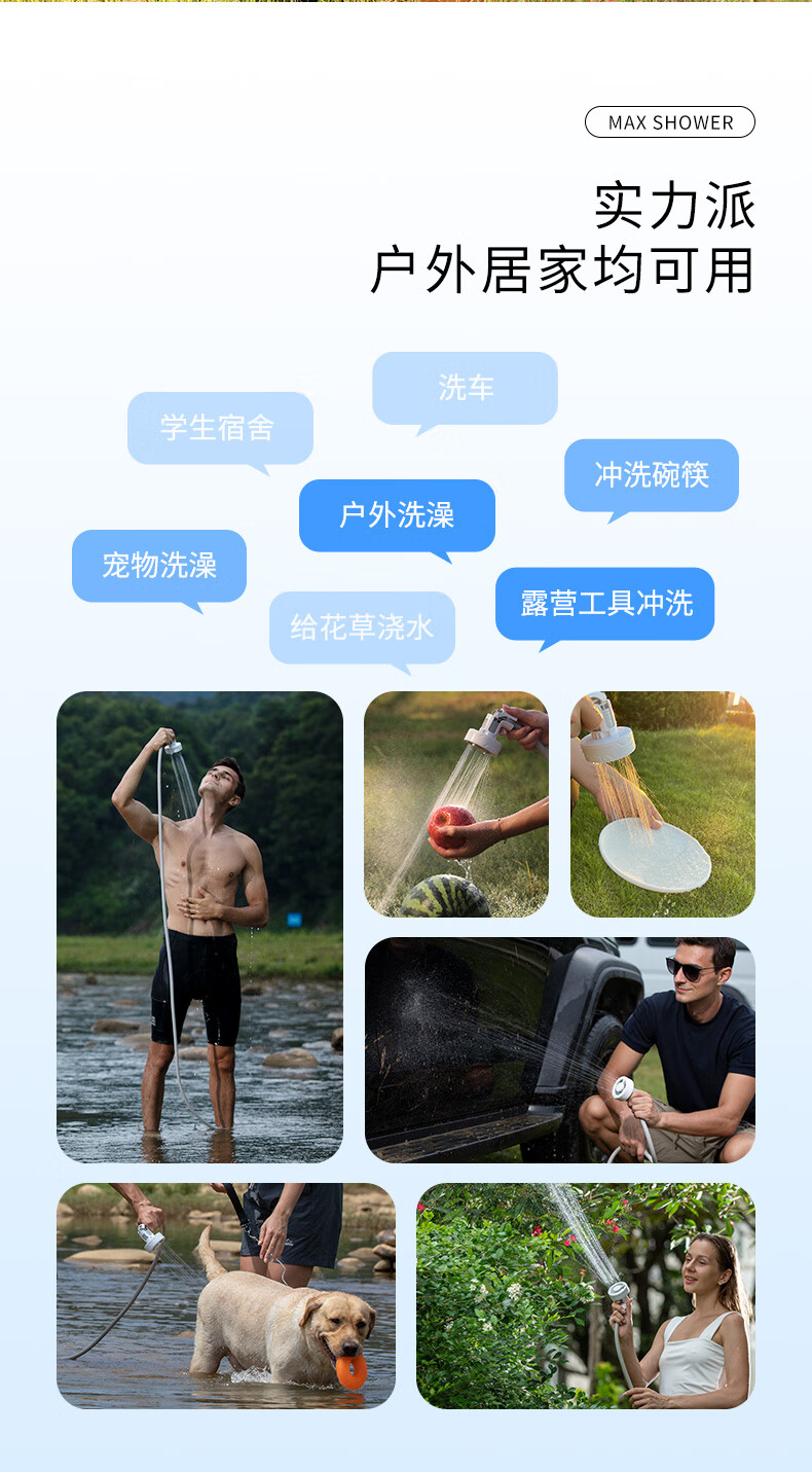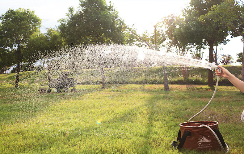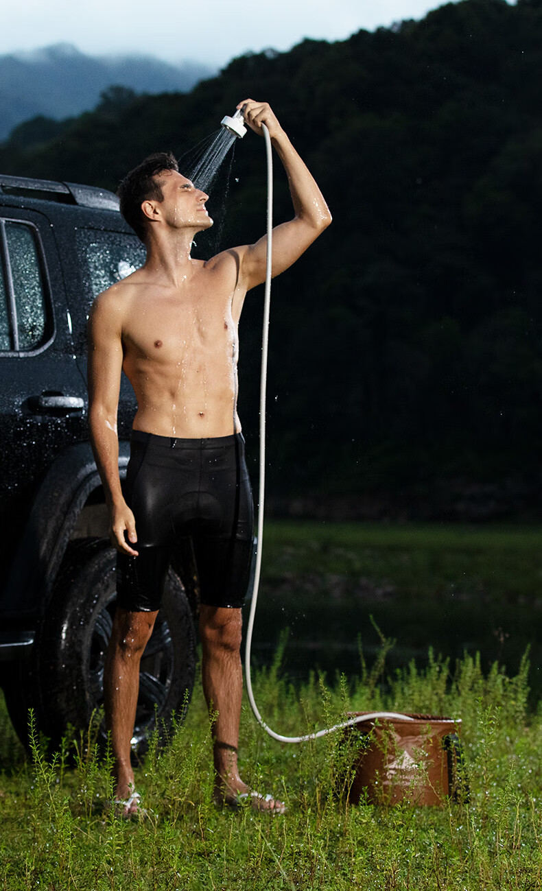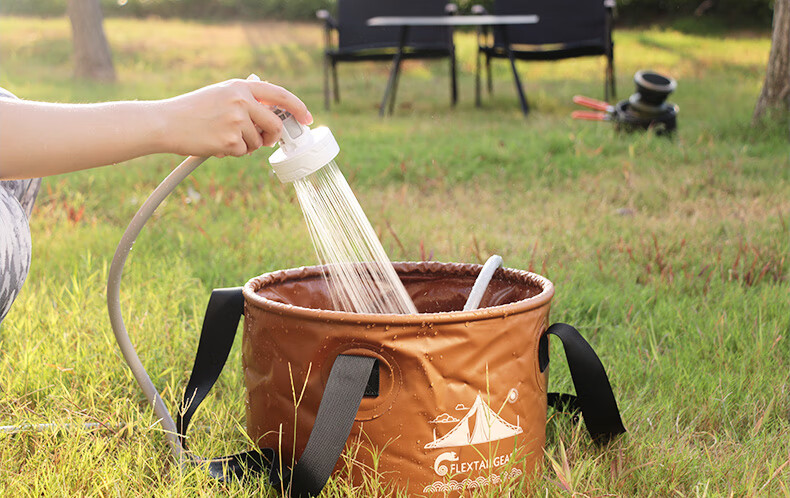 产品材质很精细,设备很小巧,礼品盒比较大!特意在洗手间测试了一下,最高档位15-20升水得8-10就会用完,应急冲澡没问题,要精细的洗澡和给狗狗洗澡怎么得加三五次水!水压比较细腻柔软,冲澡或浇花够用,给冲洗自行车或汽车灰尘污垢水压肯定不够的!特意单独配了这种能折叠有有盖子的水桶,考虑到户外洗澡的话不会落灰进虫子!