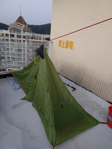 挺好的,很轻,一个人睡空间也够,周末在楼顶试了一下,楼顶不能打地钉,只好用水桶和花盆将就一下。无杆帐篷轻量化,就是有点考验搭帐篷技能。