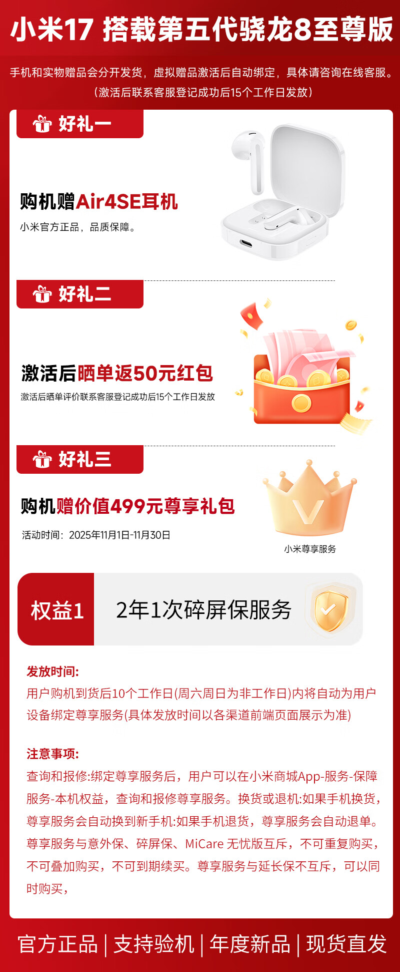 小米(MI)Xiaomi 17 新品旗舰手机 专业影像 小米5G手机-专享版 冰融蓝 12GB+256GB 官方标配