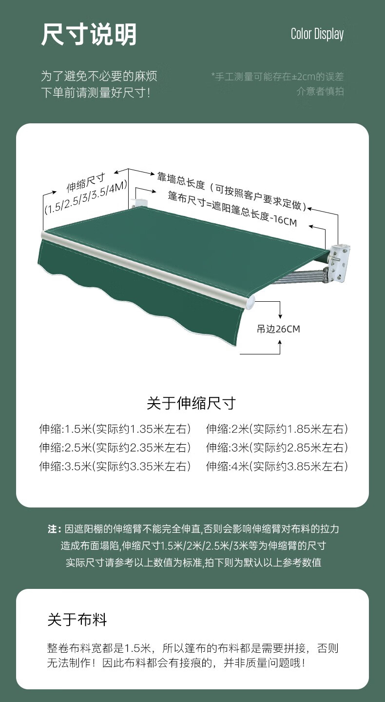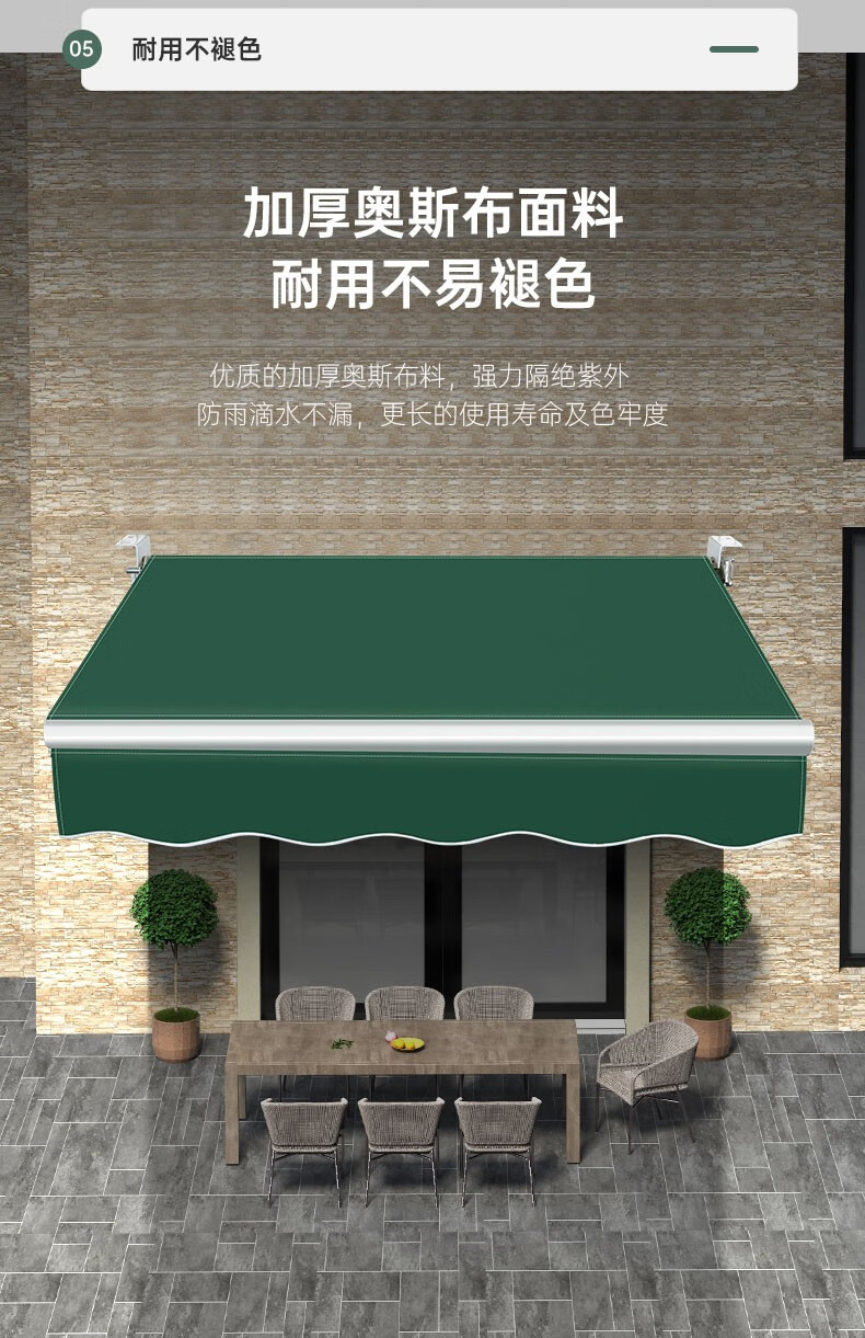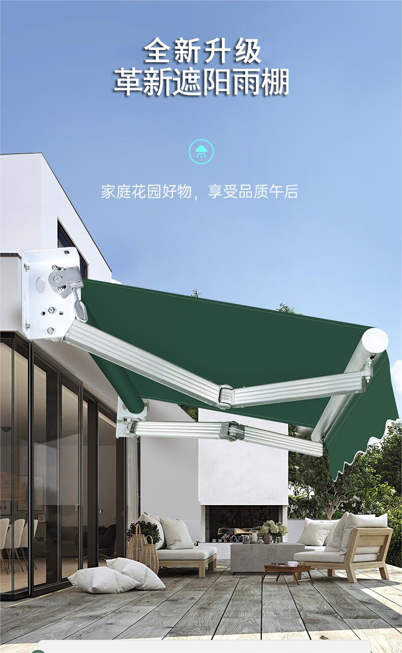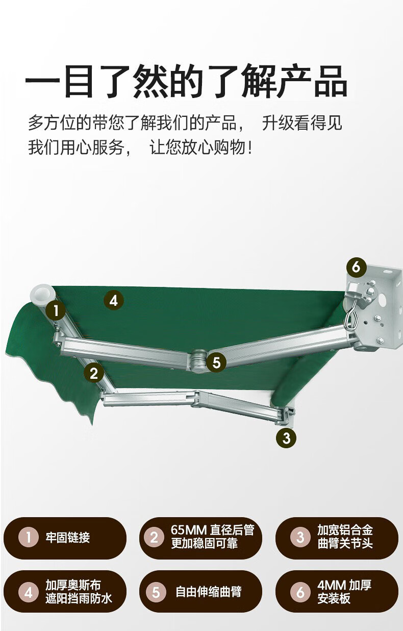 产品功能:伸缩棚挡雨,挡太阳 外观材质:伸缩臂加厚,布料加厚 商品品质:质量好 客服热情耐心,好评