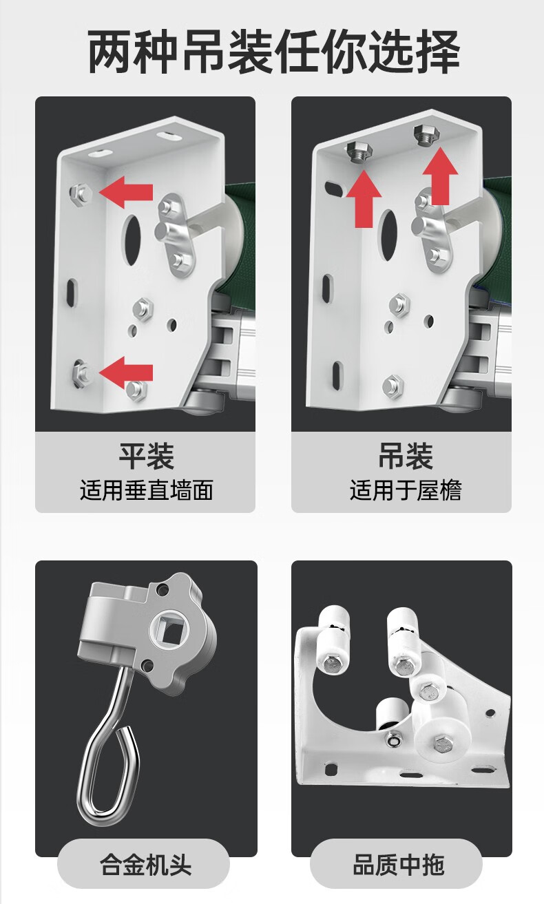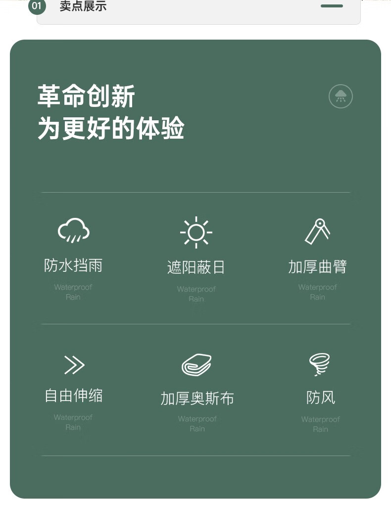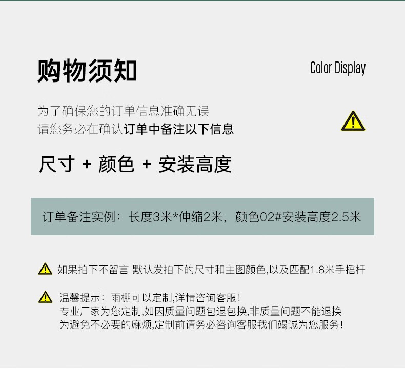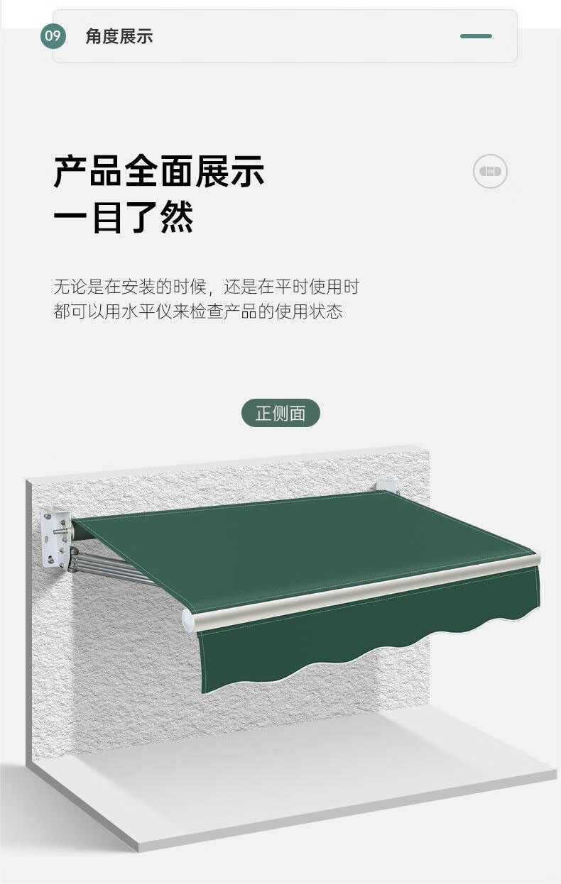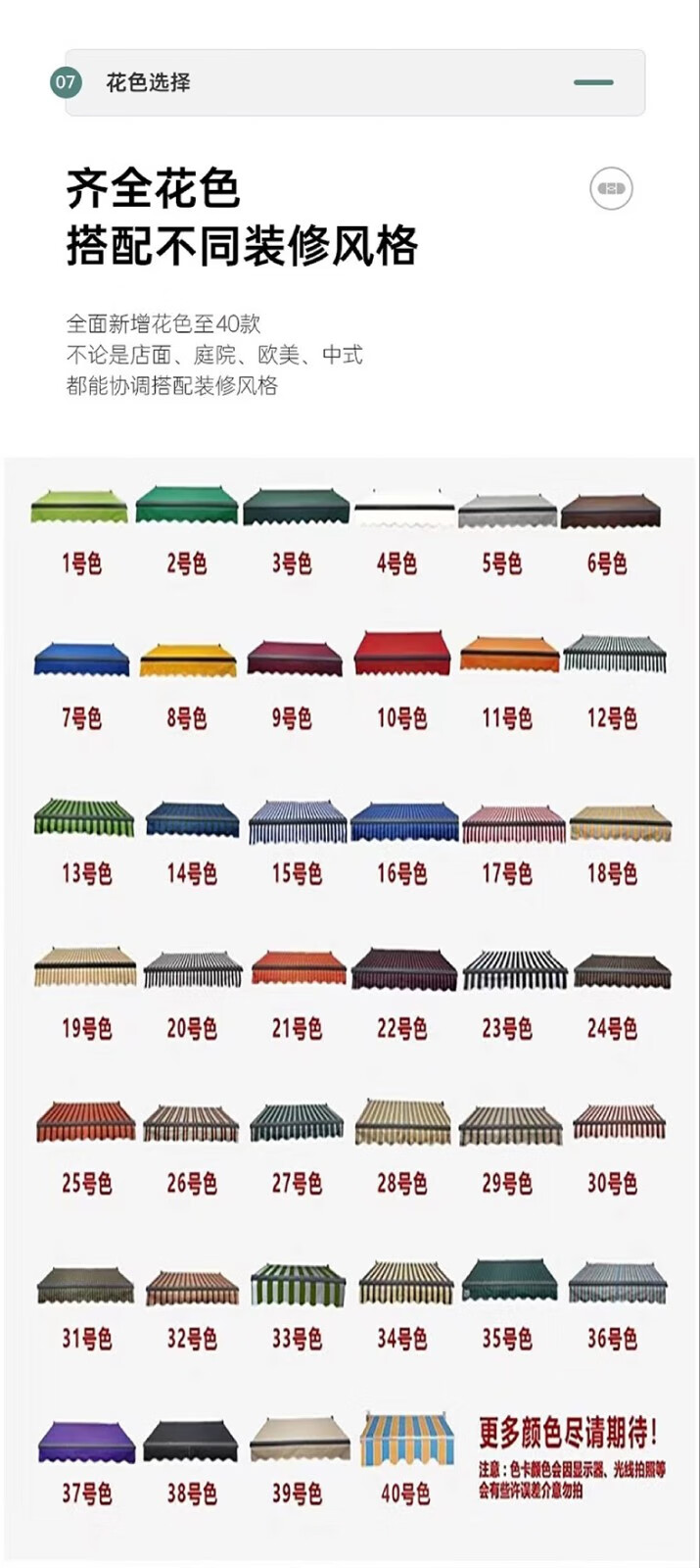 产品功能:伸缩棚挡雨,挡太阳 外观材质:伸缩臂加厚,布料加厚 商品品质:质量好 客服热情耐心,好评