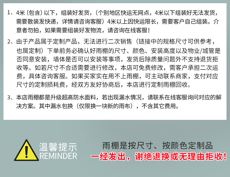宝贝收到,质量非常好,用料扎实,遮阳防雨效果非常好,安装简单,在京东上找了好多家,不负所望,老板很热情,以后会推荐给有需要的朋友们!祝老板生意兴隆!非常满意的一次购物! 产品功能:实用简单 外观材质:质量上乘 商品品质:用料扎实