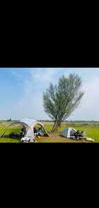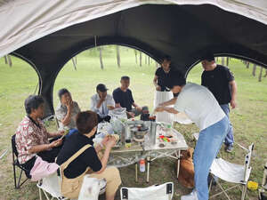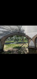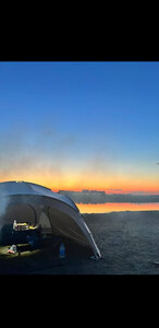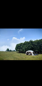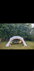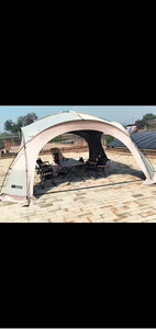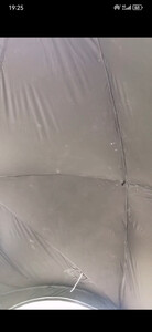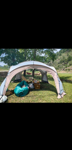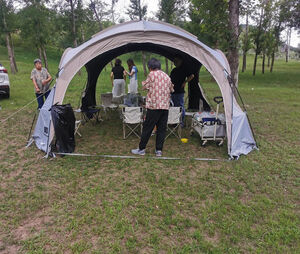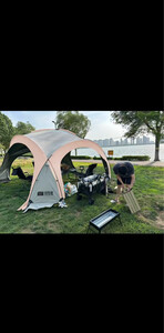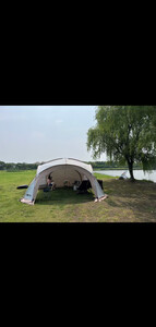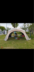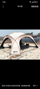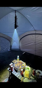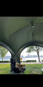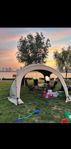 天幕搭建步骤很简单,里面空间很大,装10个人完全没问题,防风性也很好,美中不足是天幕顶有几处透光,黑胶没涂均匀,但也不太影响使用