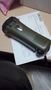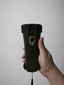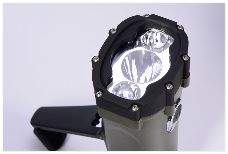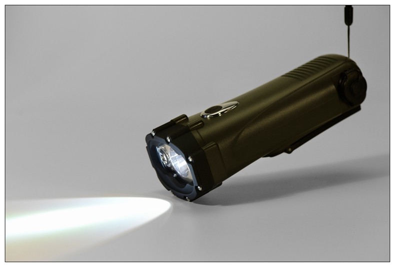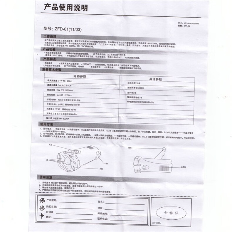 1、照明使用:一手握住主体,一手摇动摇柄,DC座边的充电指示会点亮,以2.5-3圈/秒的速度手摇一分钟后,按下开关按键,四次一循环:2个Φ5发光管亮——1W发光管亮——1W发光管闪——全灭。