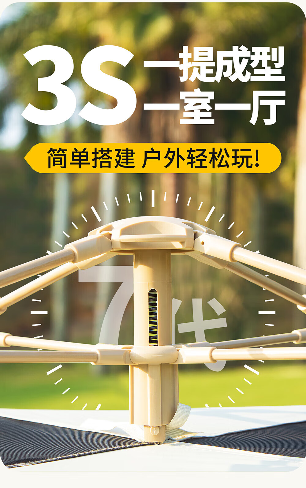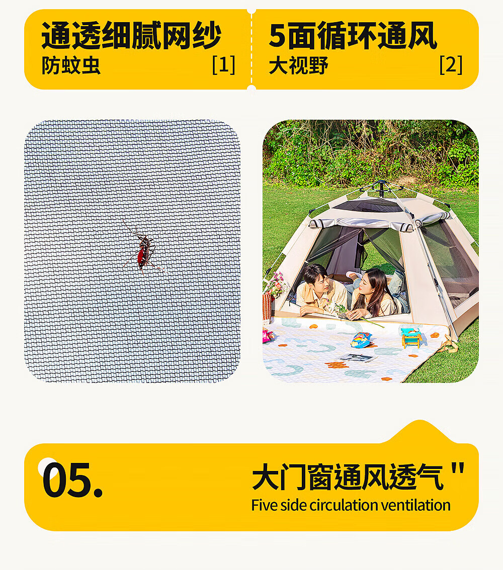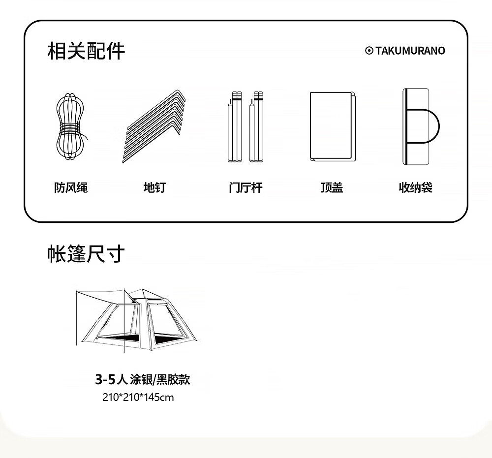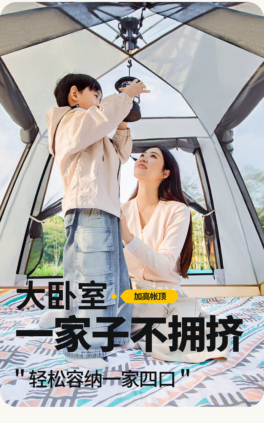 快速搭建功能 采用全自动速开设计,帐篷和天幕均可轻松一拉即开,省时省力 适合需要频繁搭建拆卸的露营场景 空间配置 防潮垫规格为4-6人用铝膜防潮垫,提供充足的地面保护 3-5人帐篷容量适合中小型团队出行 落地大窗和防蚊纱窗设计提升通风性和实用性