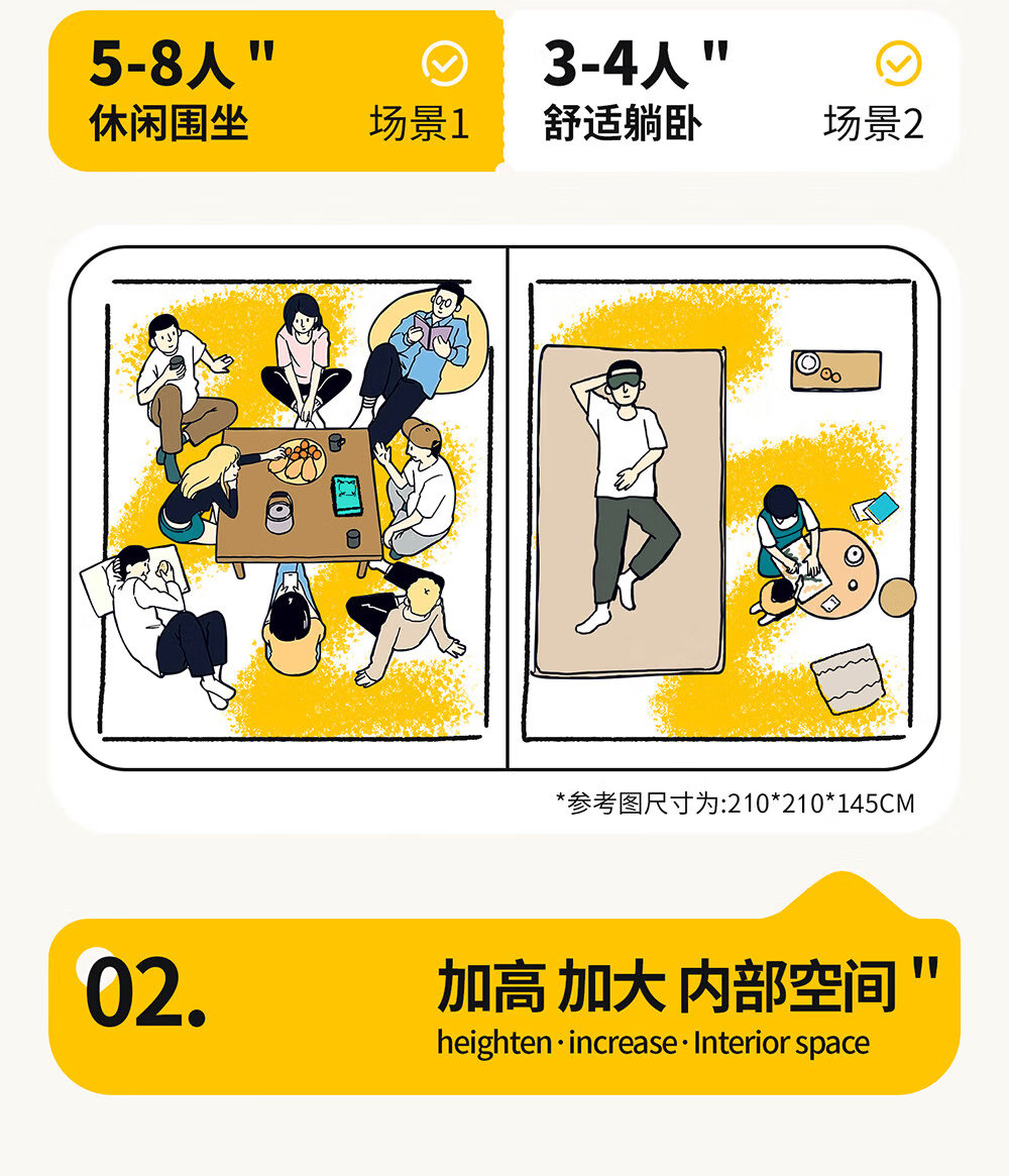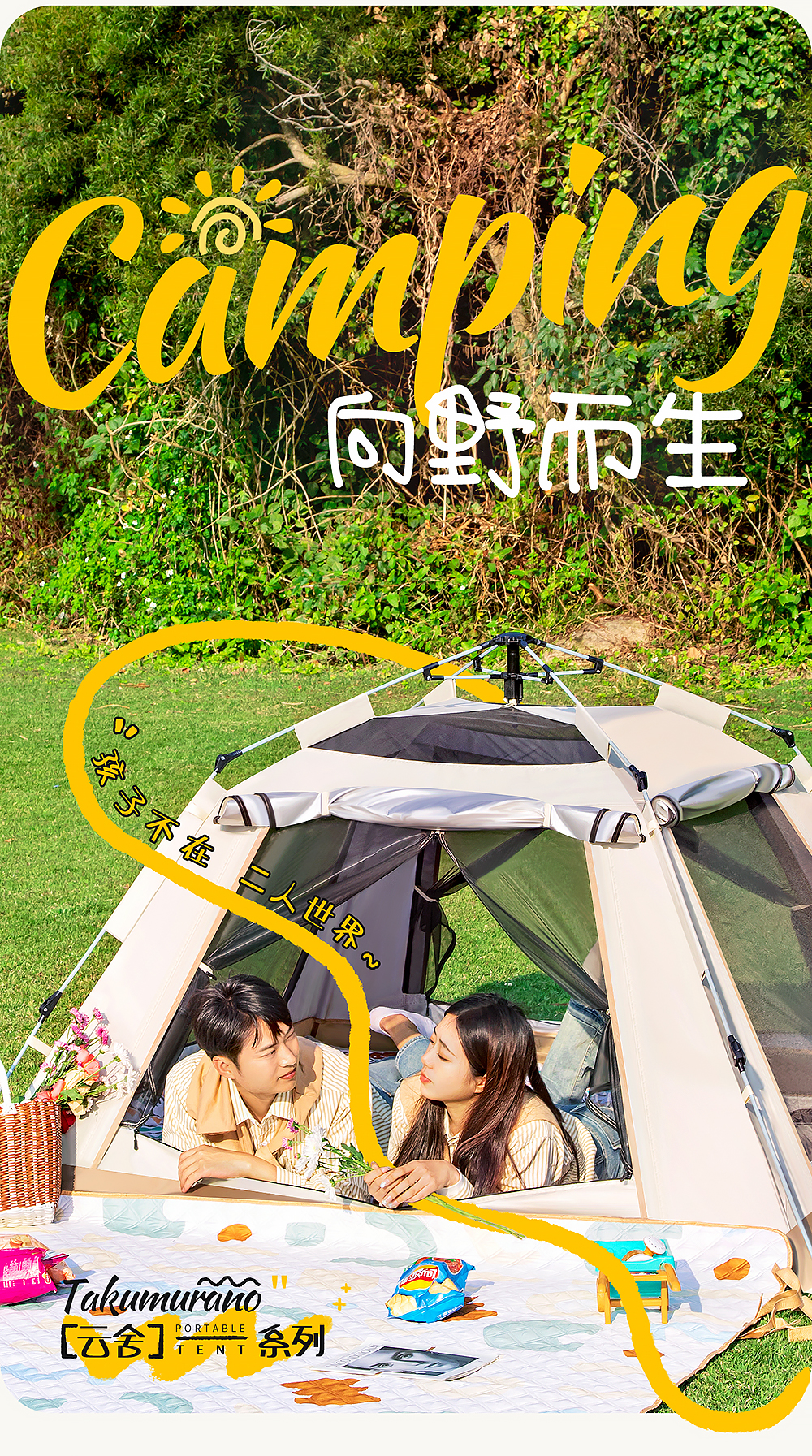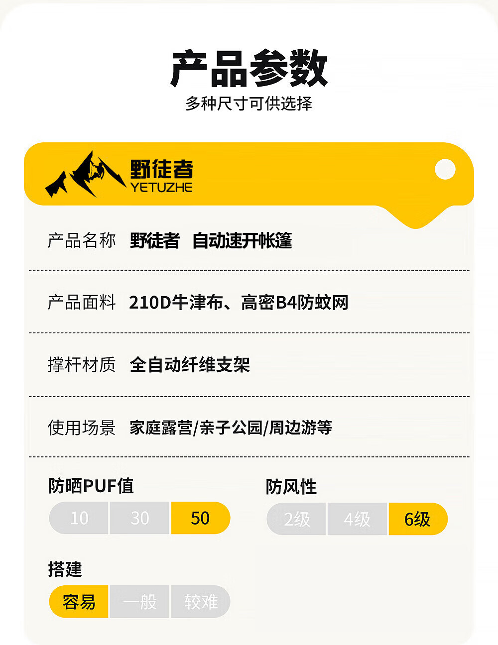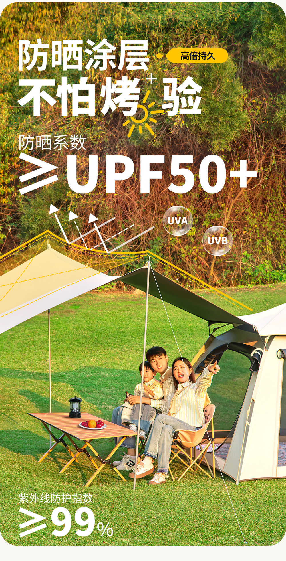 快速搭建功能 采用全自动速开设计,帐篷和天幕均可轻松一拉即开,省时省力 适合需要频繁搭建拆卸的露营场景 空间配置 防潮垫规格为4-6人用铝膜防潮垫,提供充足的地面保护 3-5人帐篷容量适合中小型团队出行 落地大窗和防蚊纱窗设计提升通风性和实用性