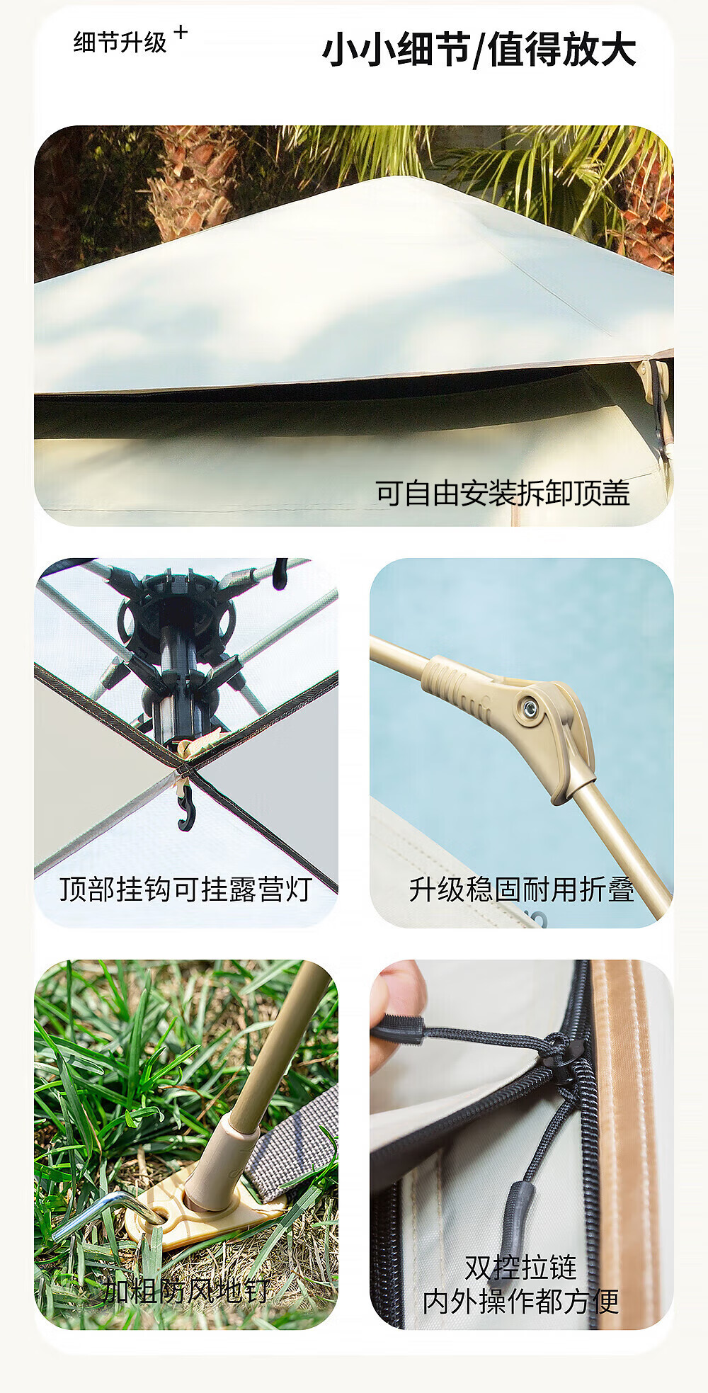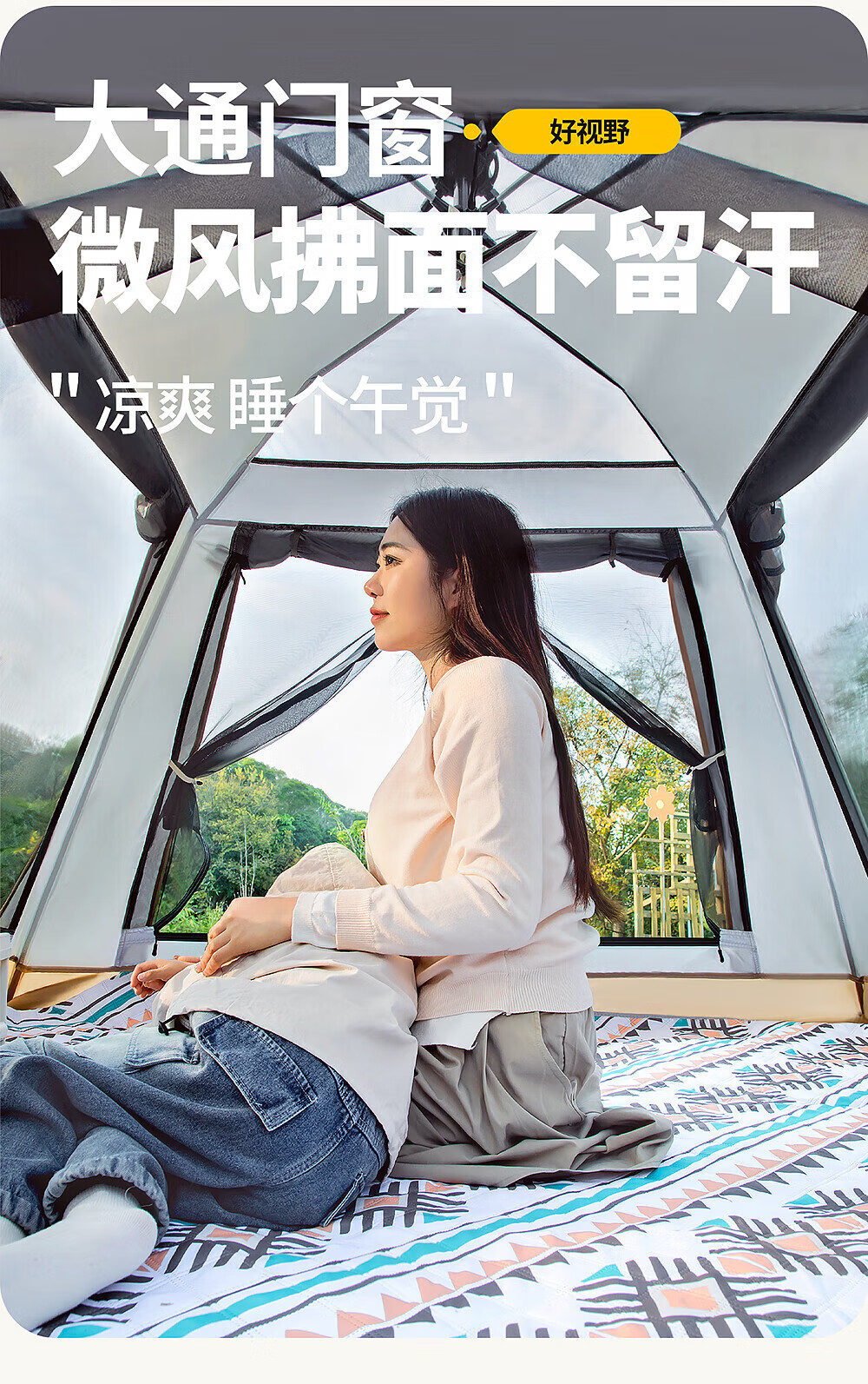 不错不错,这个空间大,面料可以,使用方便, 防水效果:看着不错 适用场景:露营 容纳人数:4人,2米x2米 透气效果:可以的,纱网多 展开类型:便携式,方便快捷 便携性能:非常好,一下就展开了,方便